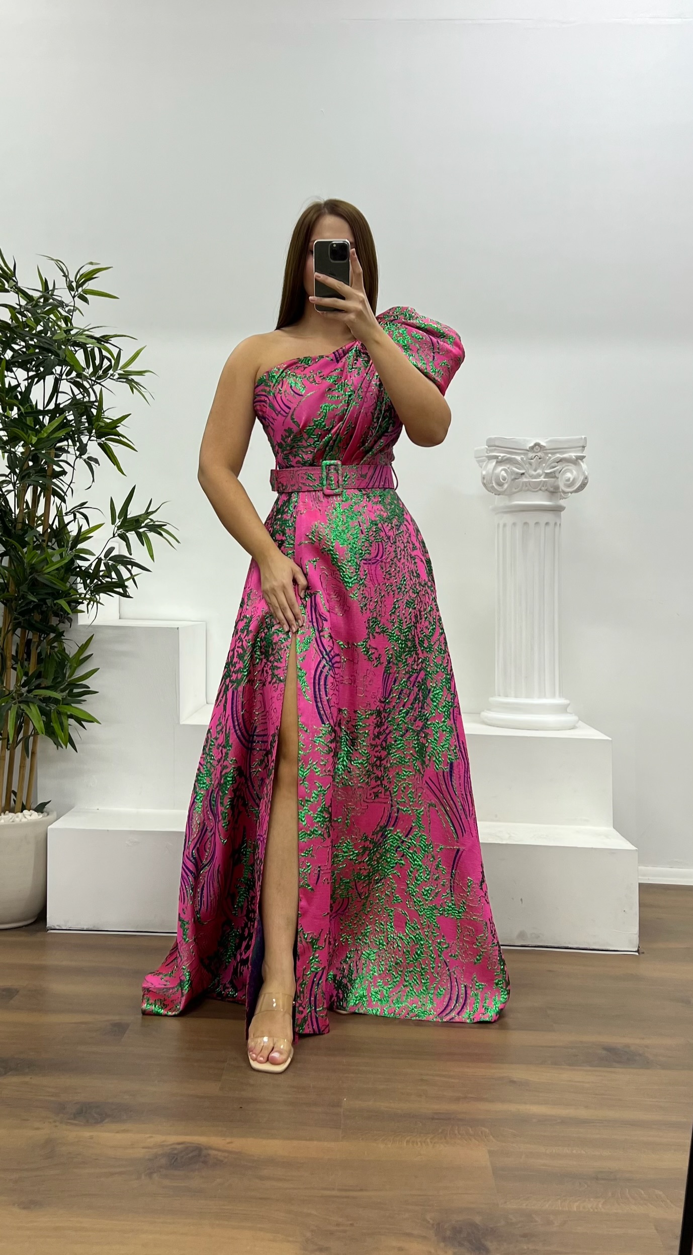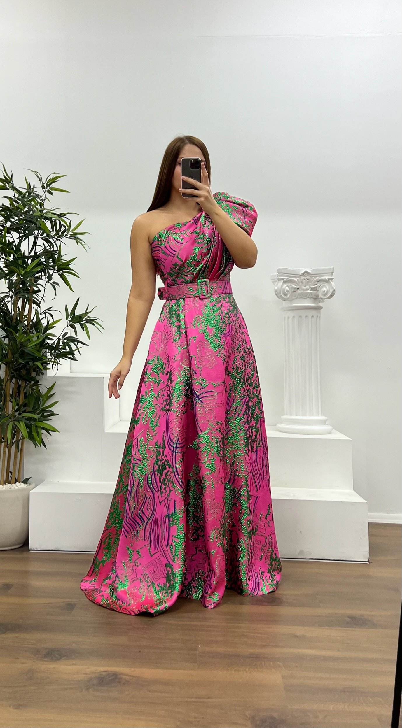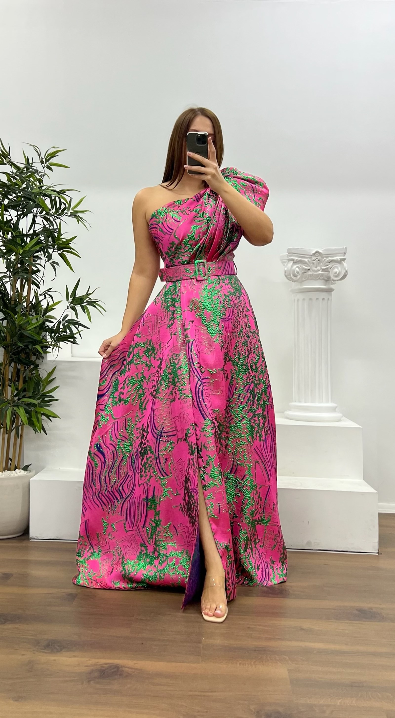 Fuşya Tek Omuz Desenli Büyük Beden Abiye Elbise