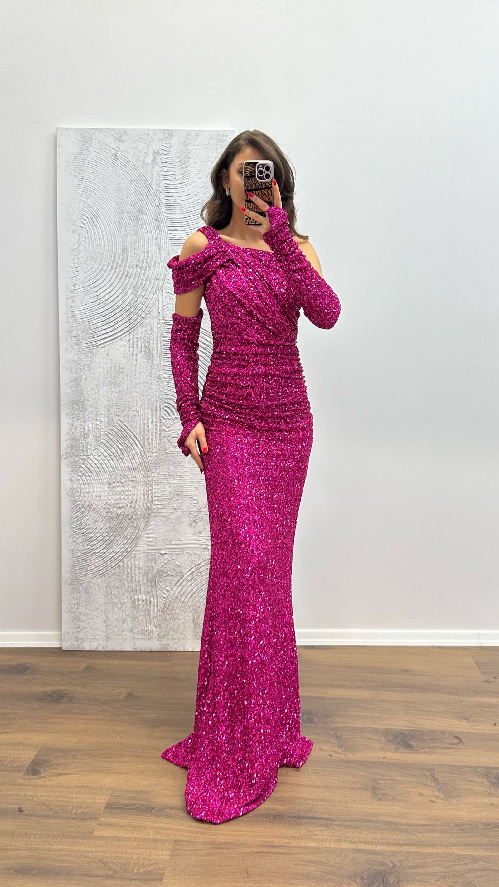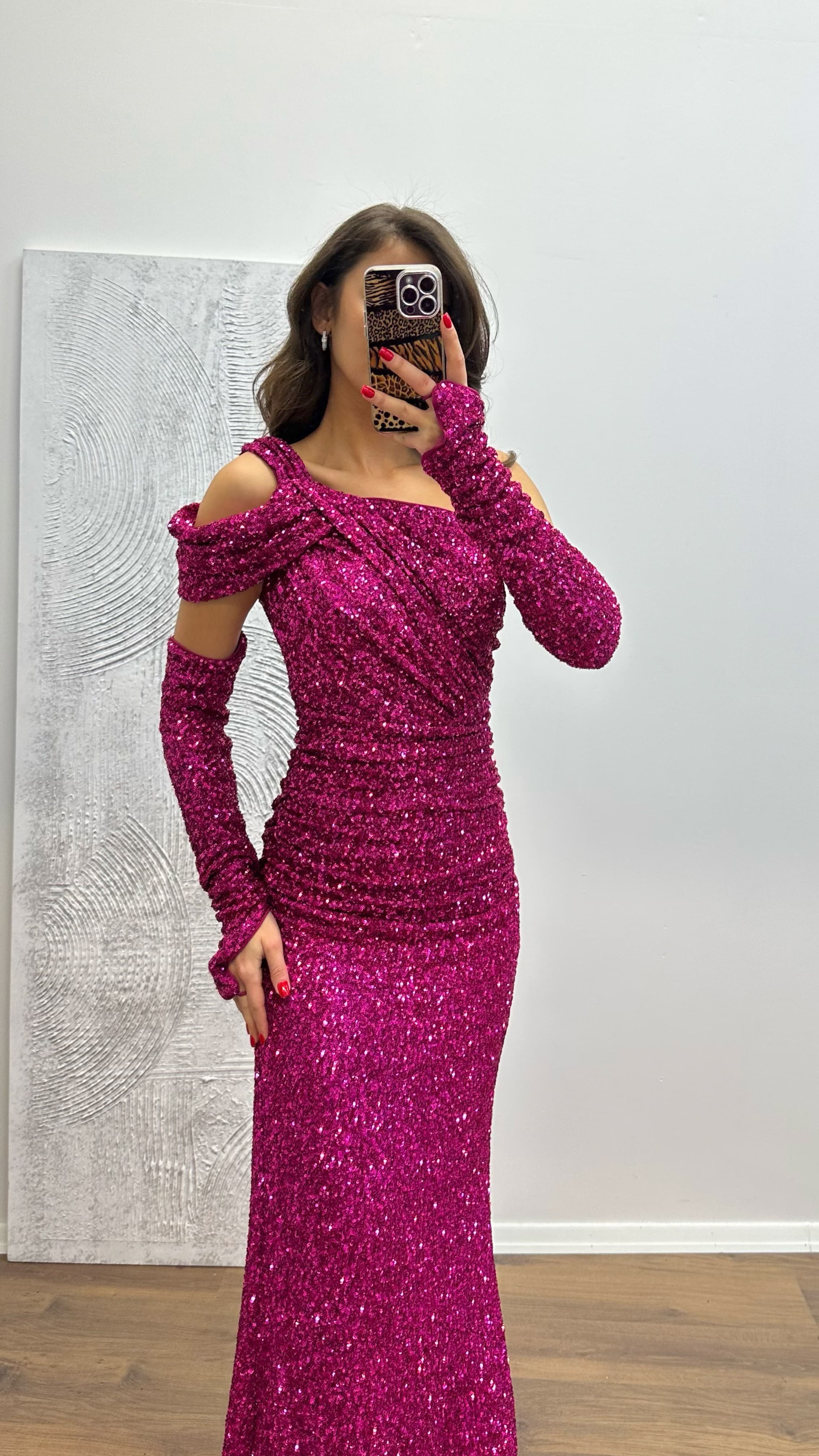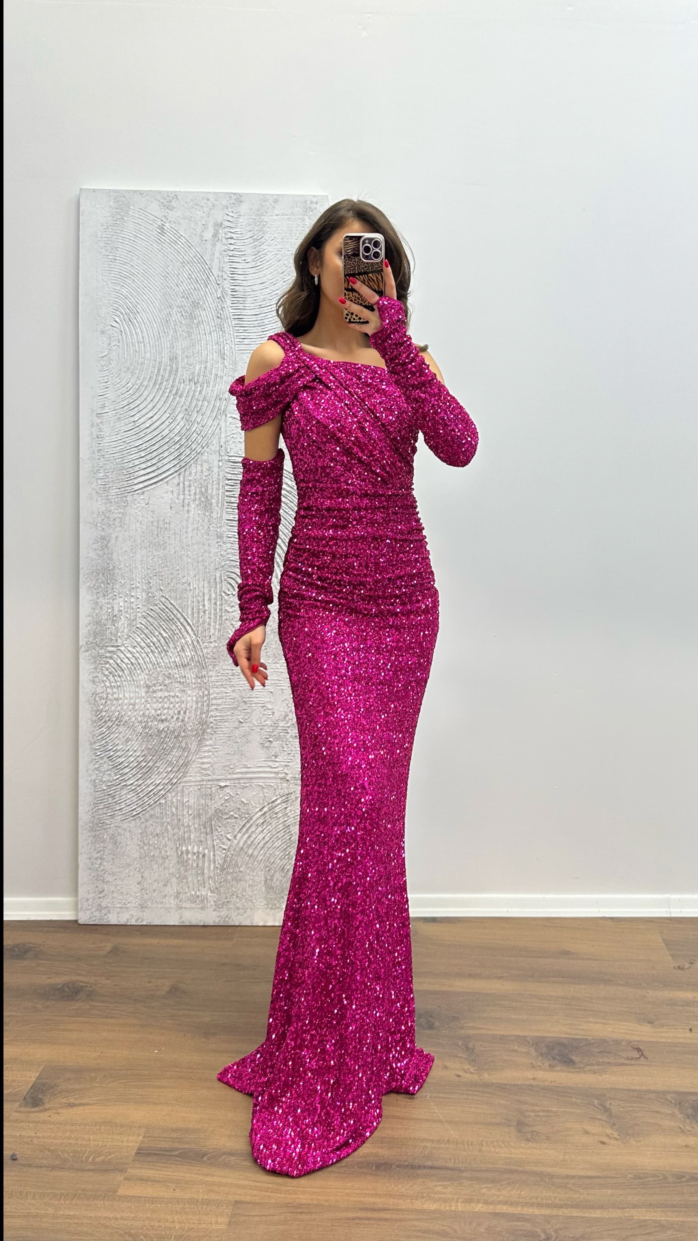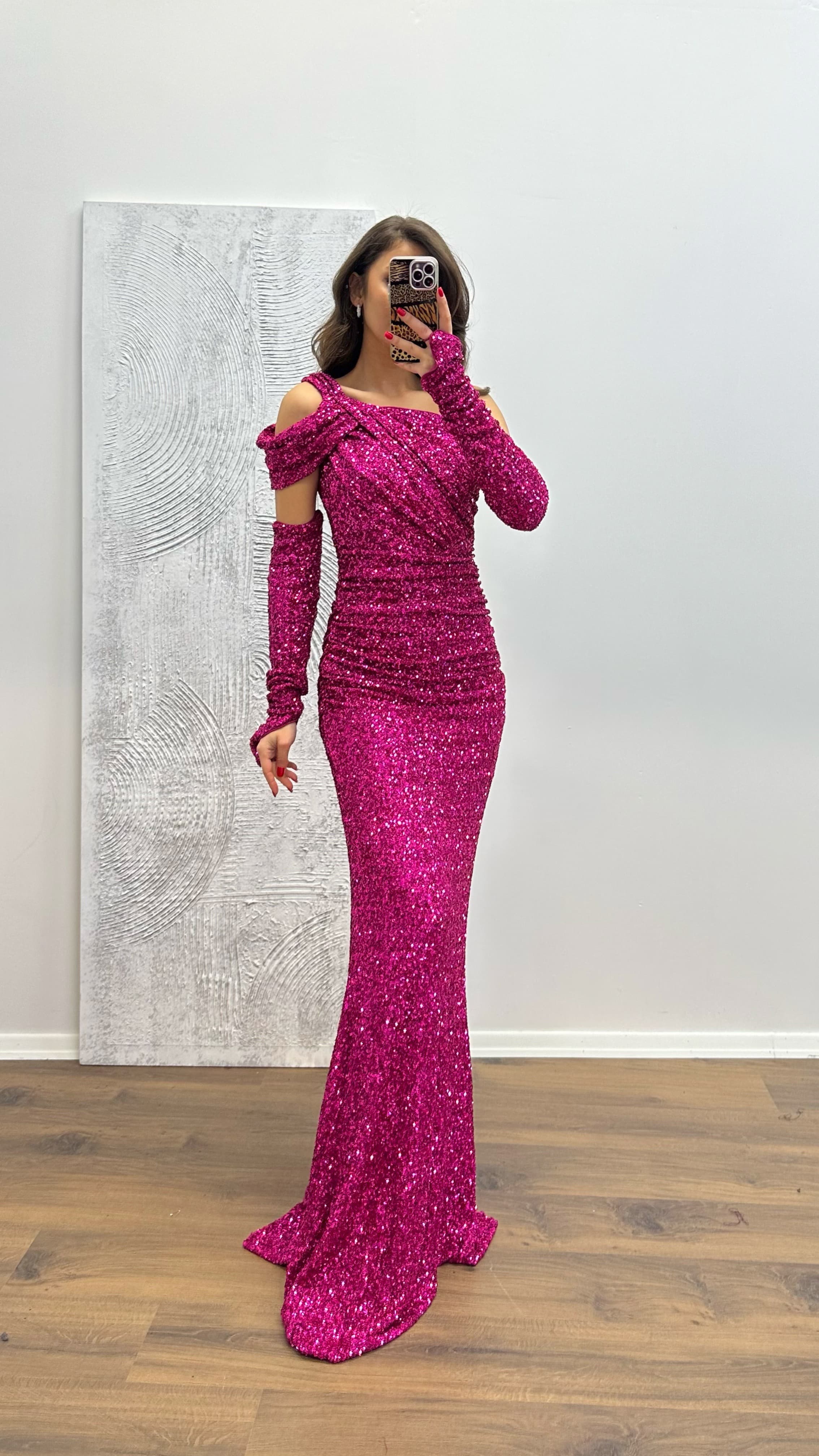 Ürün 36-44 bedene kadar uyumlu, göğüs pedli, astarlı, arka kapama fermuar, eldiven detay abiye olarak tasarlanmıştır.
