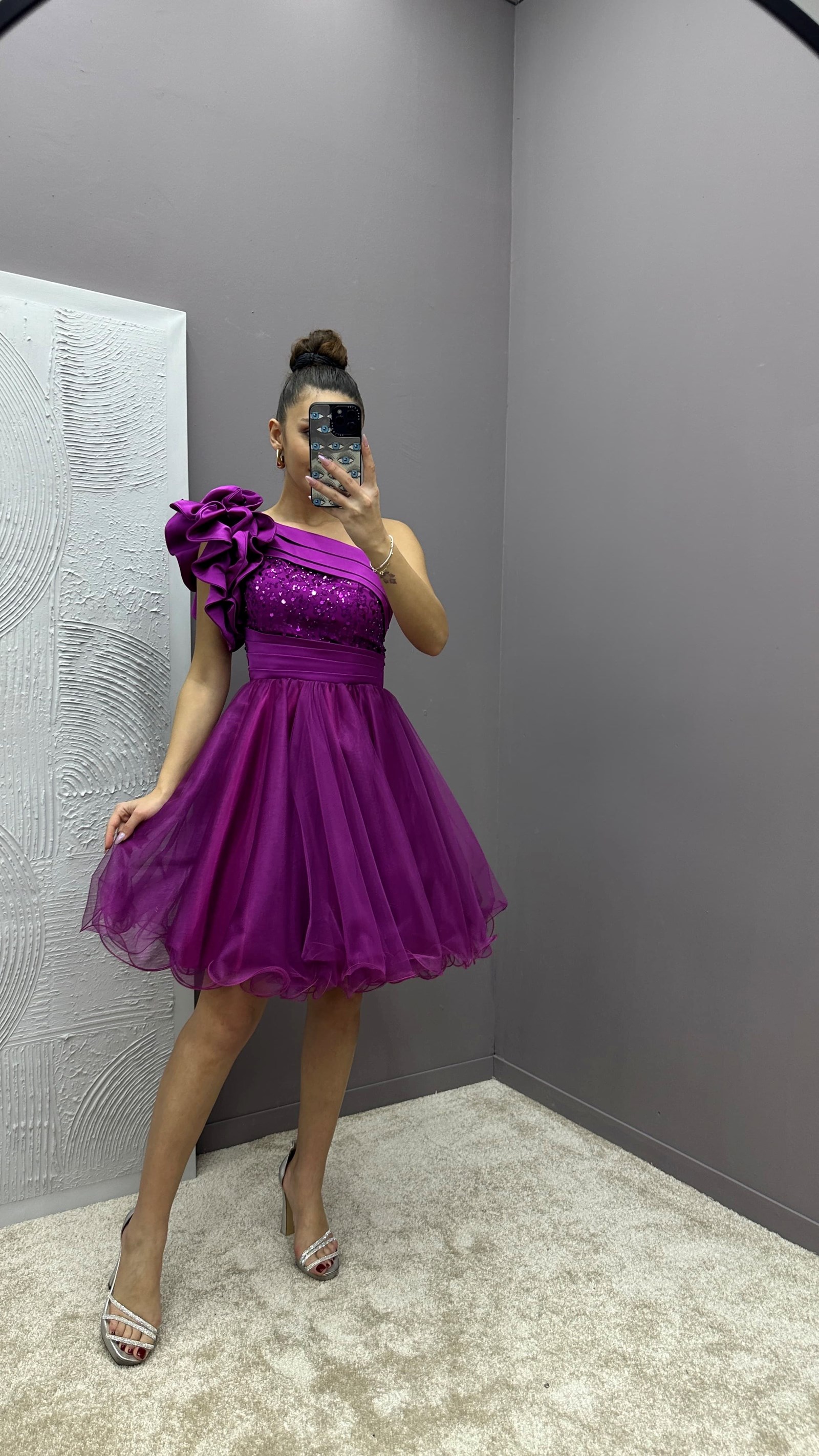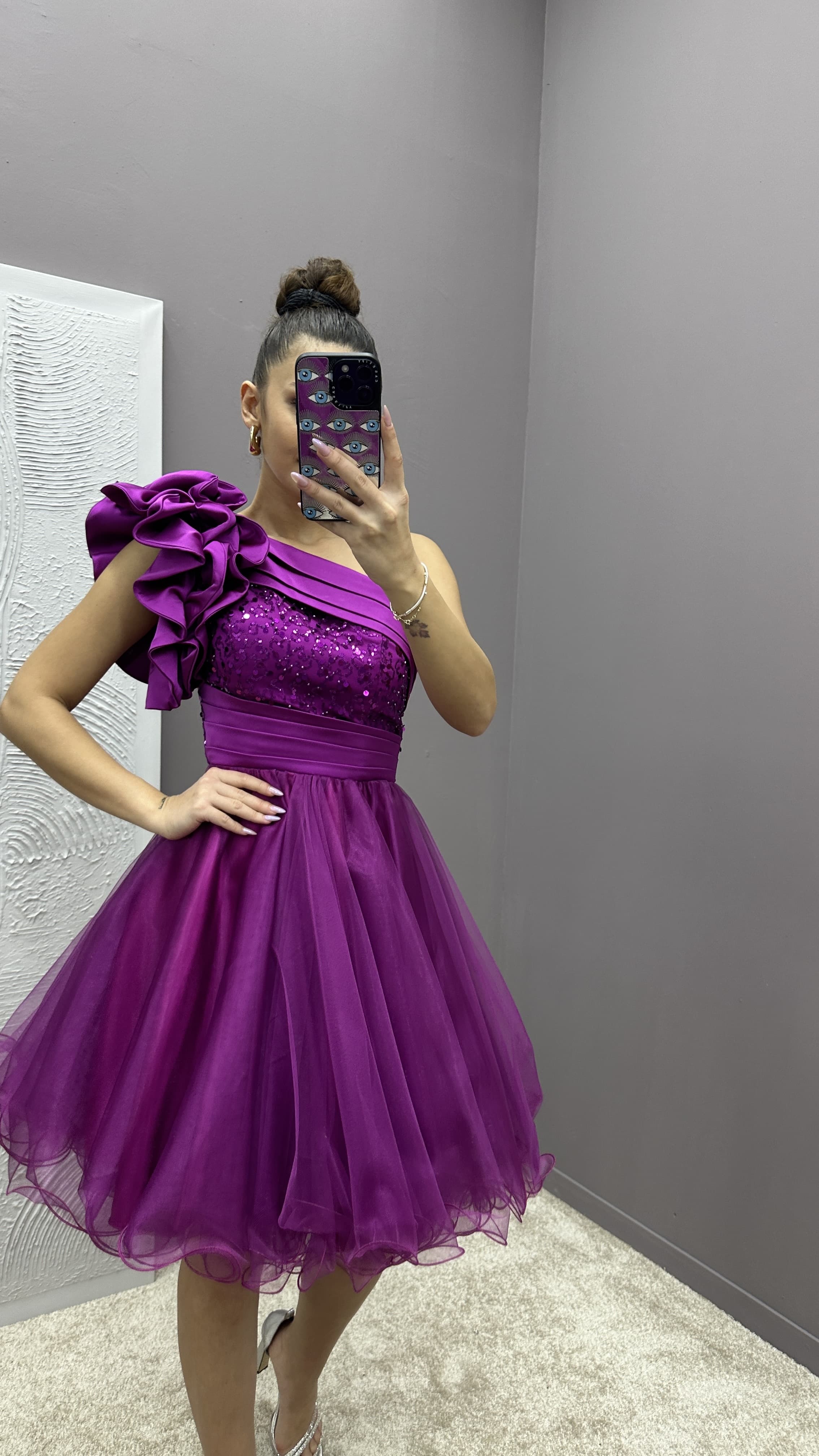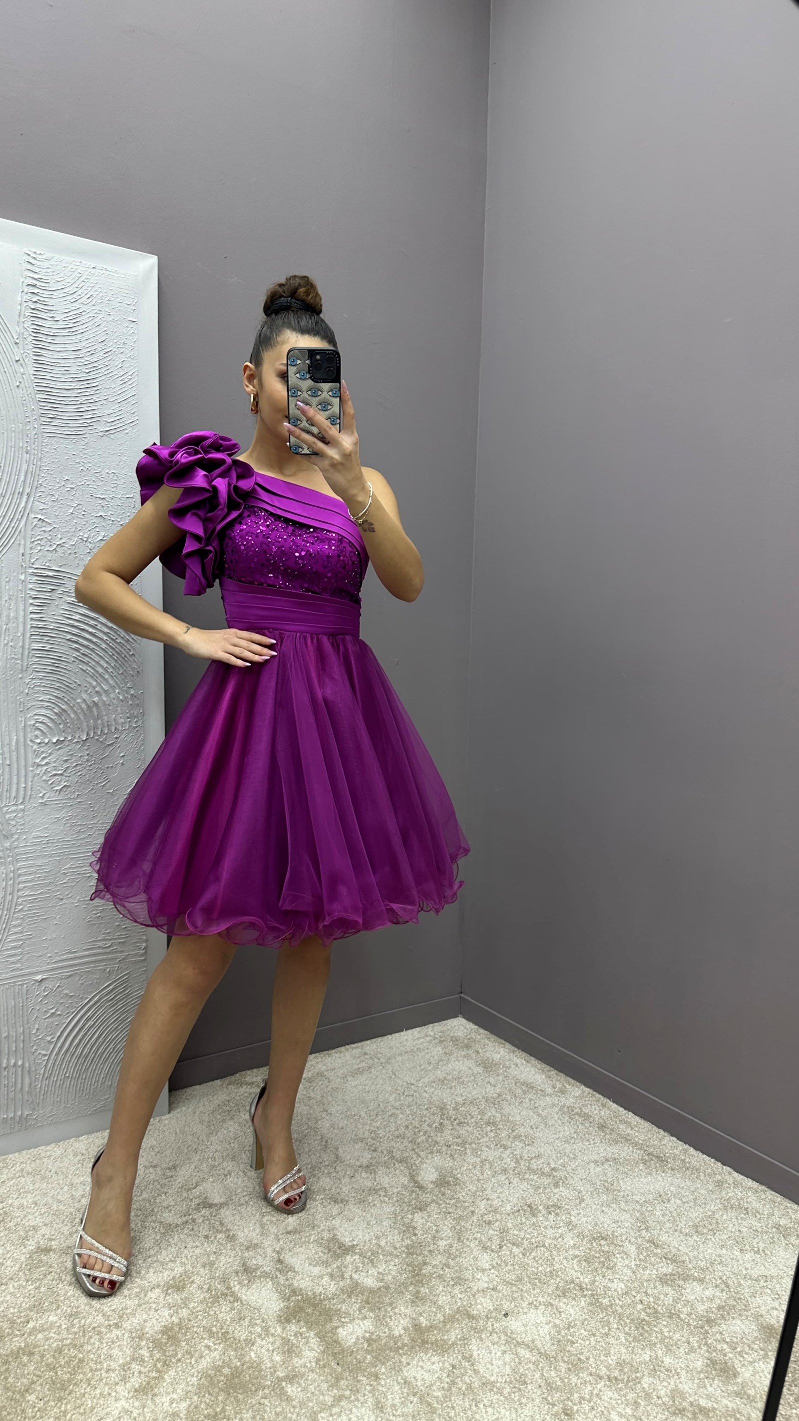 • Fuşya Tek Omuz Volan Detay Tasarım Tül Elbise