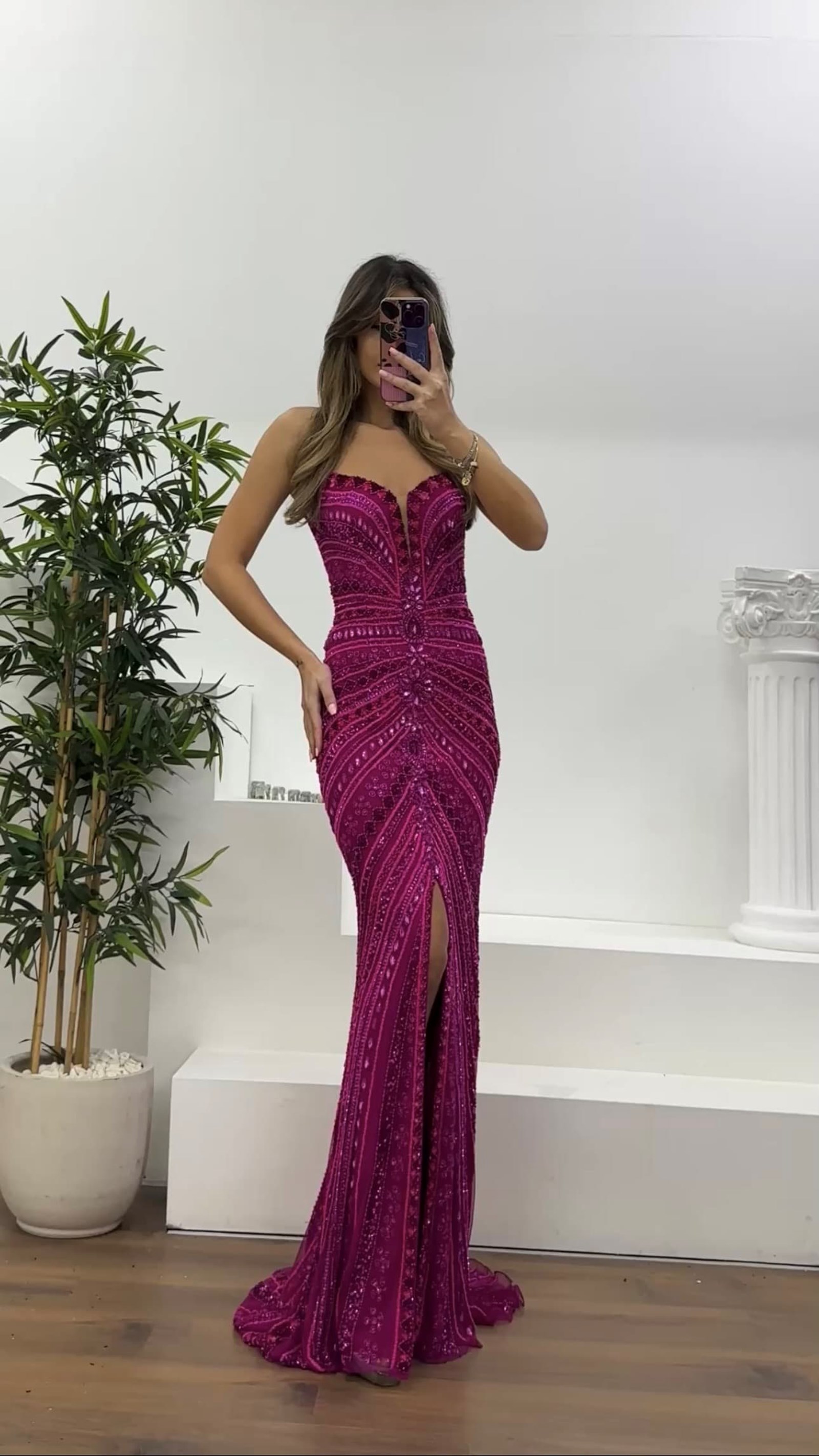 5 DeğerlendirmeFuşya Uzun Kuyruk Detaylı  Geometrik Taş İşlemeli Straplez  Abiye Elbise Ürün Yorumları