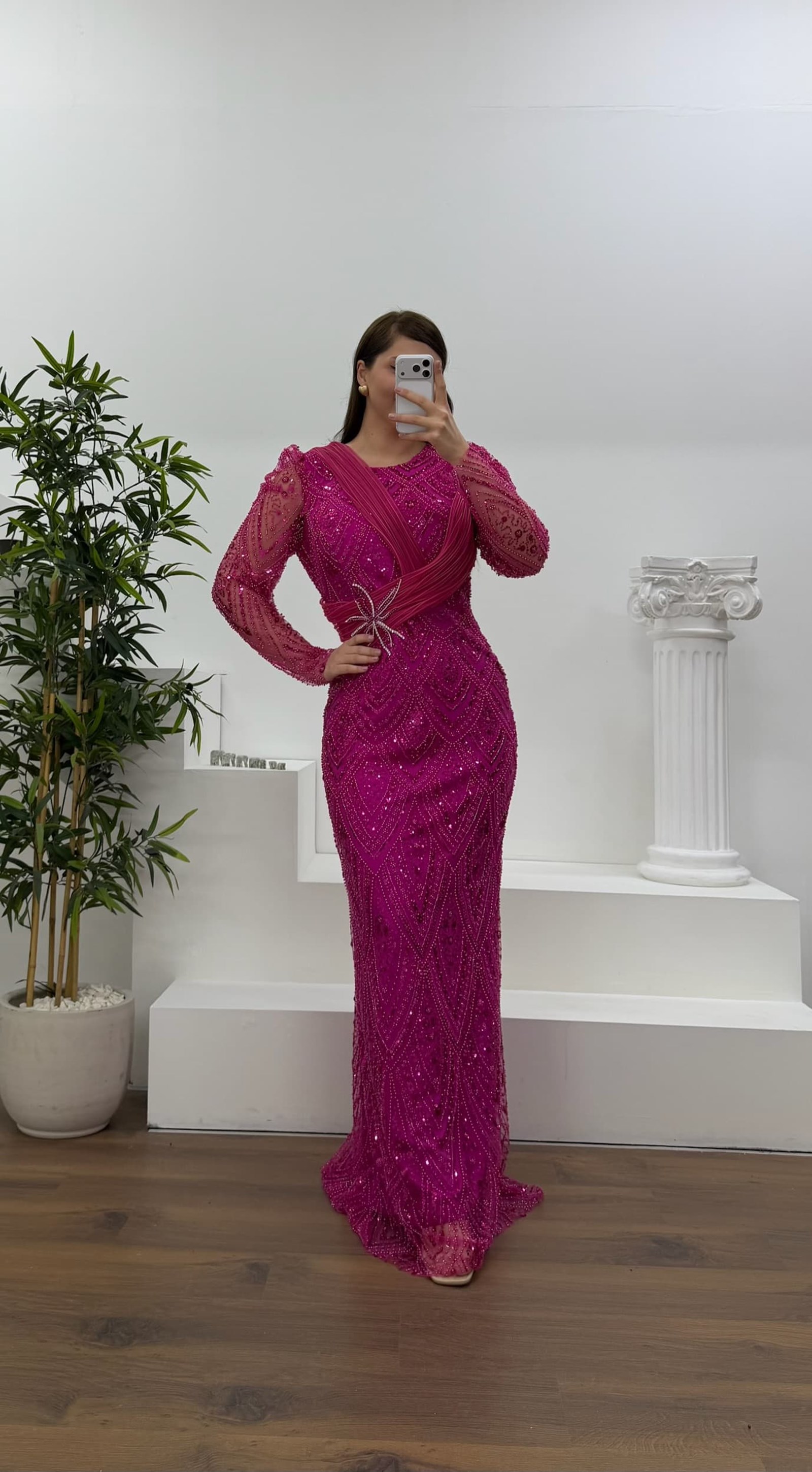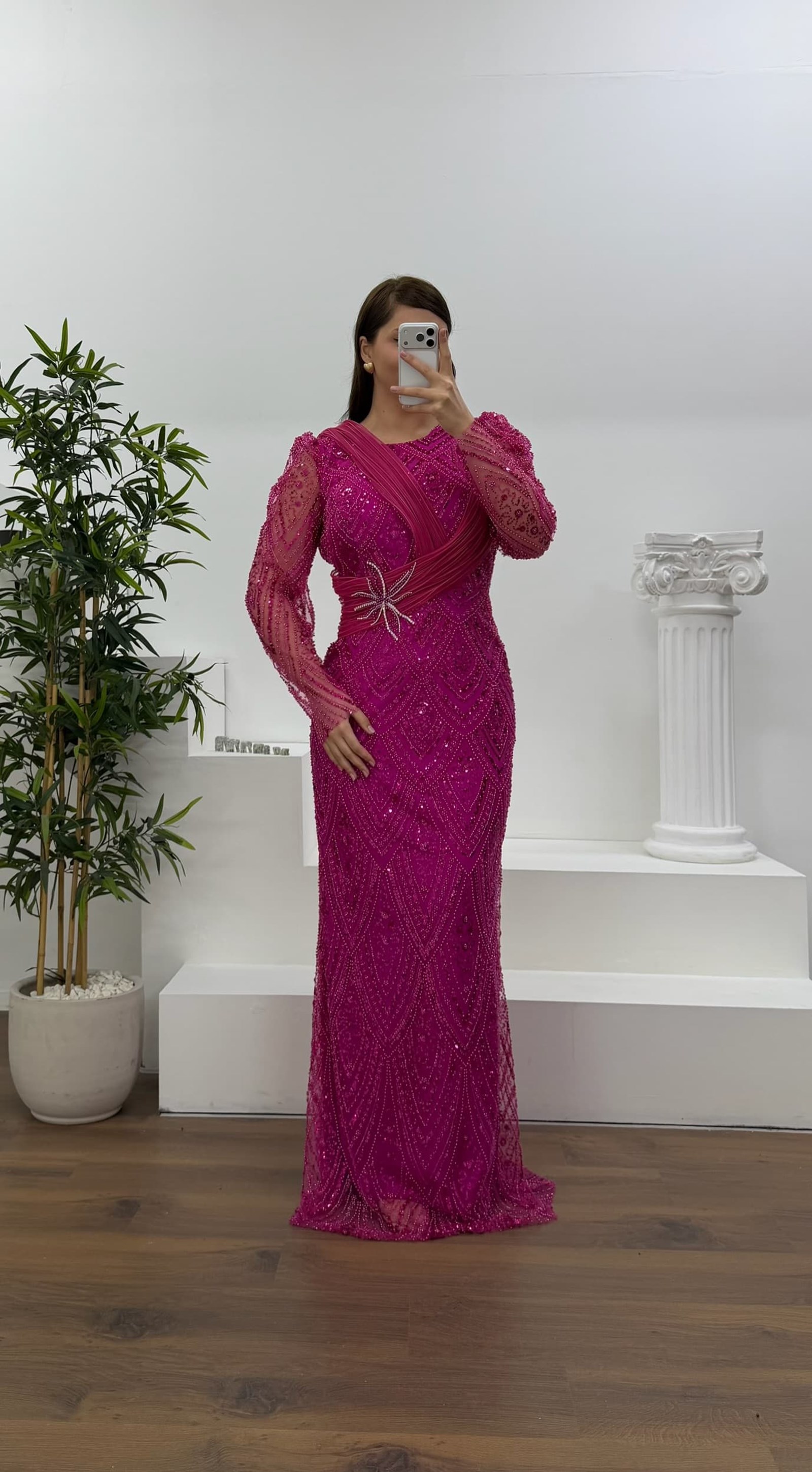 • Fuşya Yıldız Boncuk İşlemeli Kolları Tül  Detaylı Büyük Beden Abiye Elbise