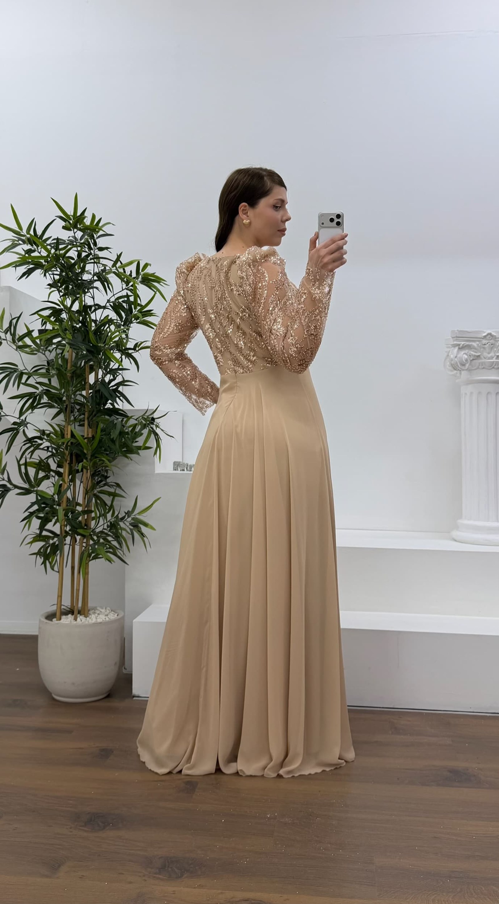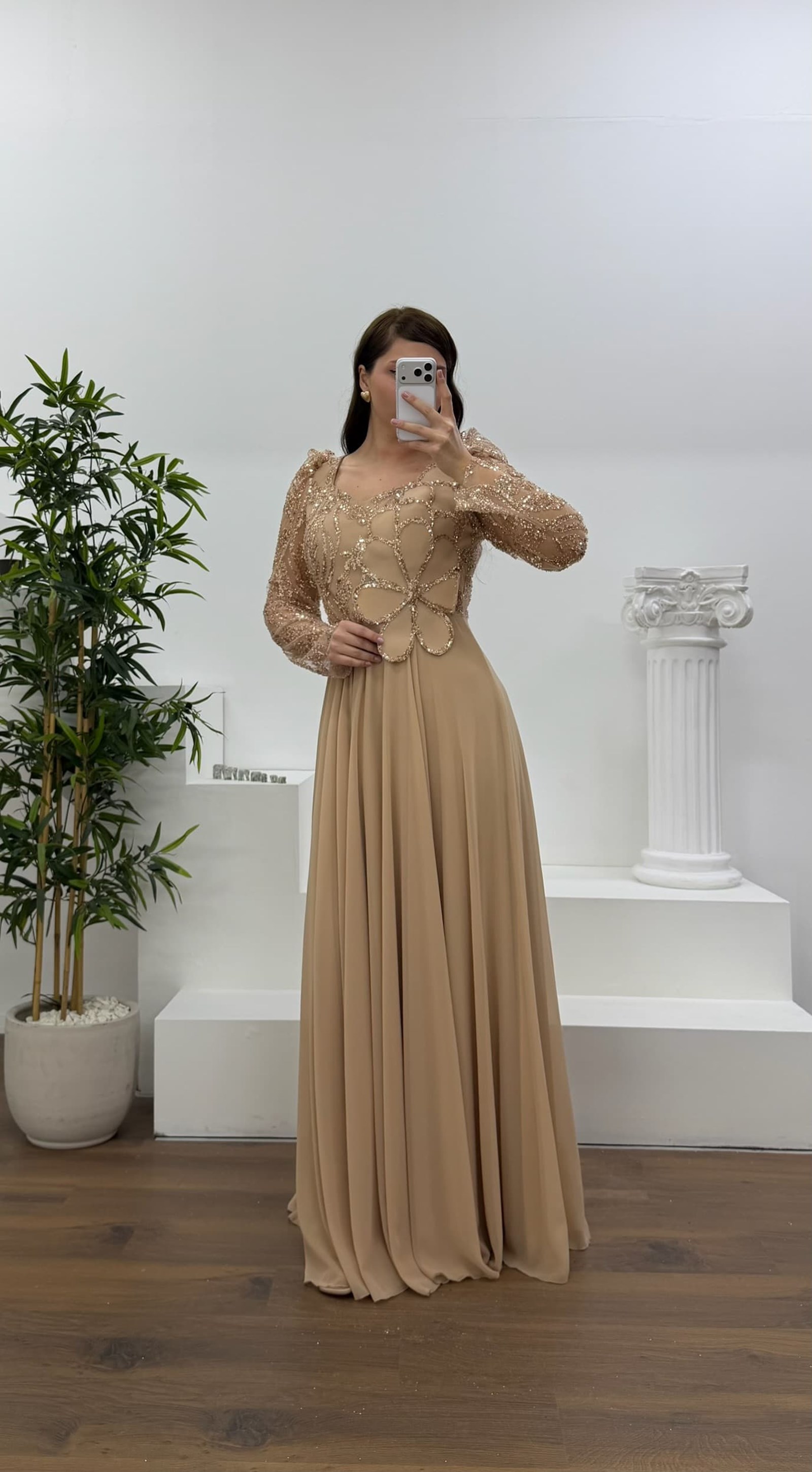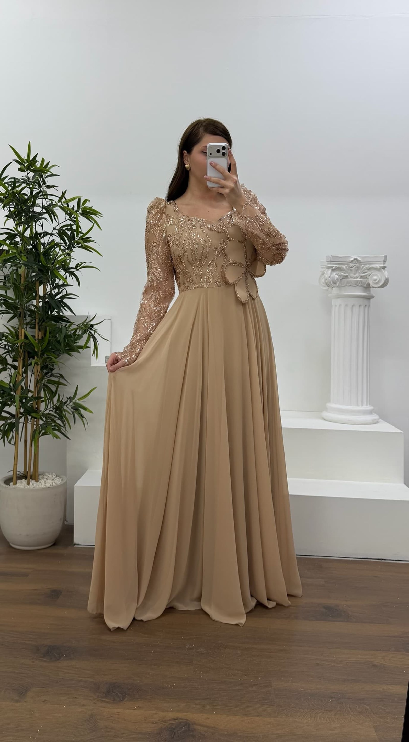 • Ekru Beli Çiçek Detay Şifon  Büyük Beden Abiye Elbise