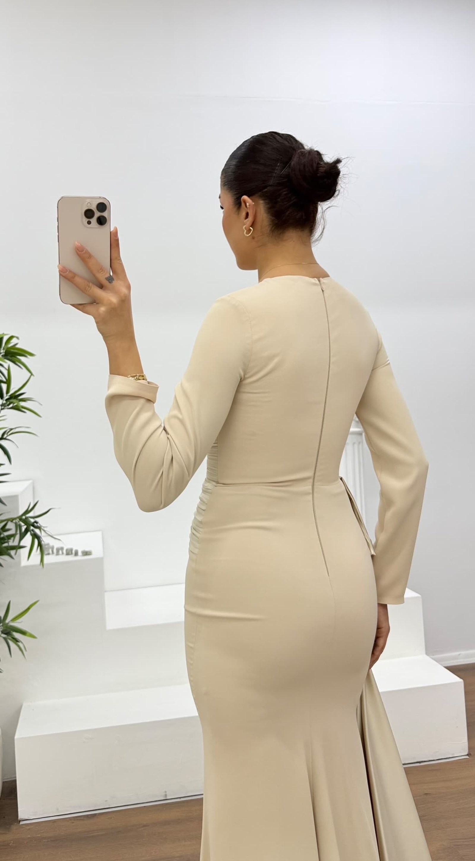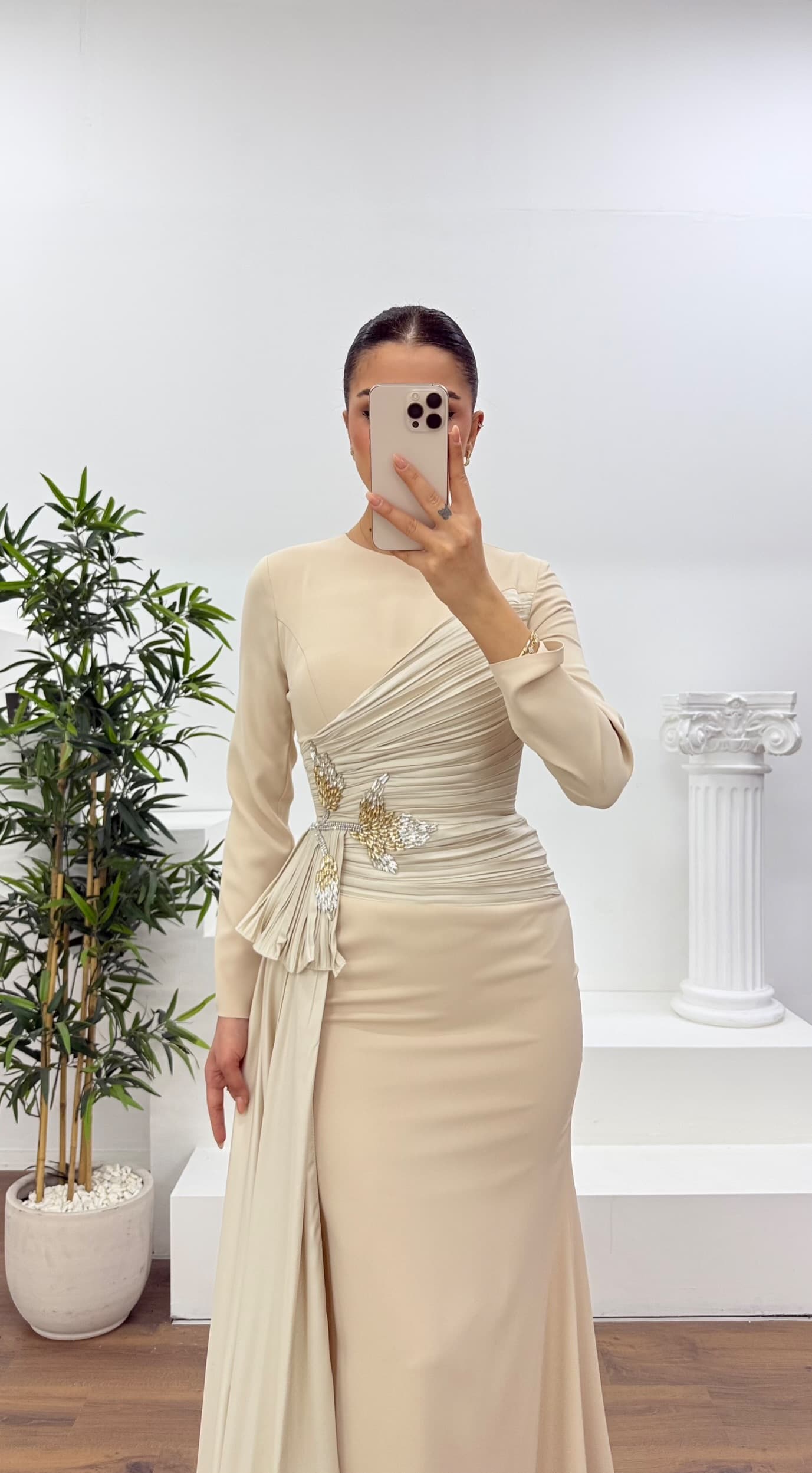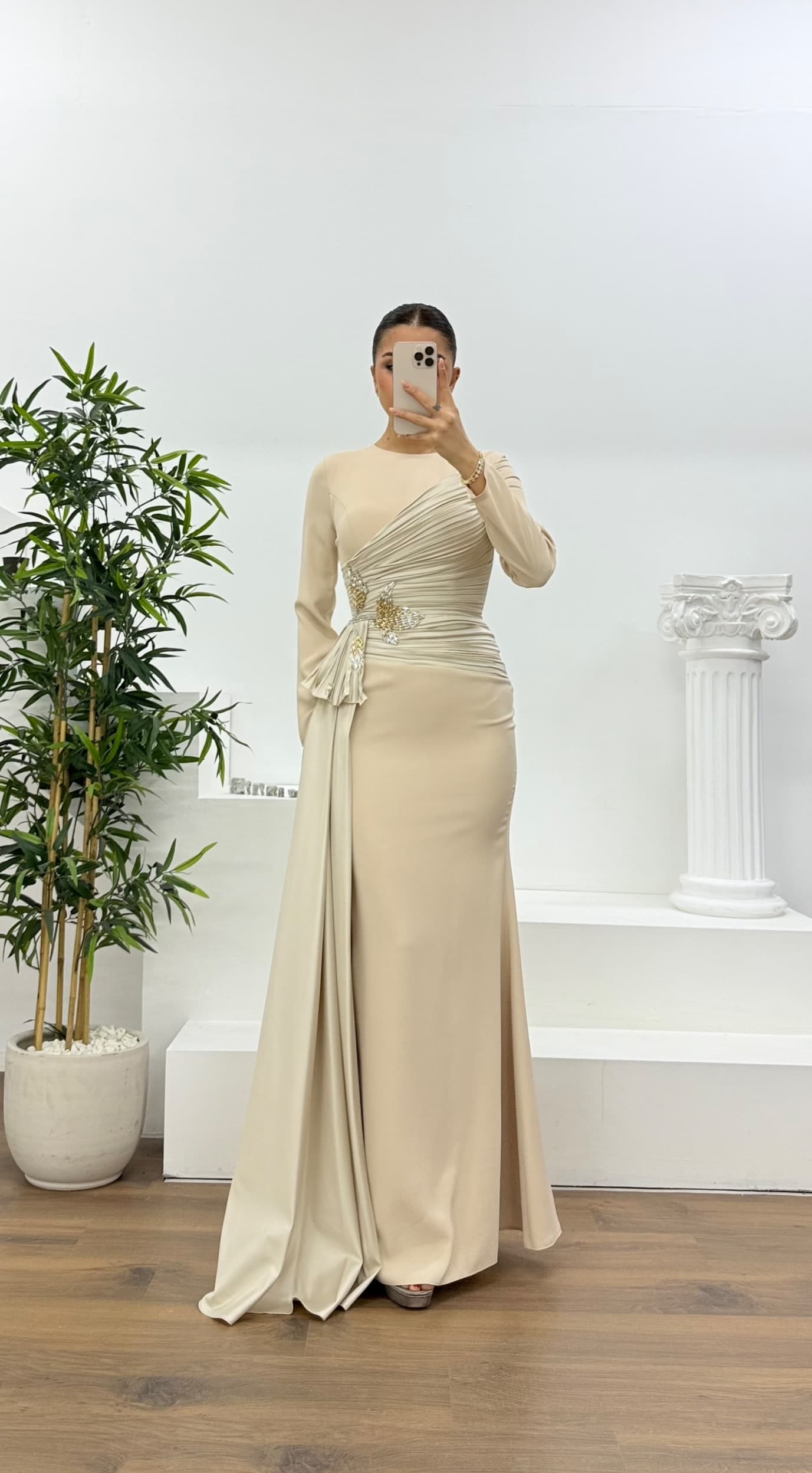 Drapeli ve yaprak motifli tesettür abiye elbise