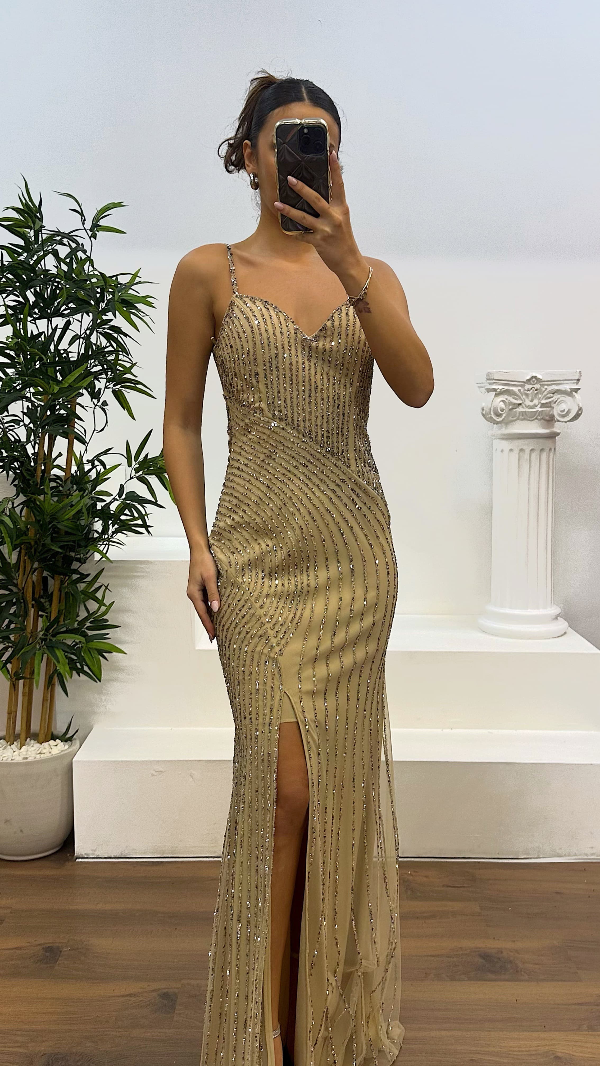Gold İp Askılı İşlemeli Abiye Tasarım Abiye Elbise