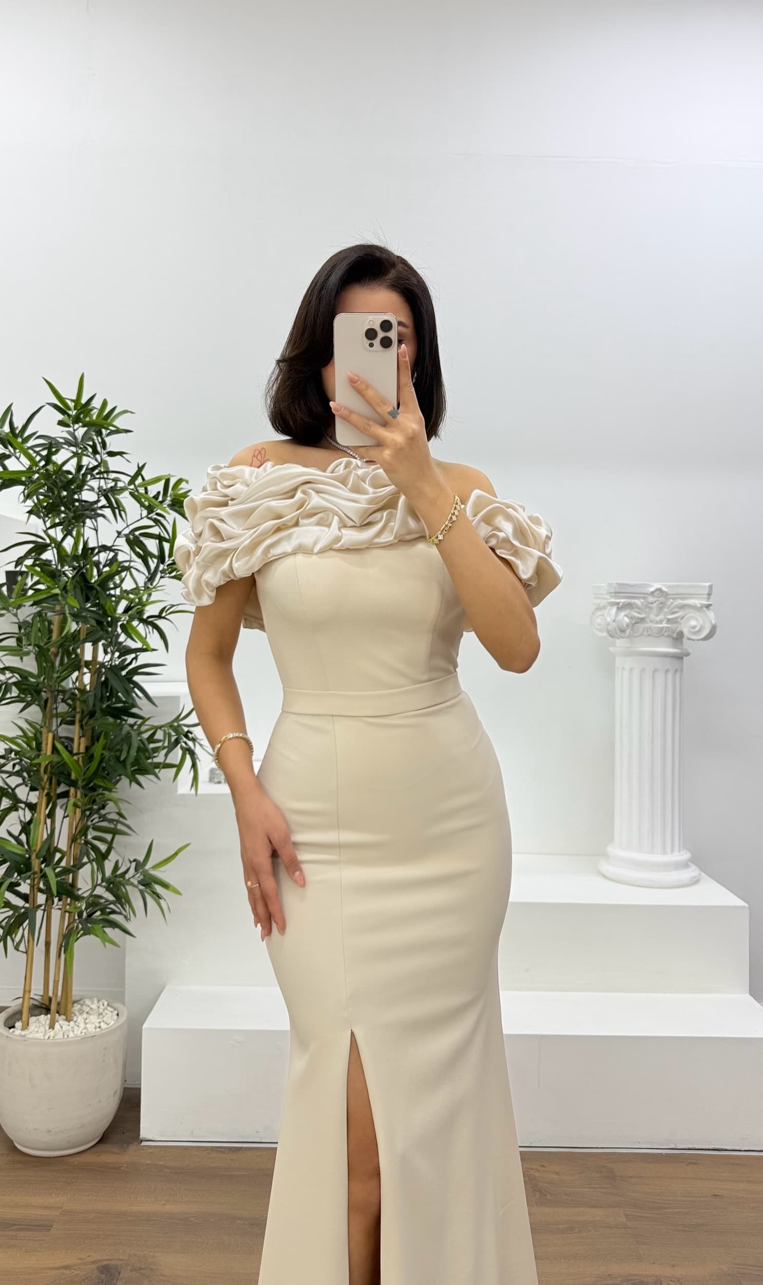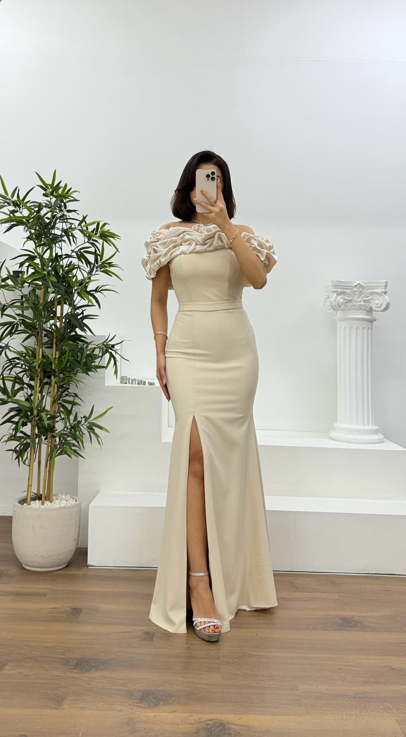 Kayık yaka fırfırlı abiye elbise