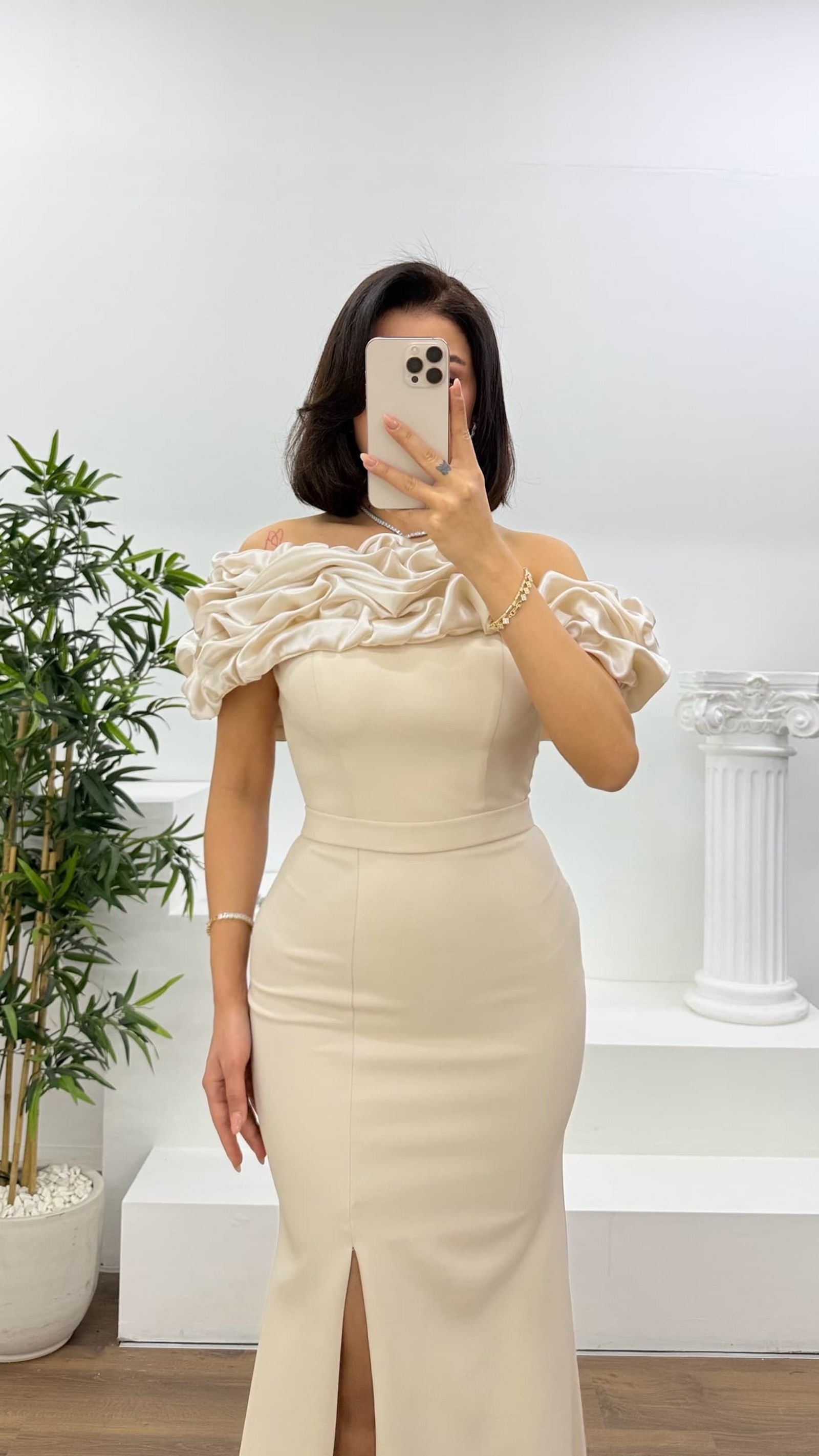 • Gold Kayık Yaka Fırfırlı Abiye Elbise