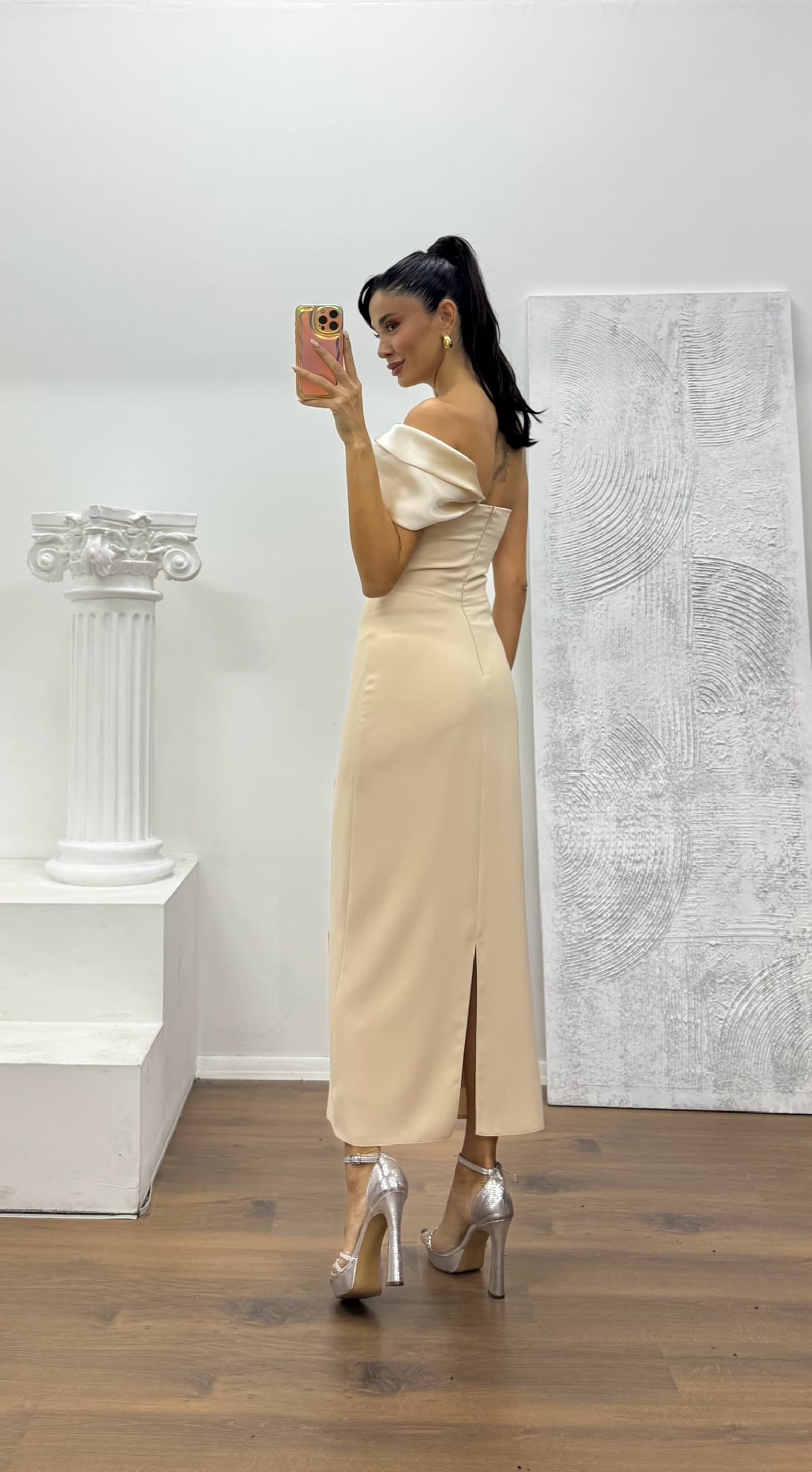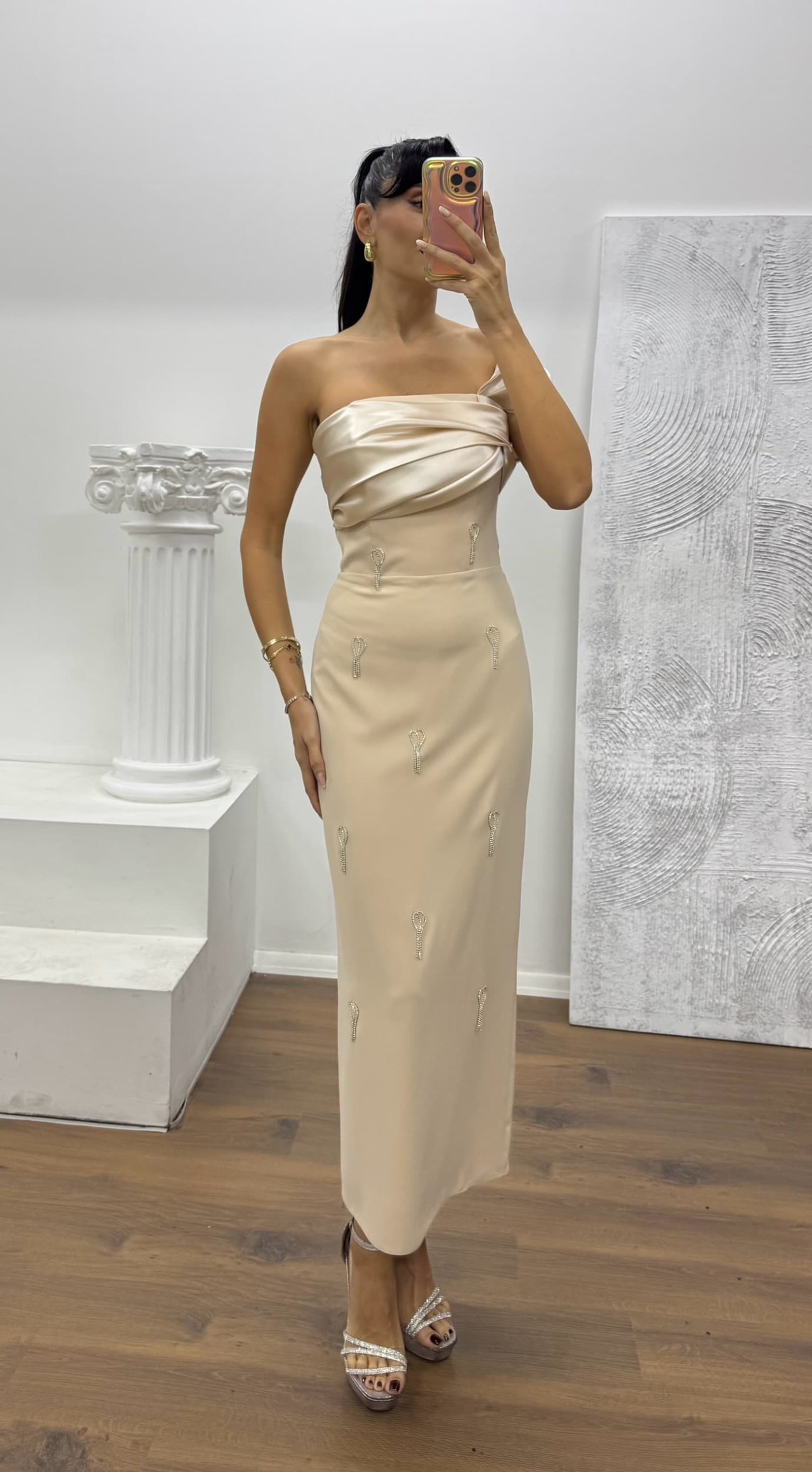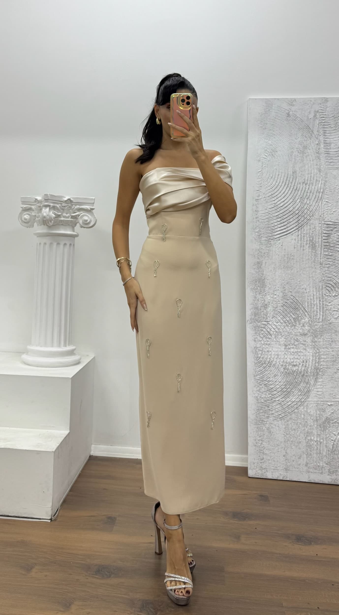 • Gold Midi Boy Taş Detay Abiye Elbise