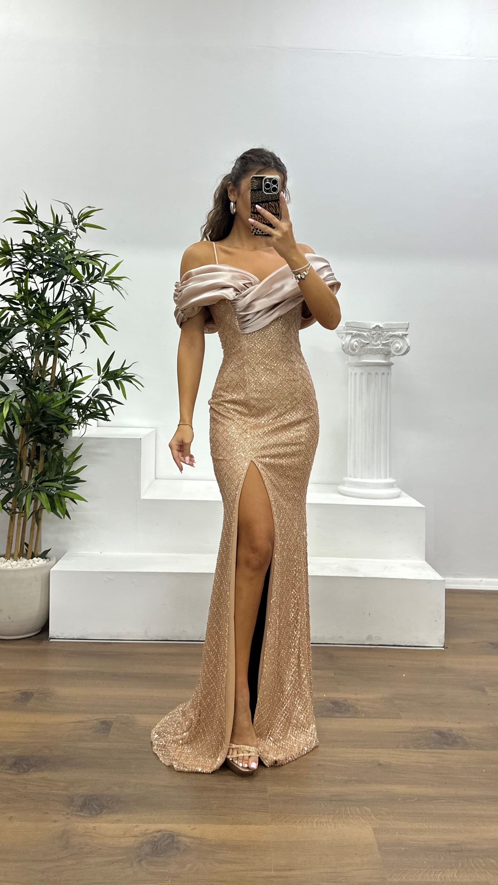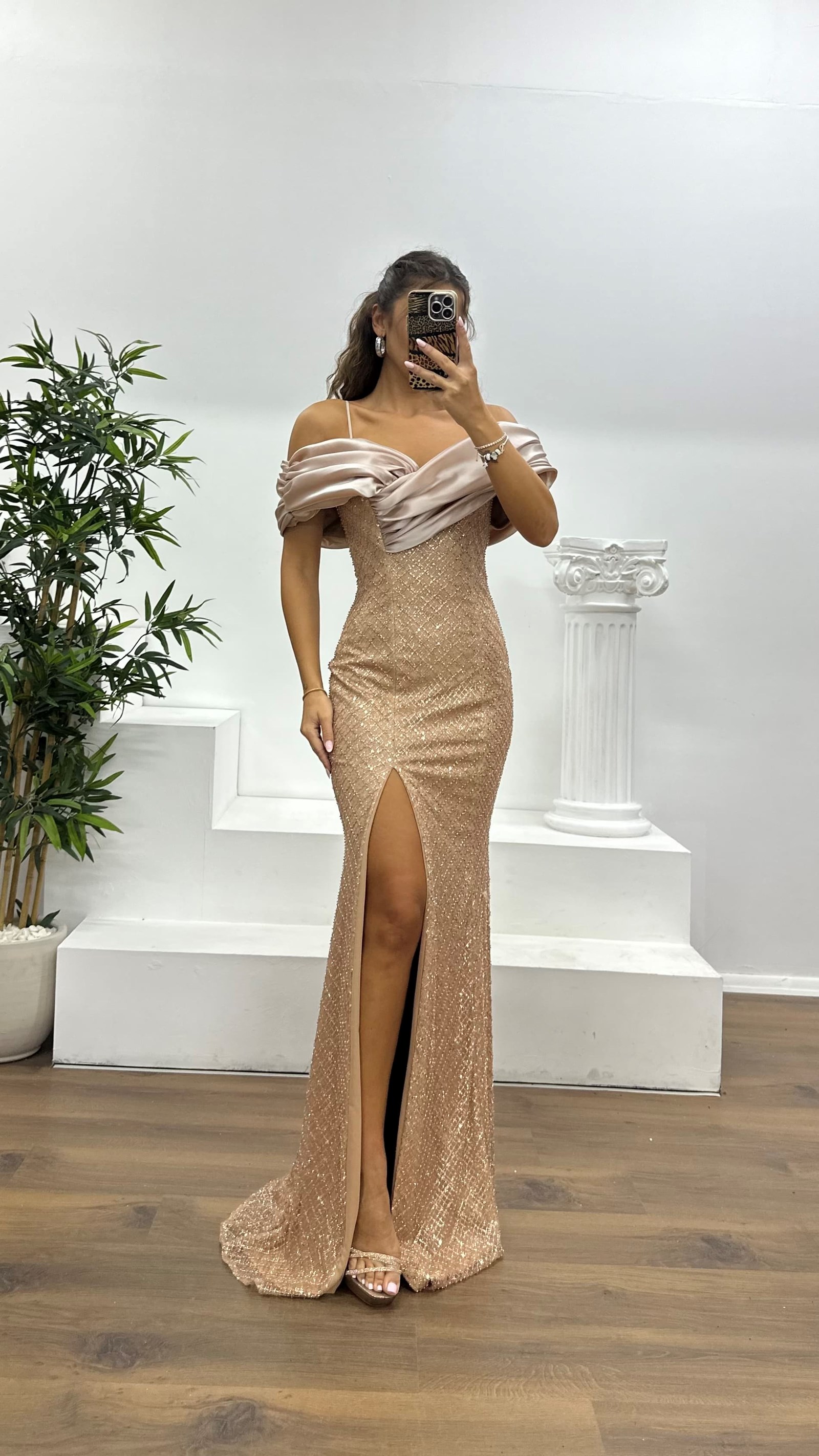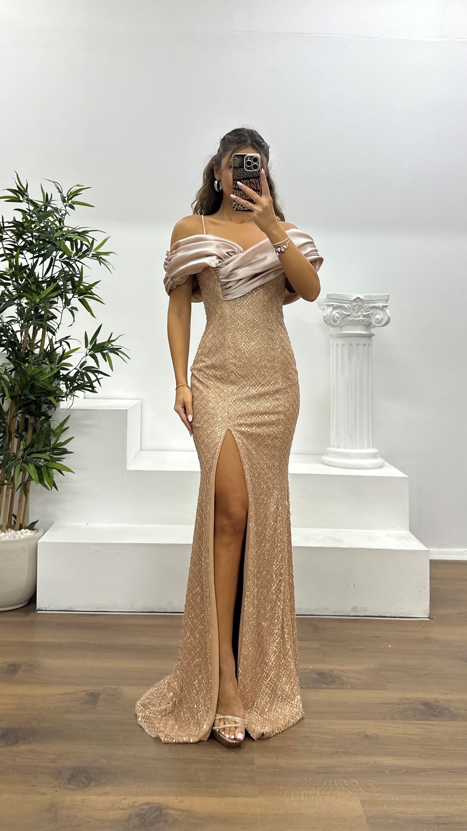 Ürün 36-42 bedene kadar uyumlu, göğüs pedli, astarlı, sırt capraz ip ve fermuar kapamalı, yırtmaçlı, ip askılı, işlemeli abiye olarak tasarlanmıştır.