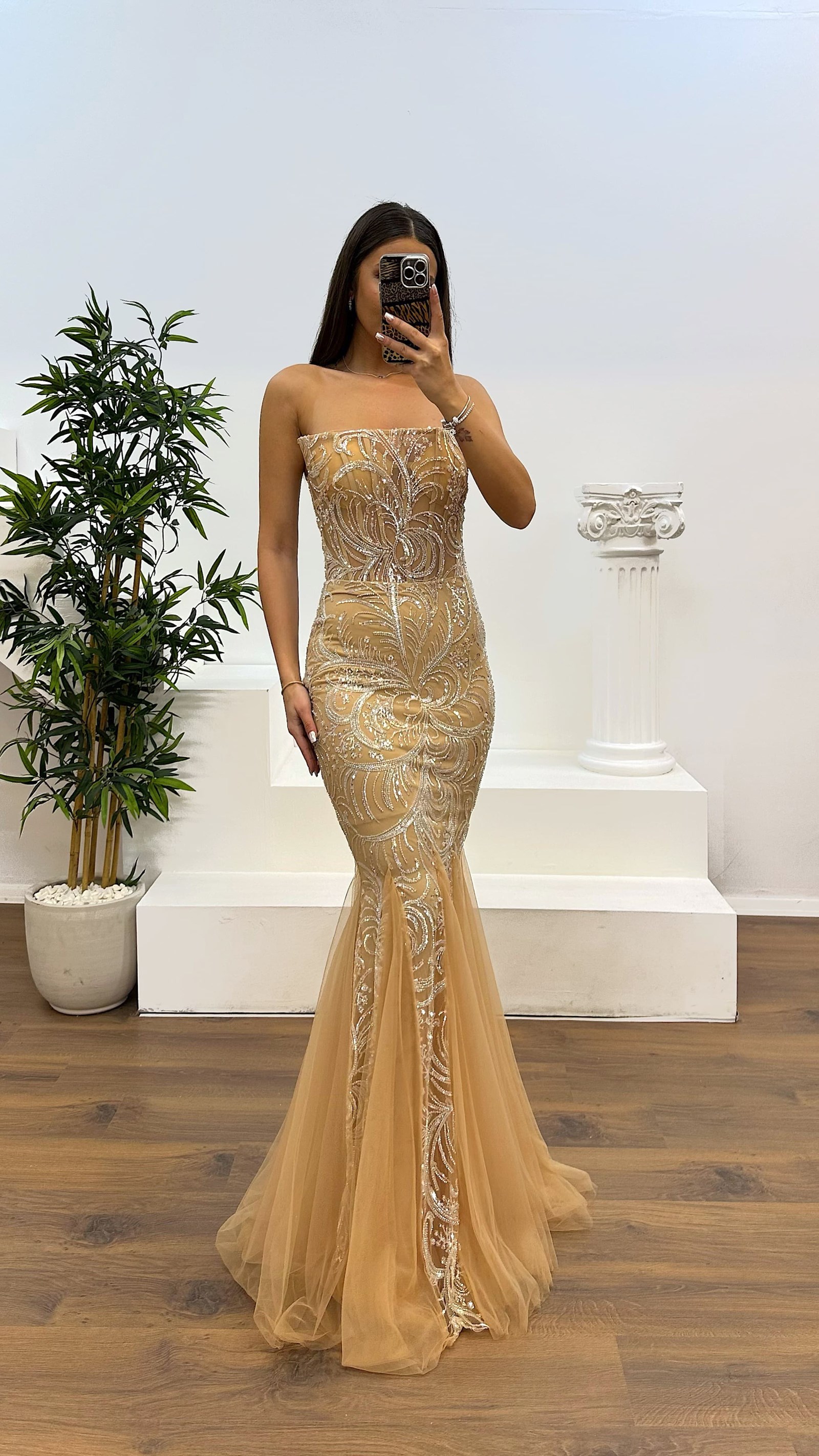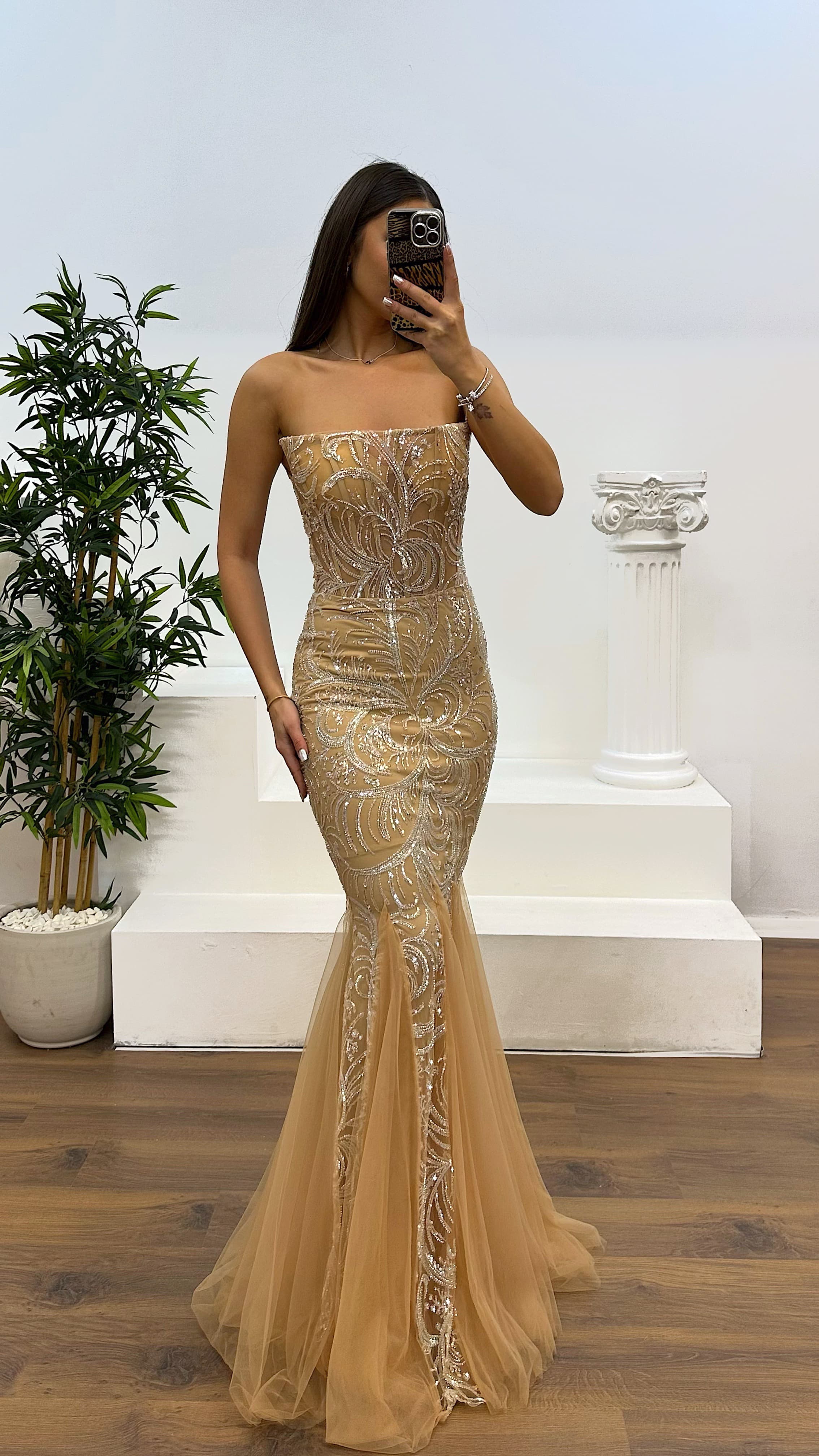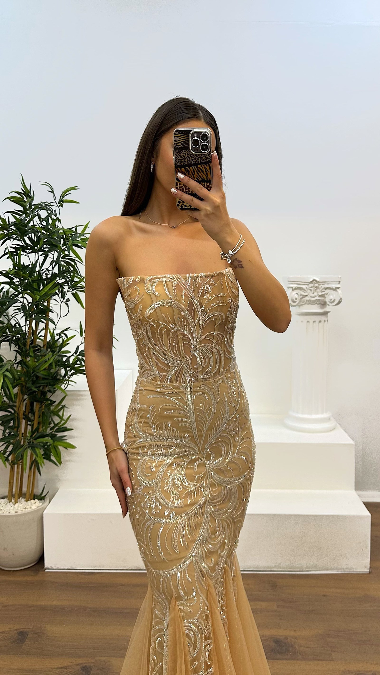 Ürün 36-40 bedene kadar uyumlu, göğüs pedli, astarlı, arka kapama fermuar, işlemeli abiye olarak tasarlanmıştır.