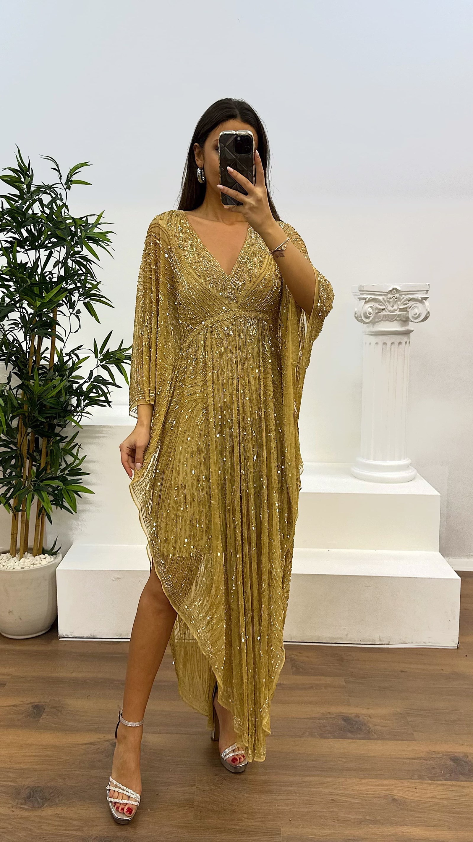 Ürün standart beden, göğüs pedli, astarlı, yarasa kol el işlemeli abiye olarak tasarlanmıştır.
