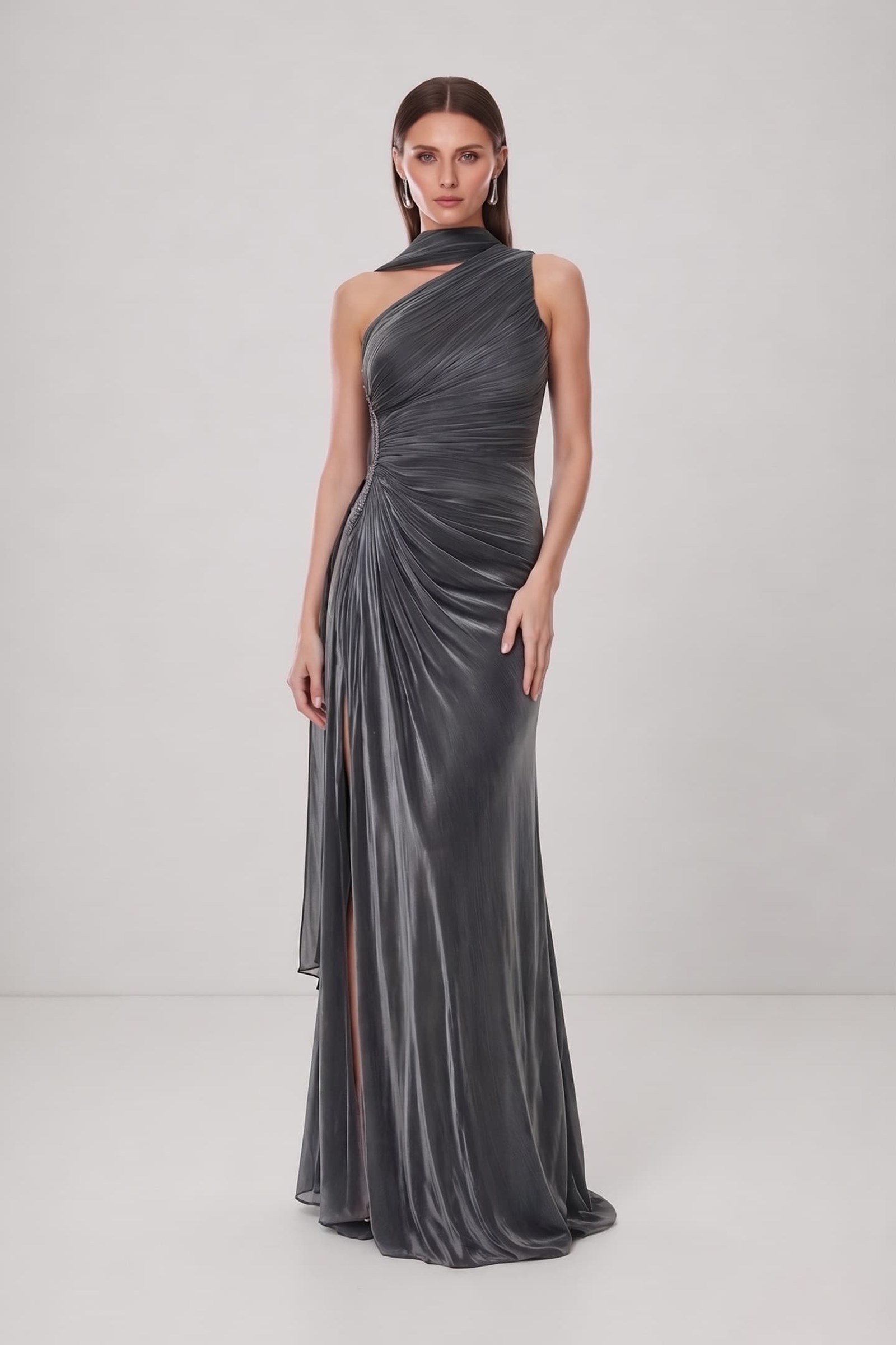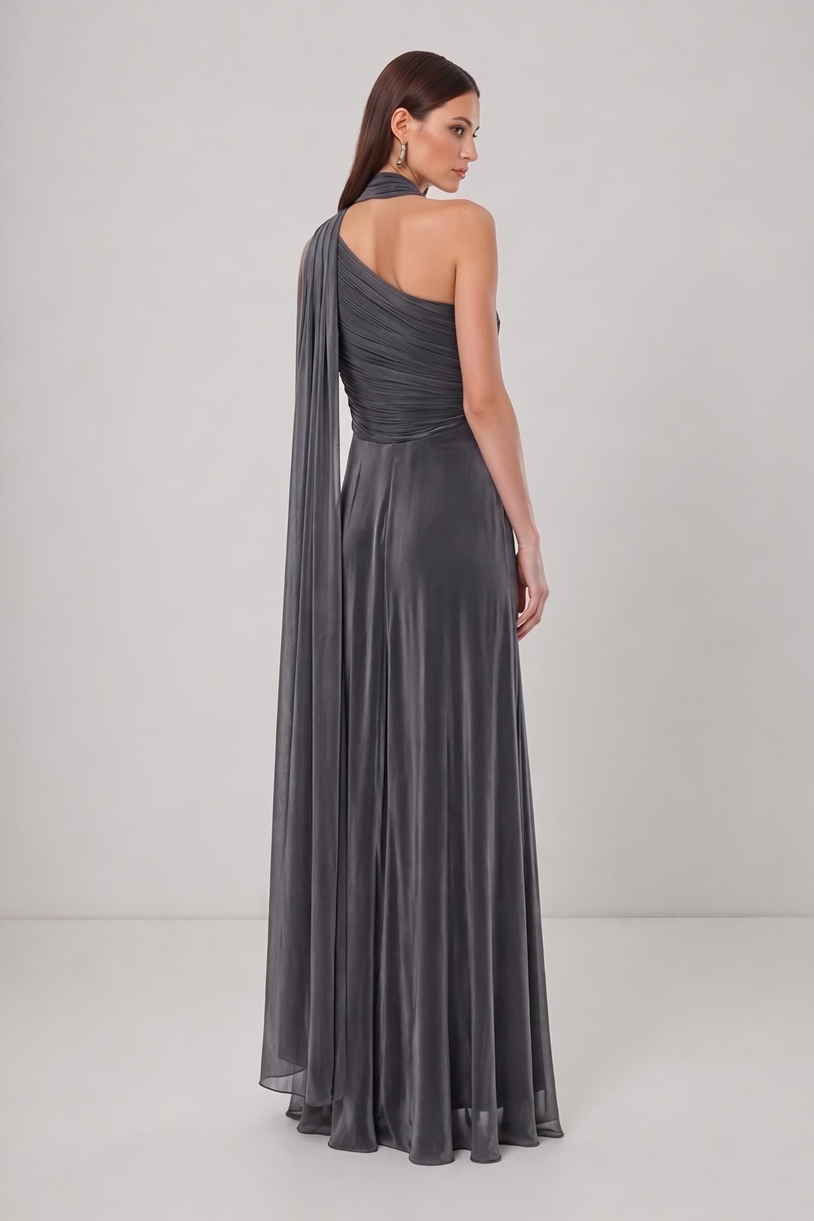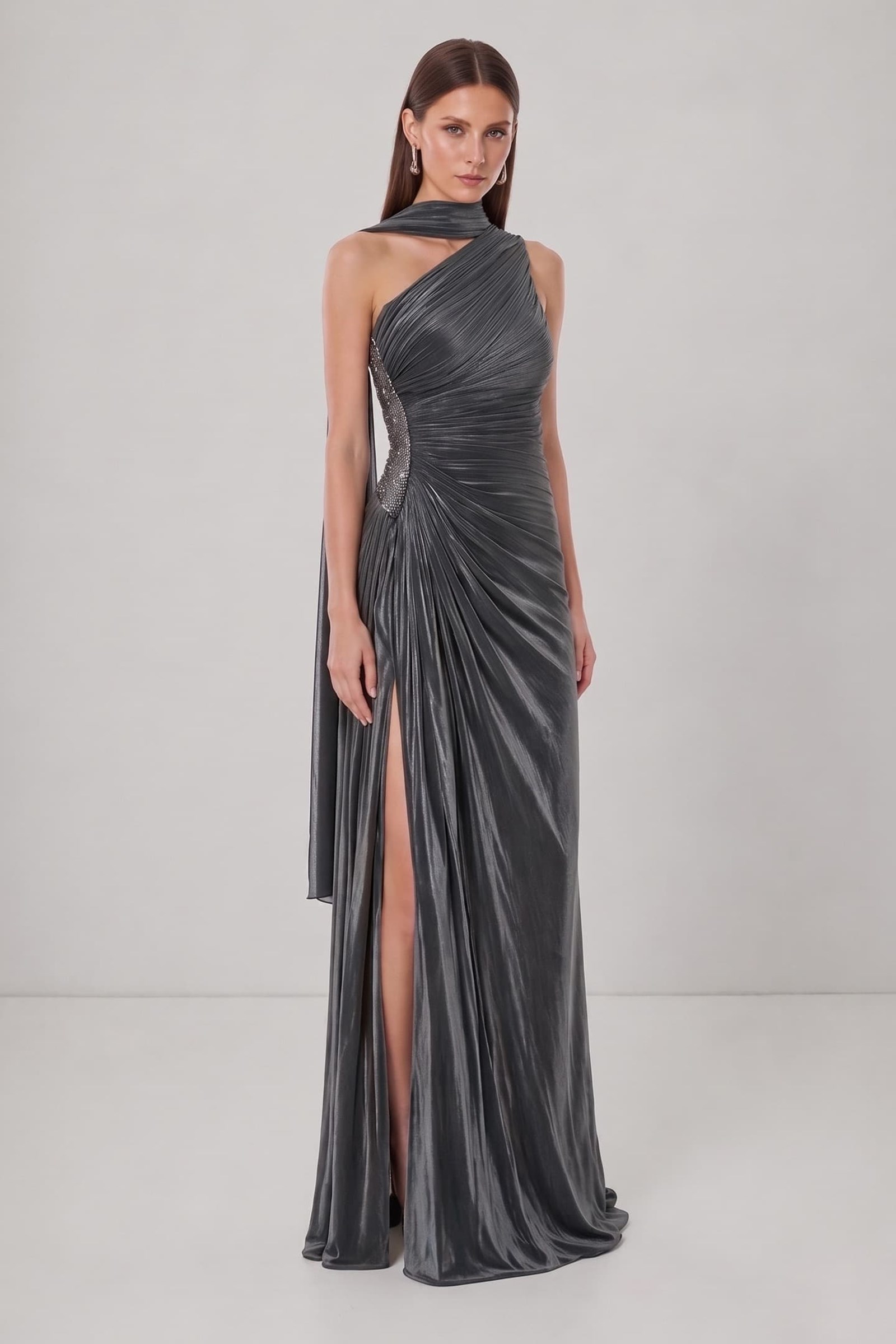 • Koyu Kahve Belden Taş Detaylı Abiye Elbise