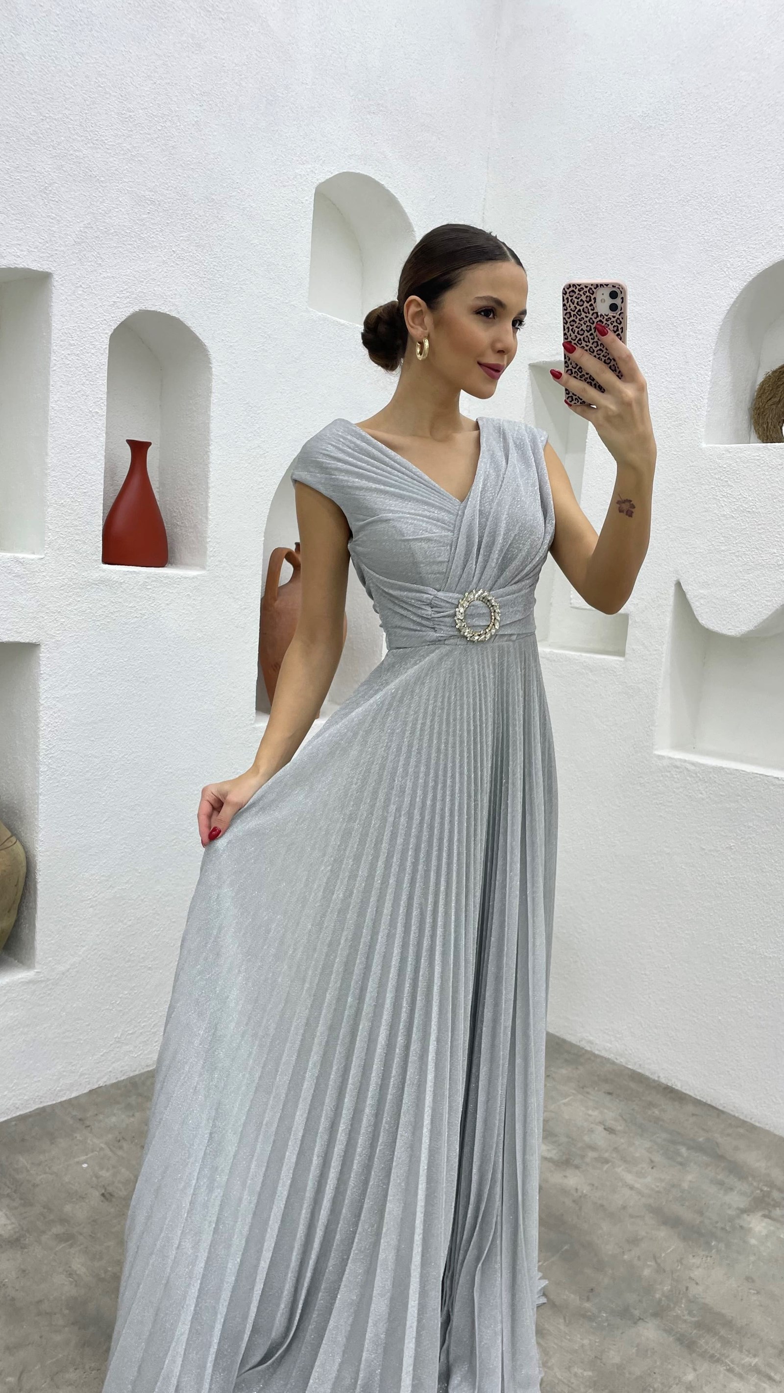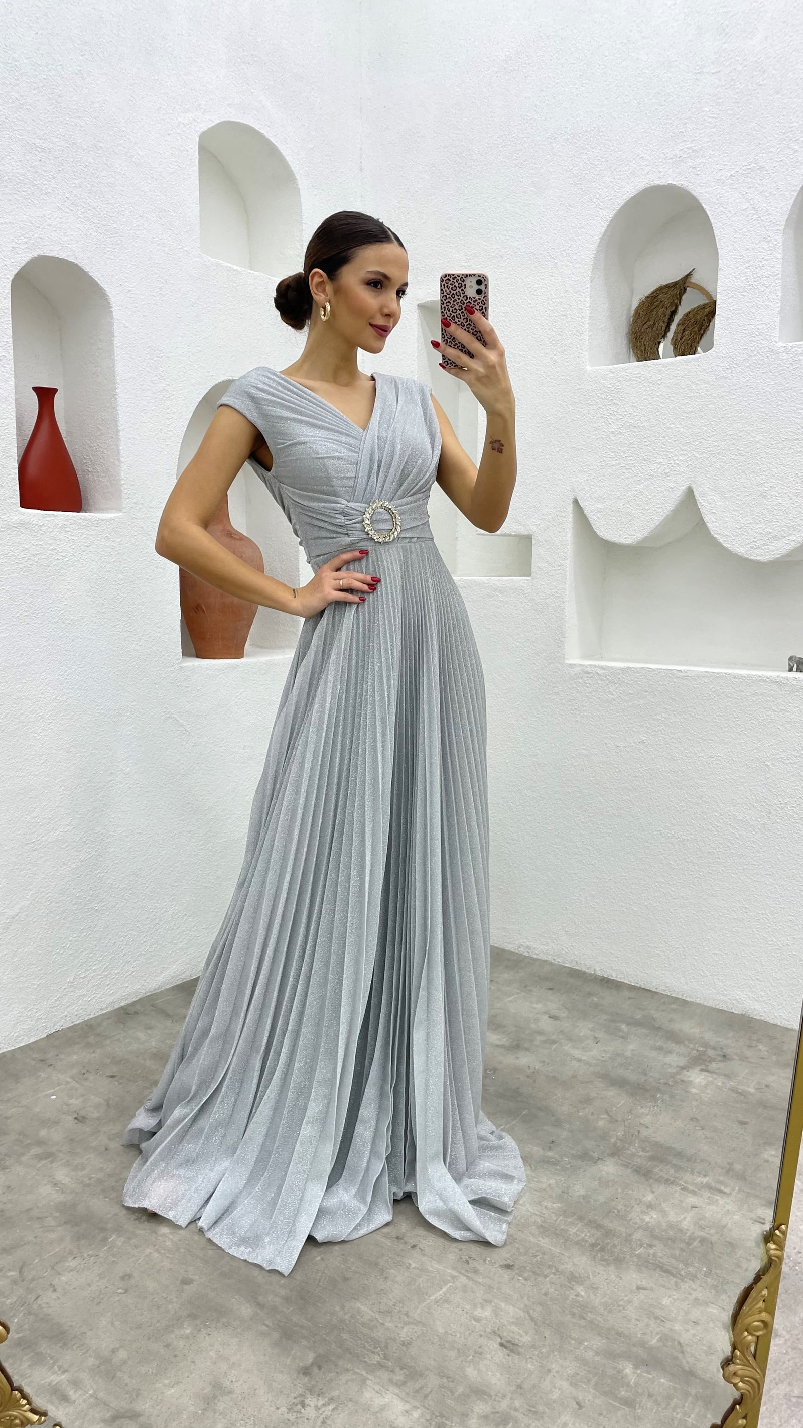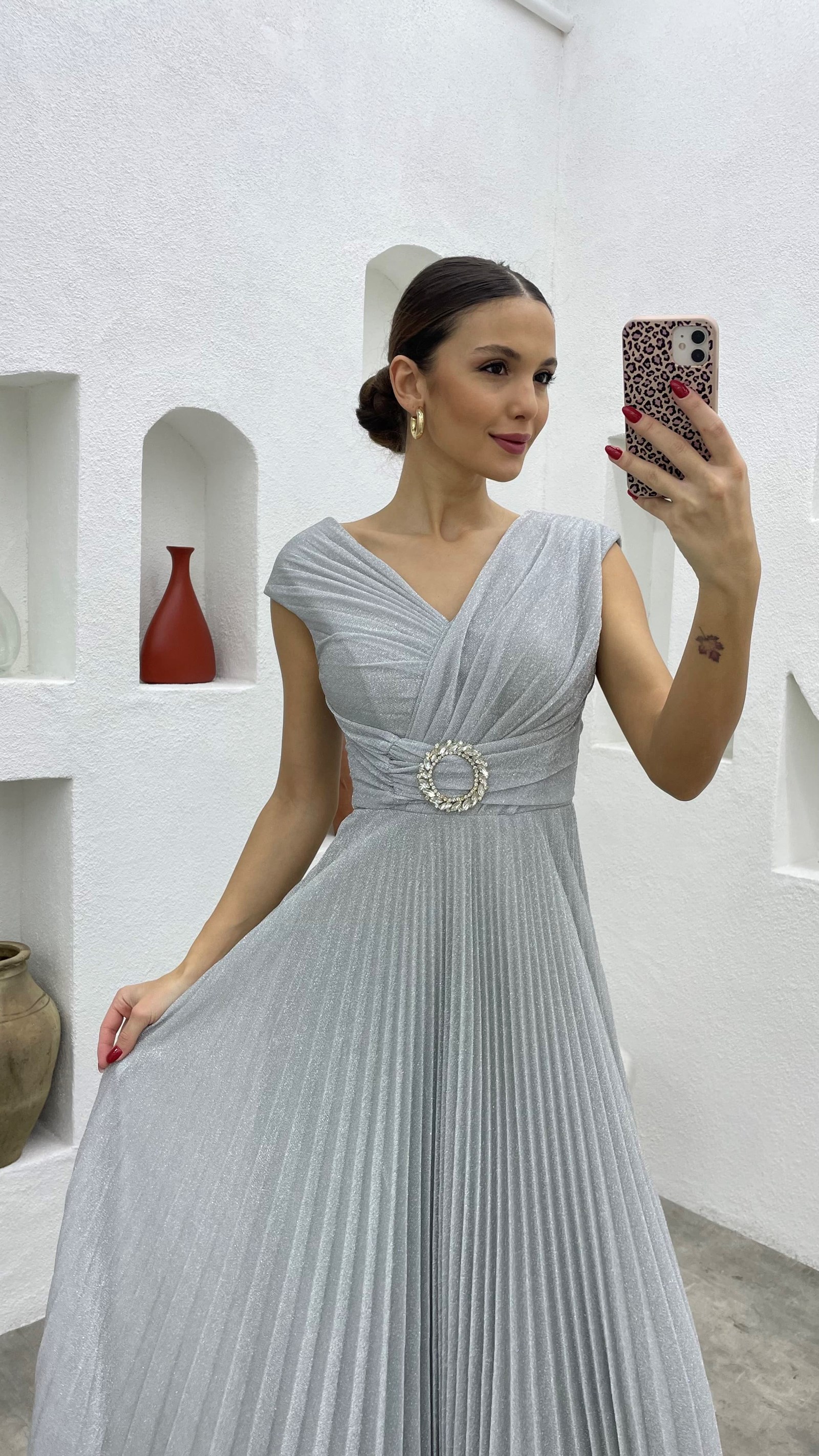 Gri Broş Detay Piliseli Simli Abiye Elbise