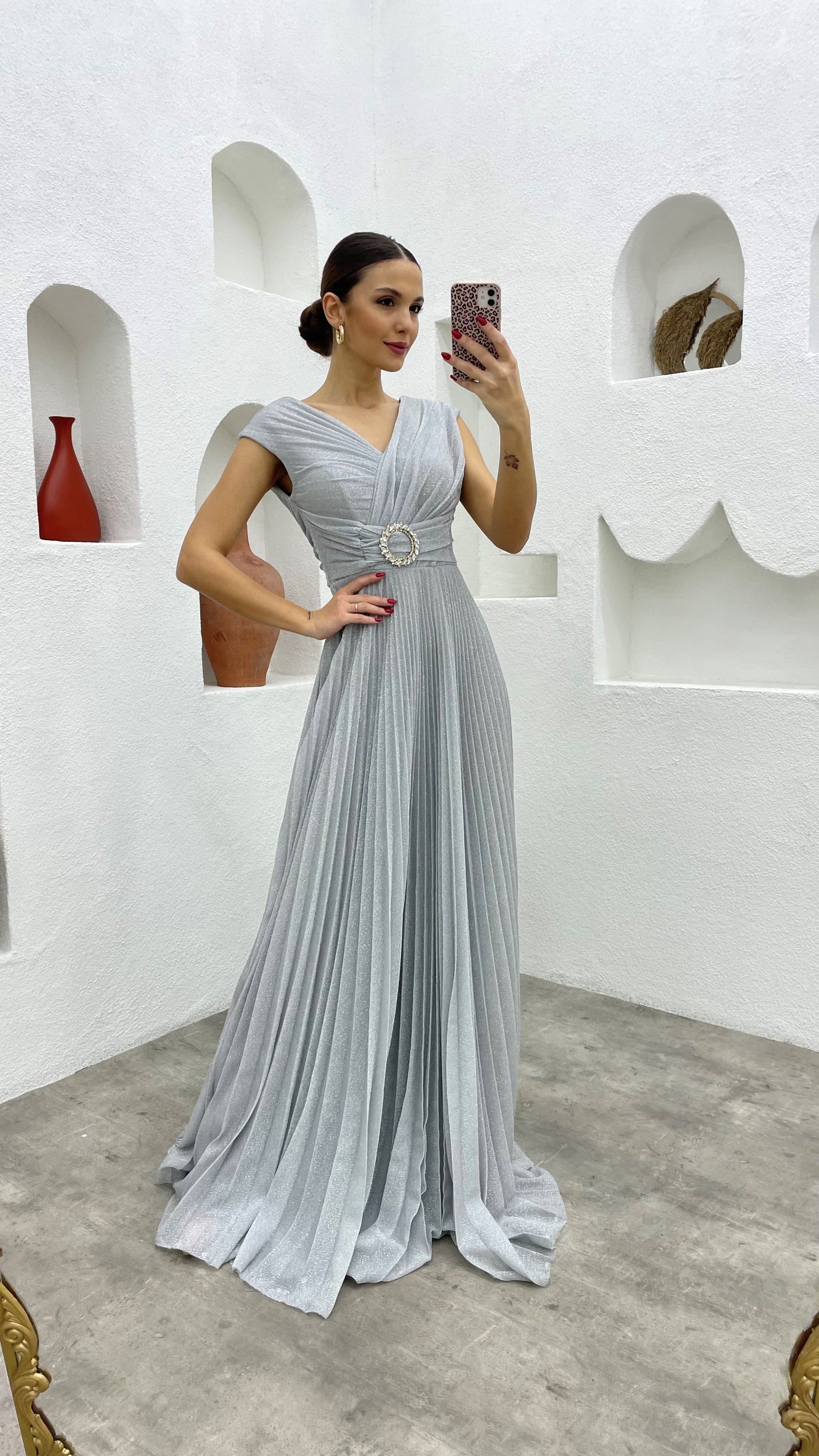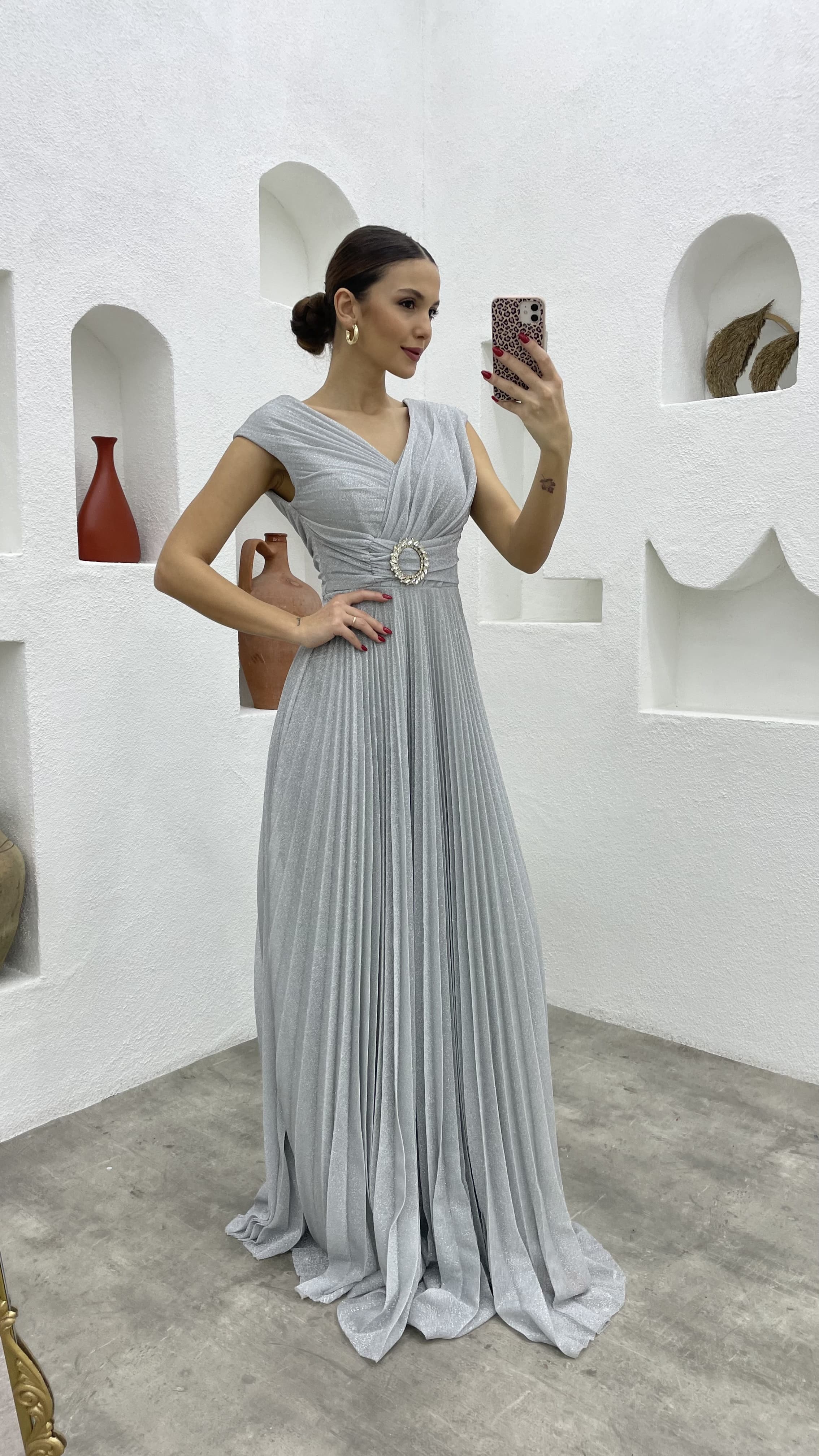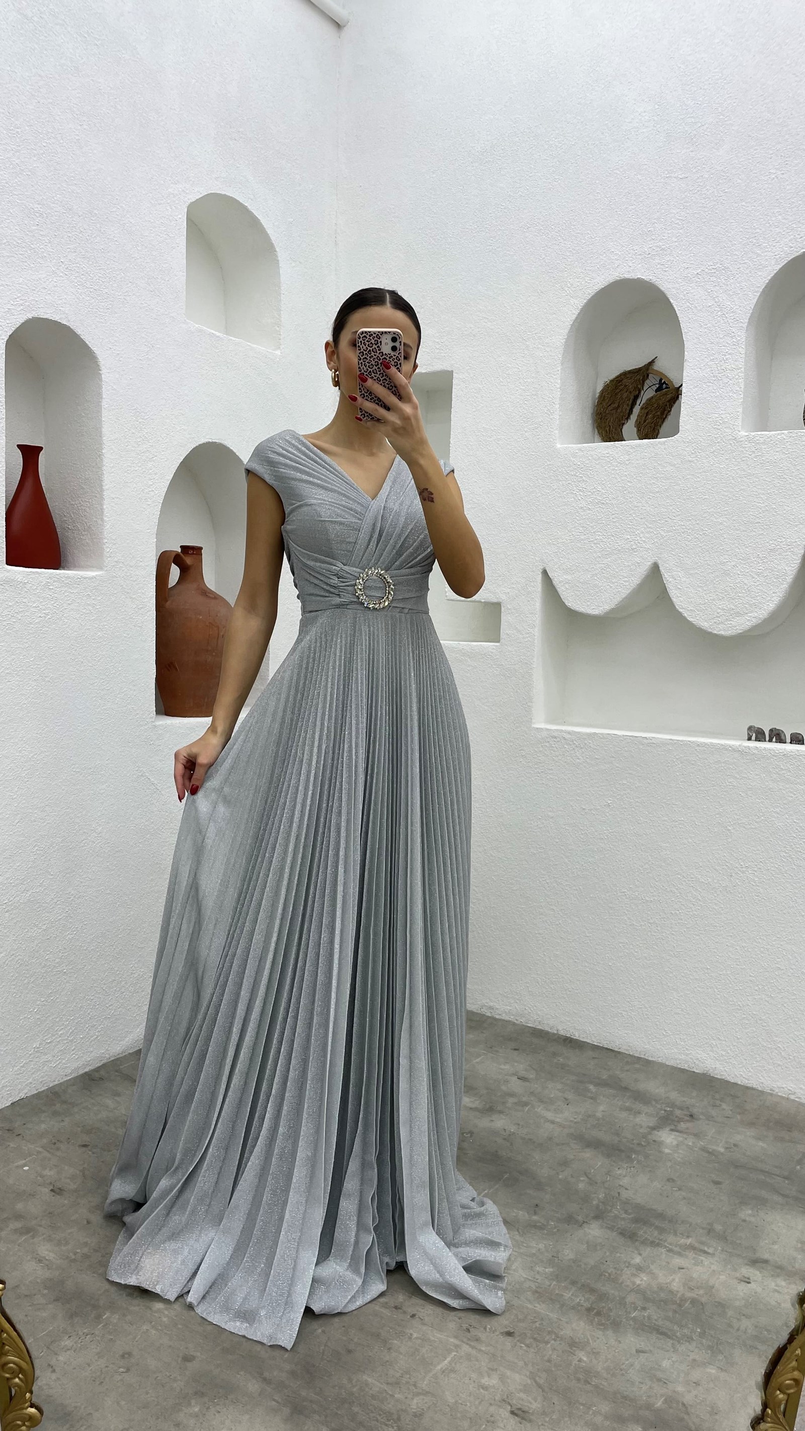 Gri Broş Detay Piliseli Simli Abiye Elbise