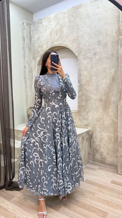 • Gri İşleme Detay Beli Fiyonk Tasarım Abiye Elbise