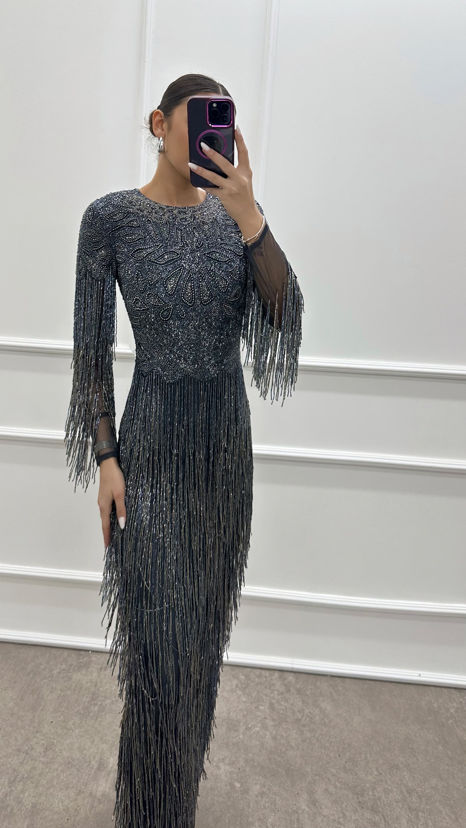 Gri Kolları püskül Özel İşlemeli Tasarım Abiye Elbise