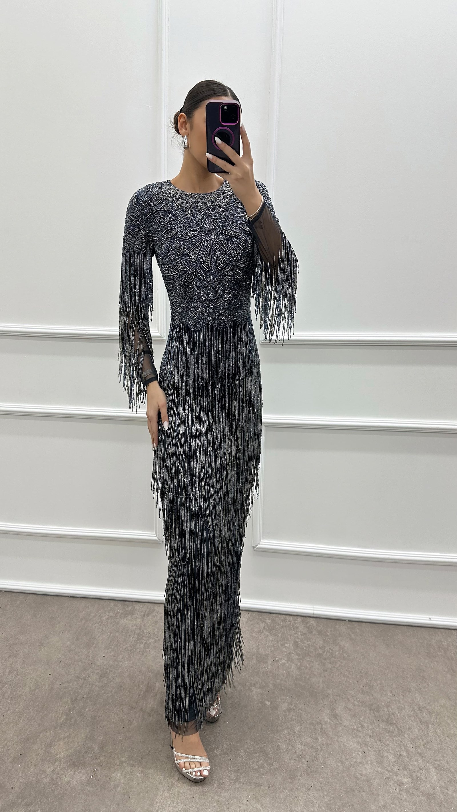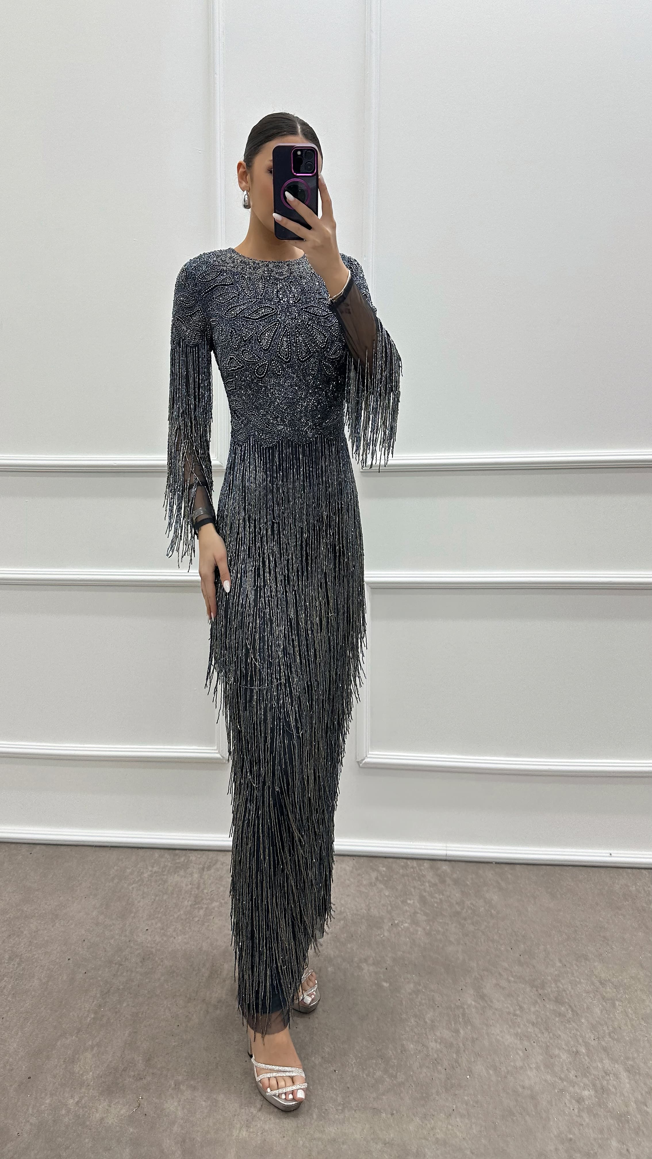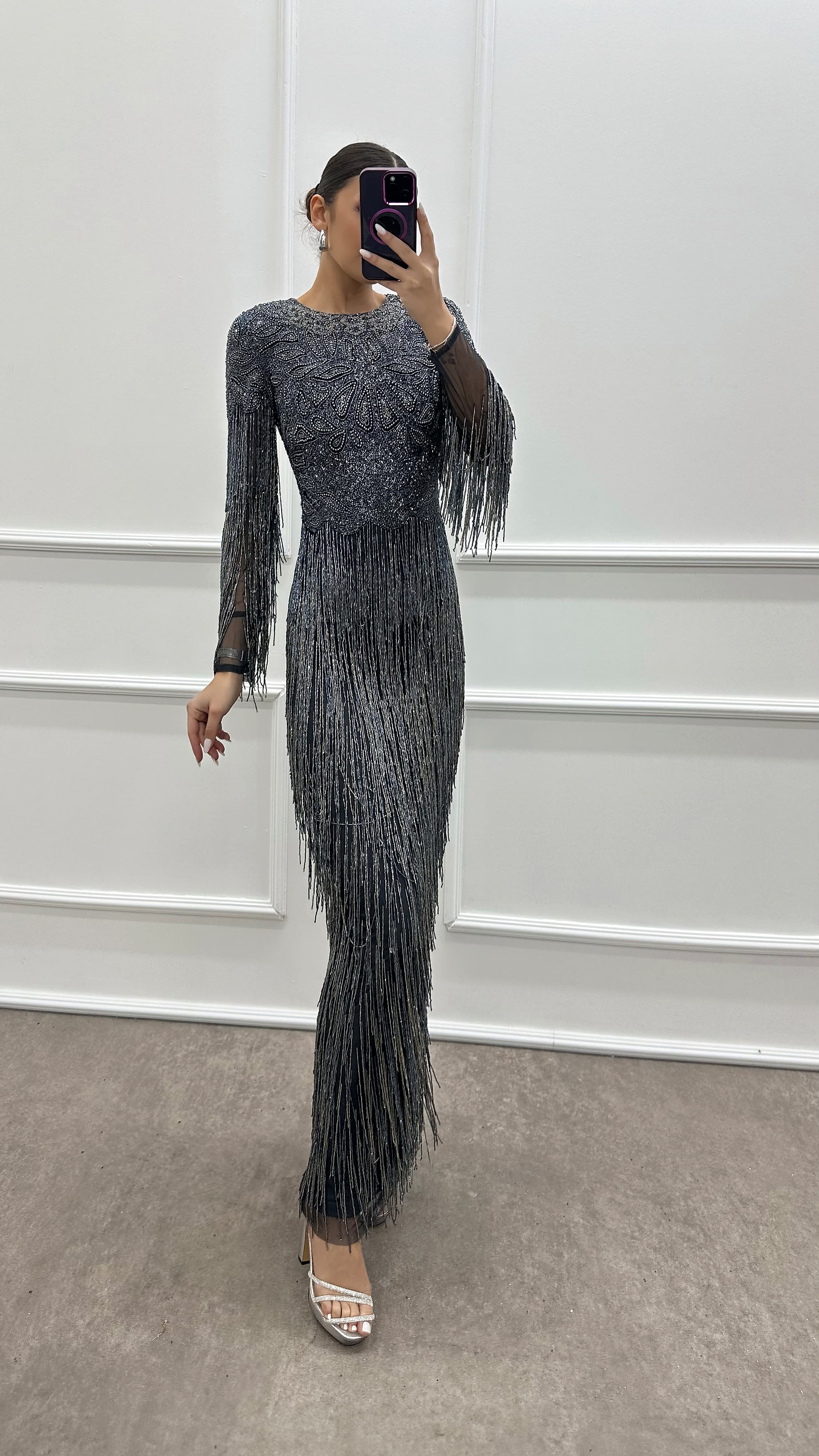 • Antrasit Kolları püskül Özel İşlemeli Tasarım Abiye Elbise