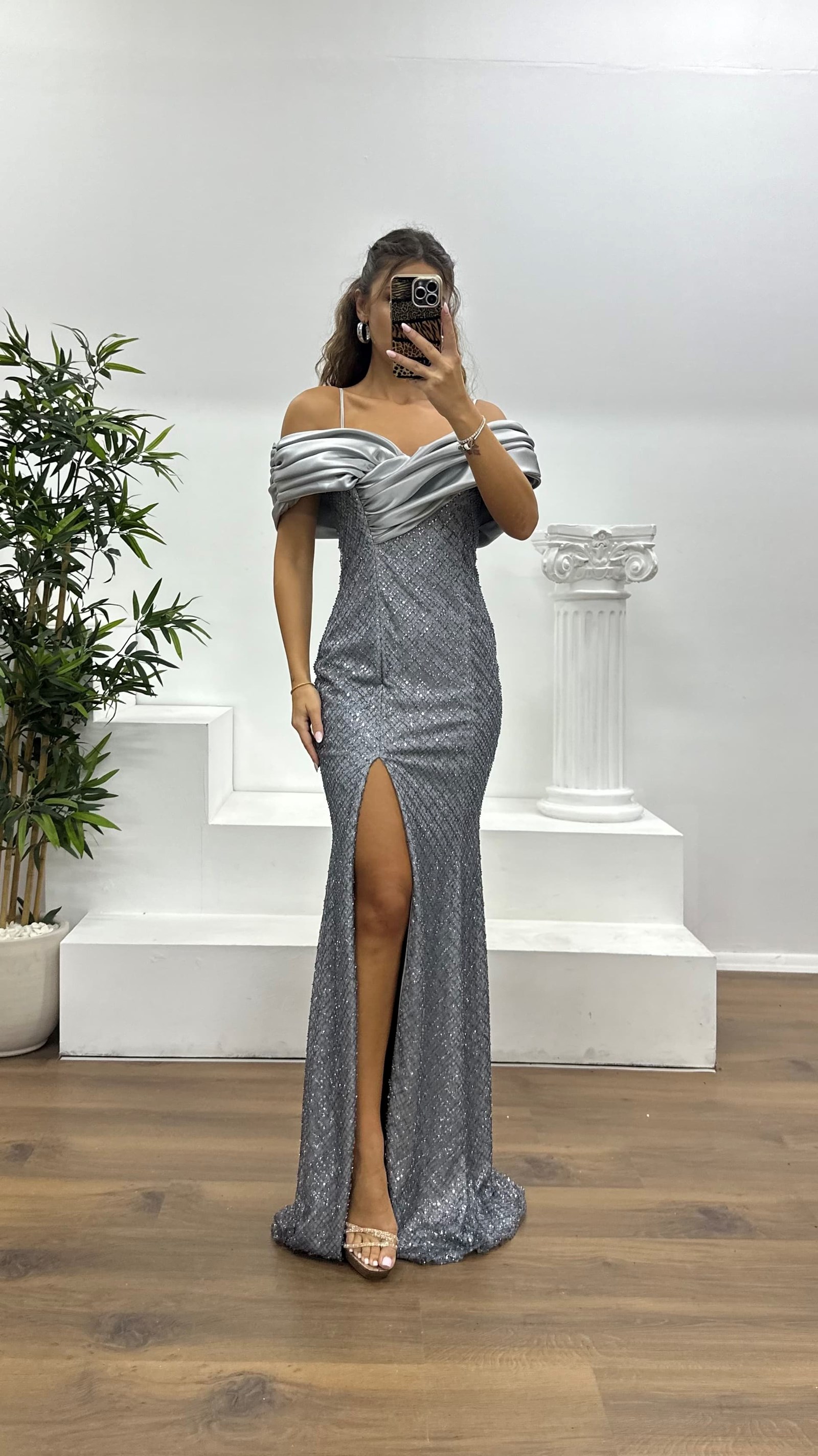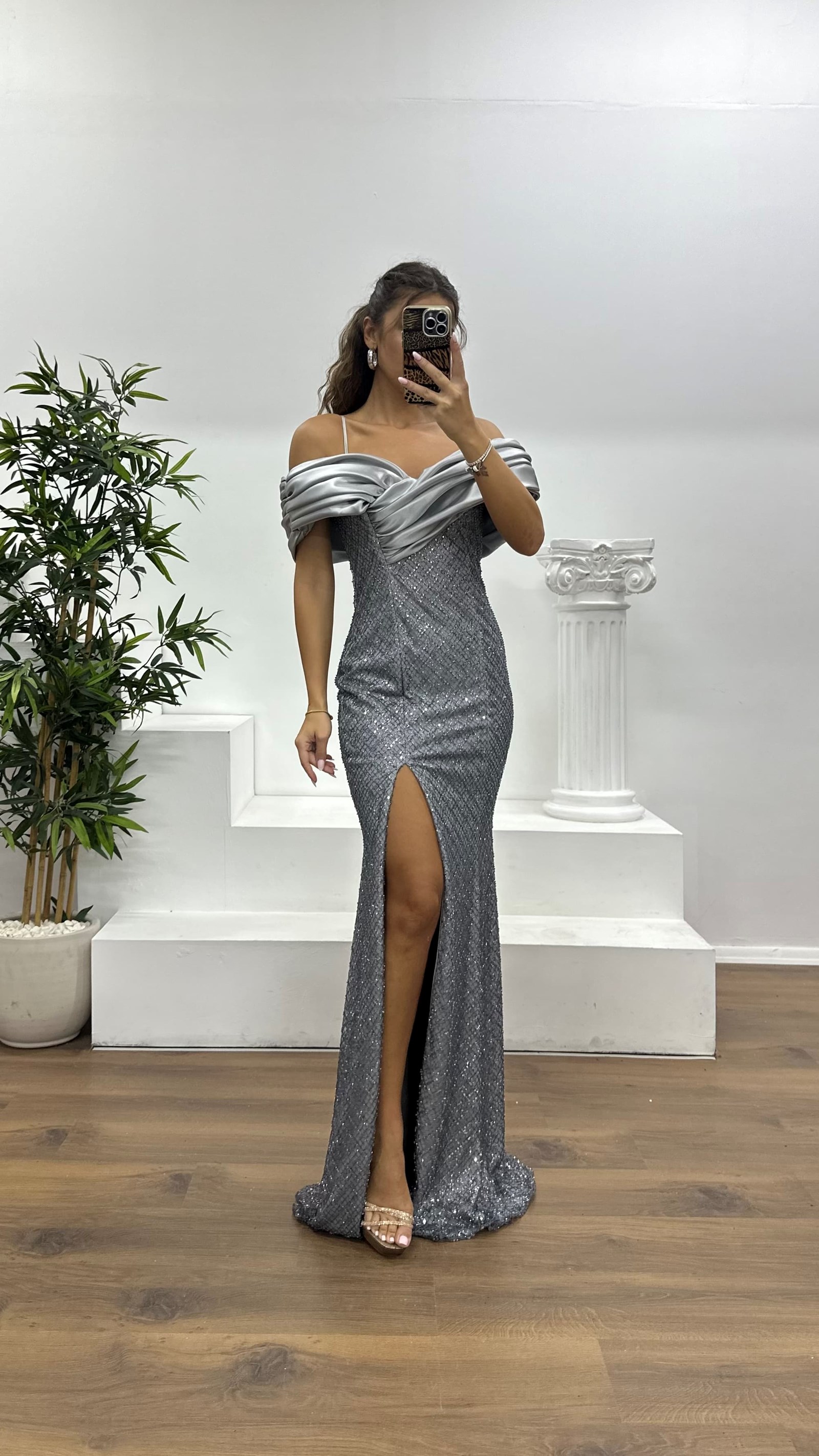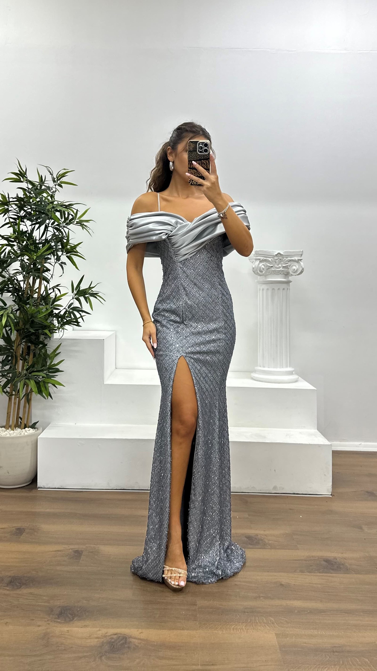 • Gri Sırt Detay İşlemeli Abiye Elbise