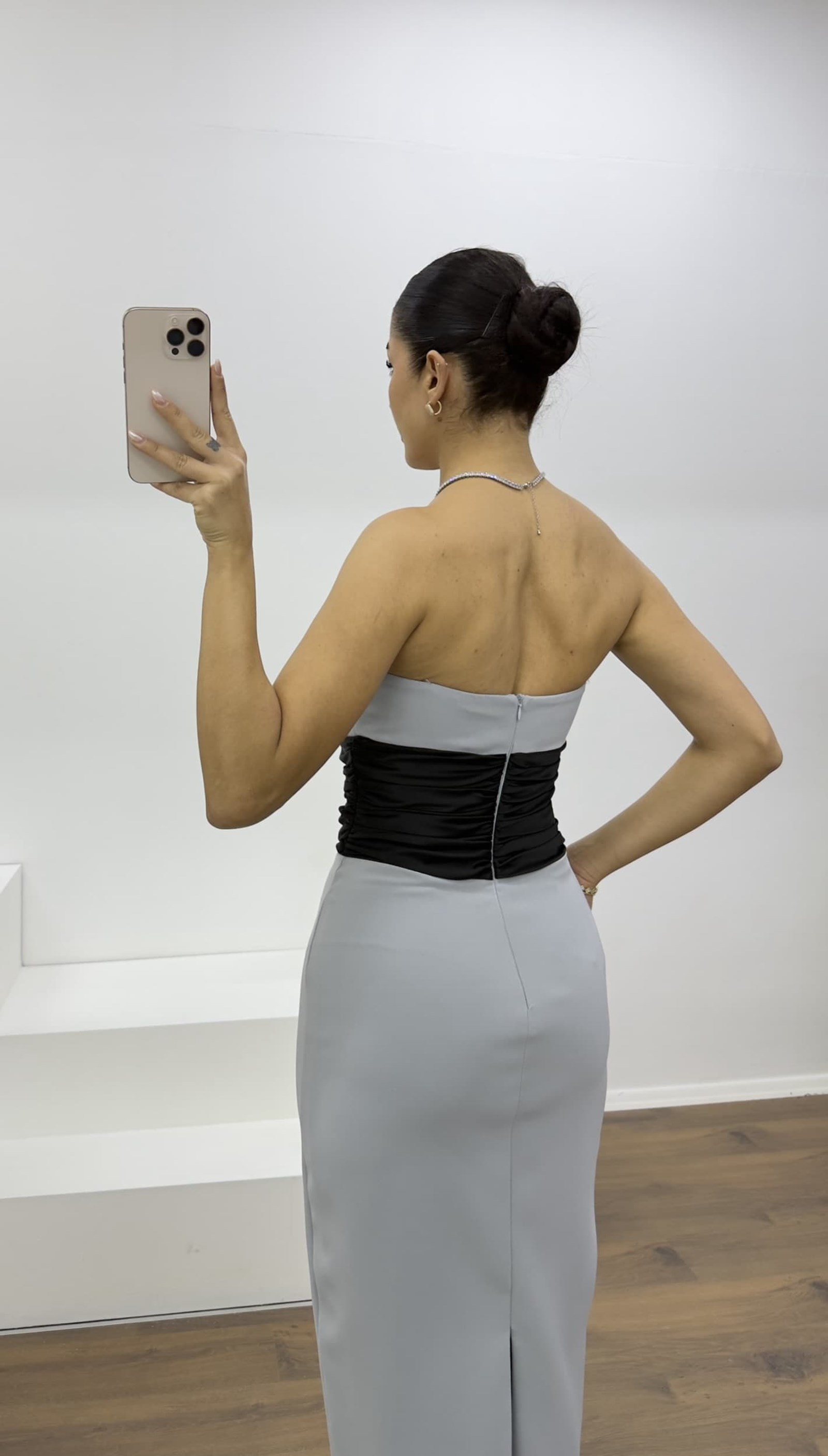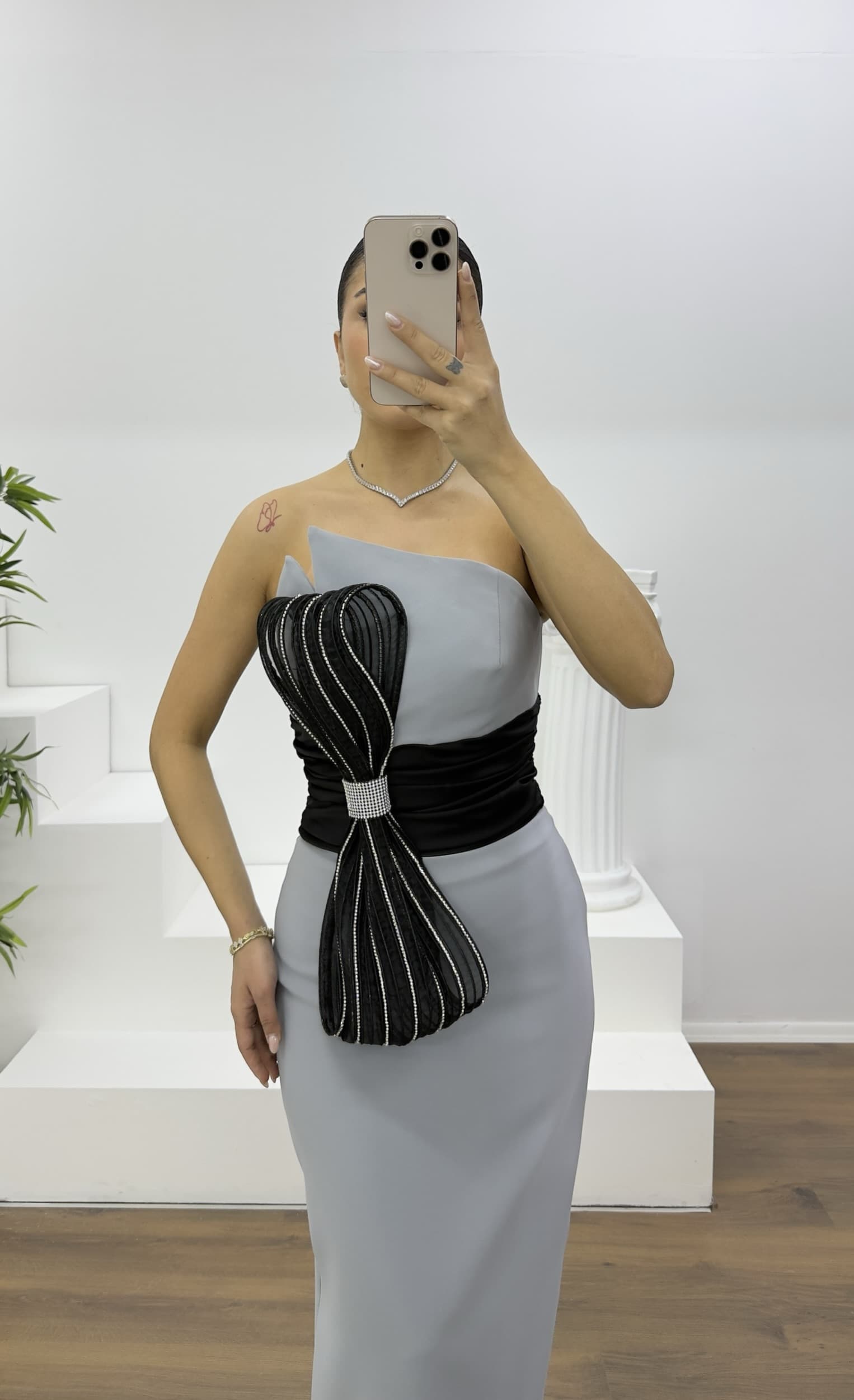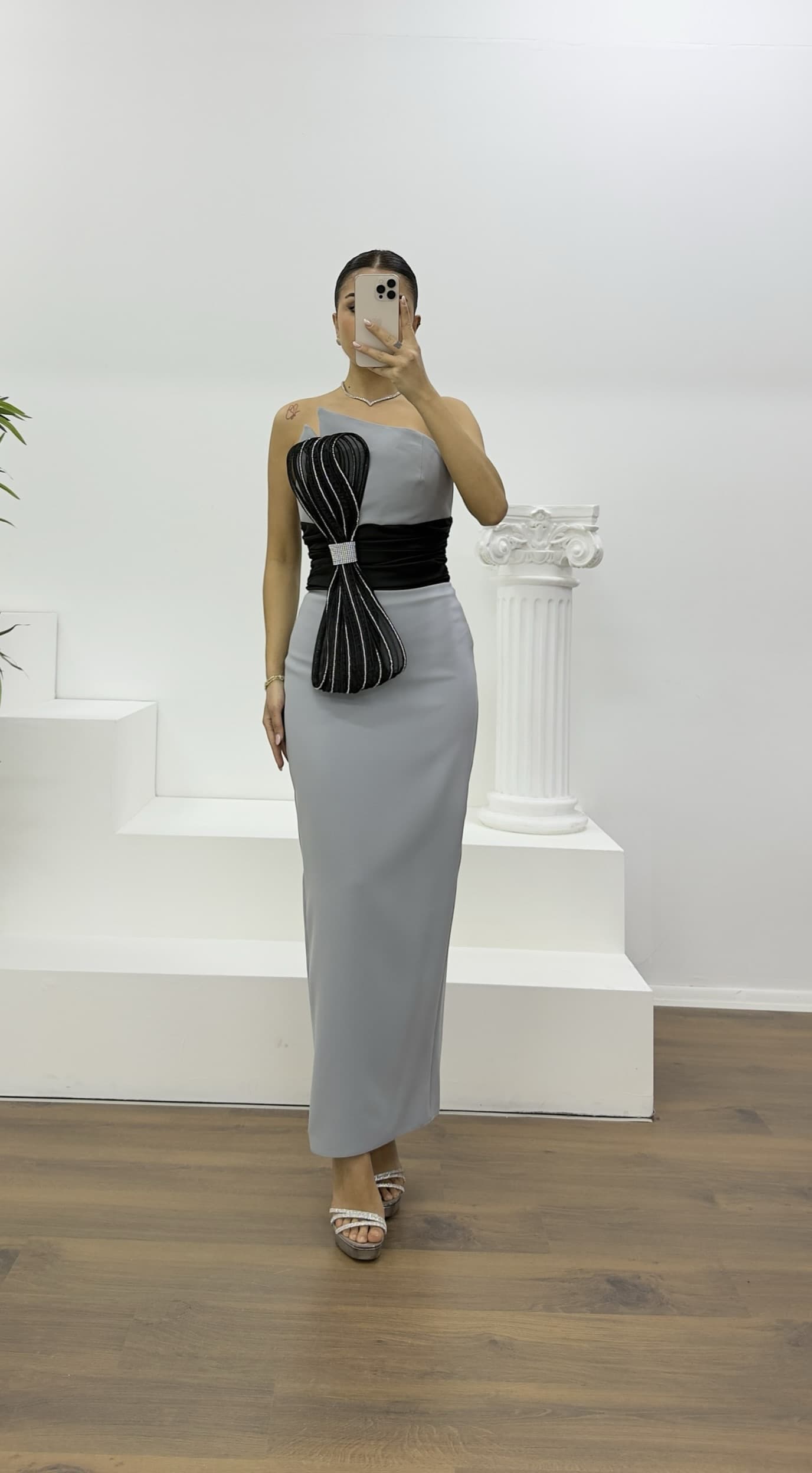 • Gri Siyah Fiyonk Detaylı Asimetrik Straplez Abiye Elbise