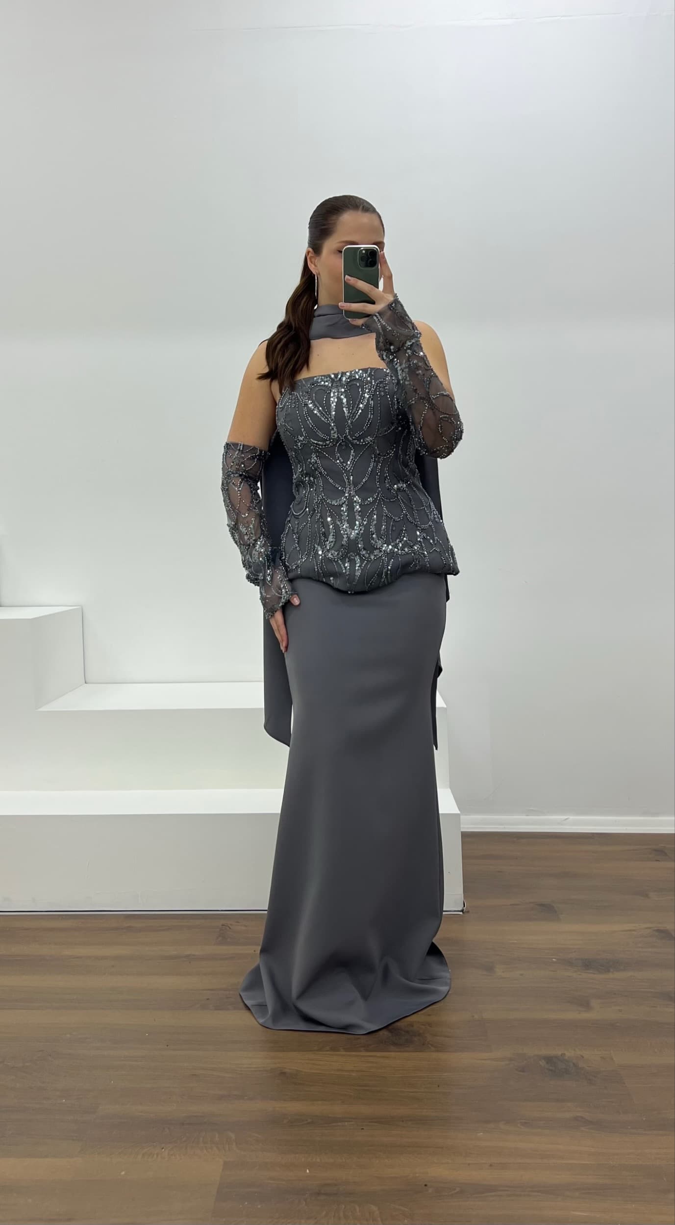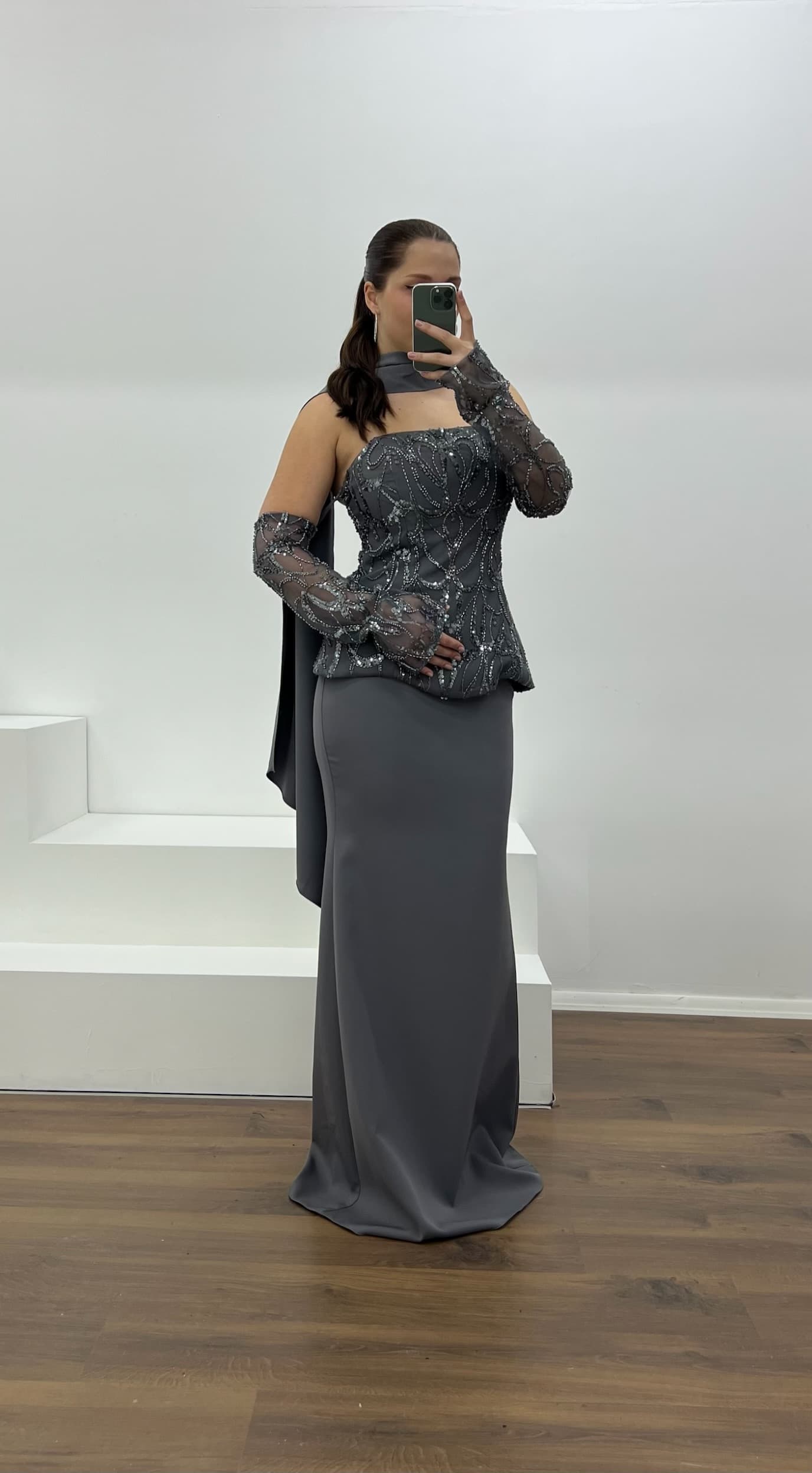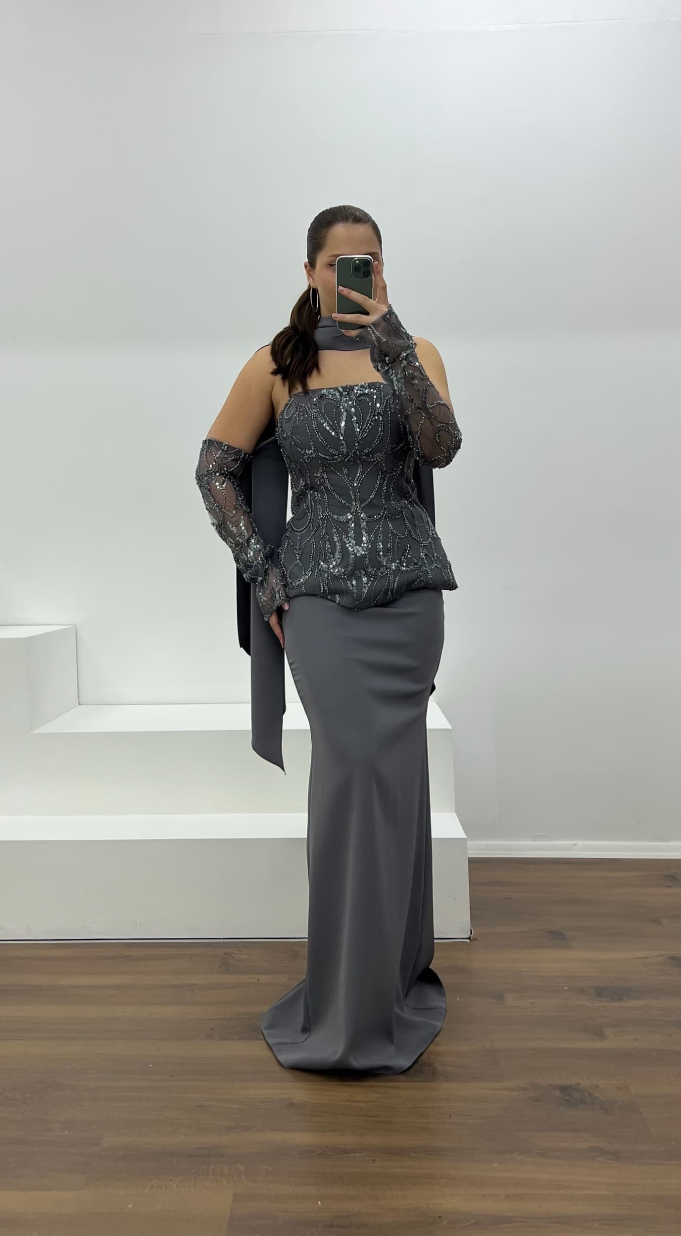• Gri Straplez İşleme Detay Büyük Beden Abiye Elbise