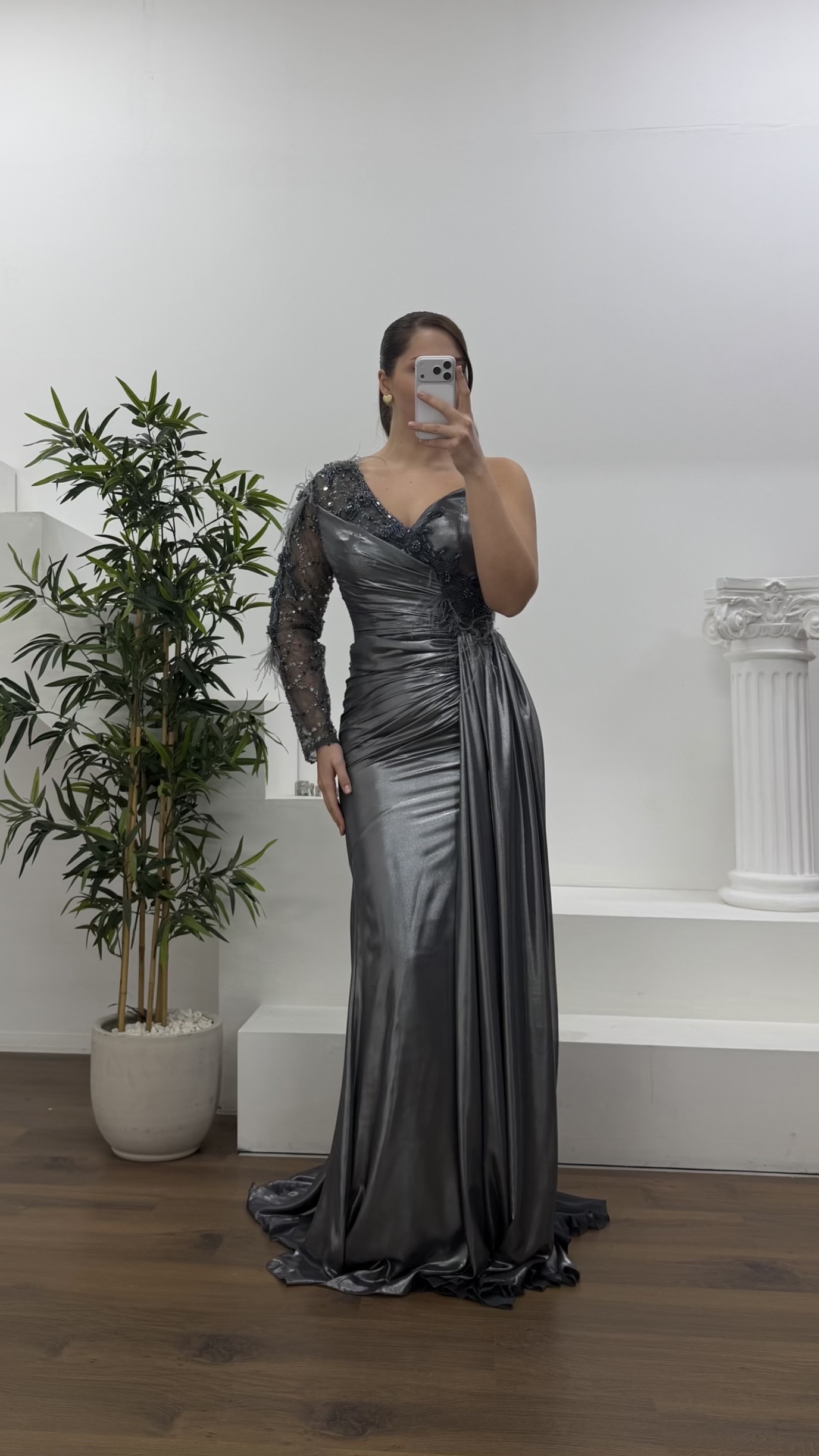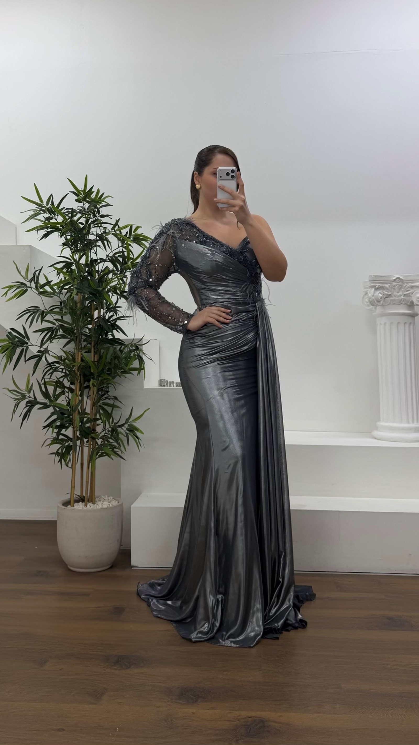 Tek omuz işlemeli abiye elbise