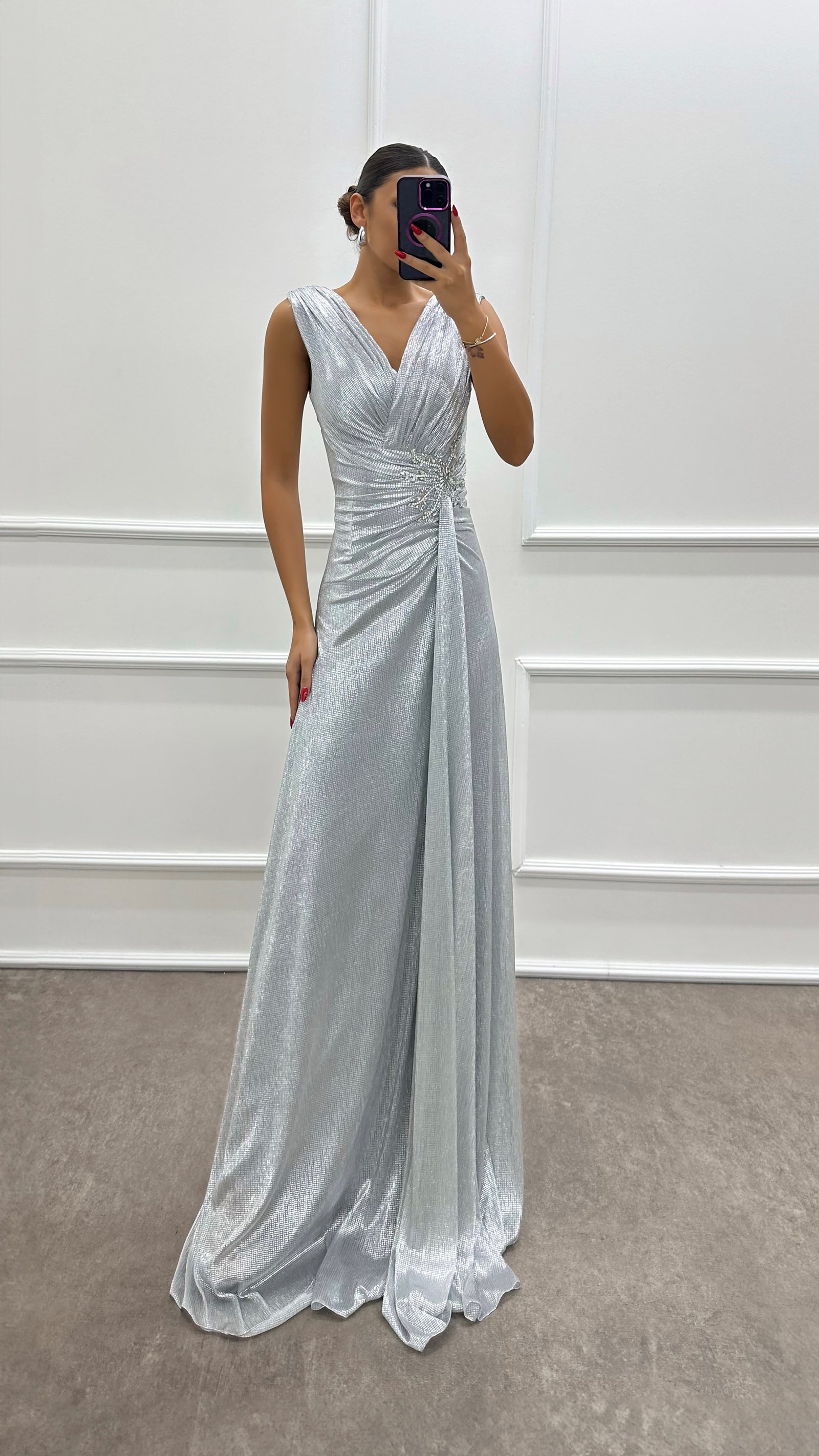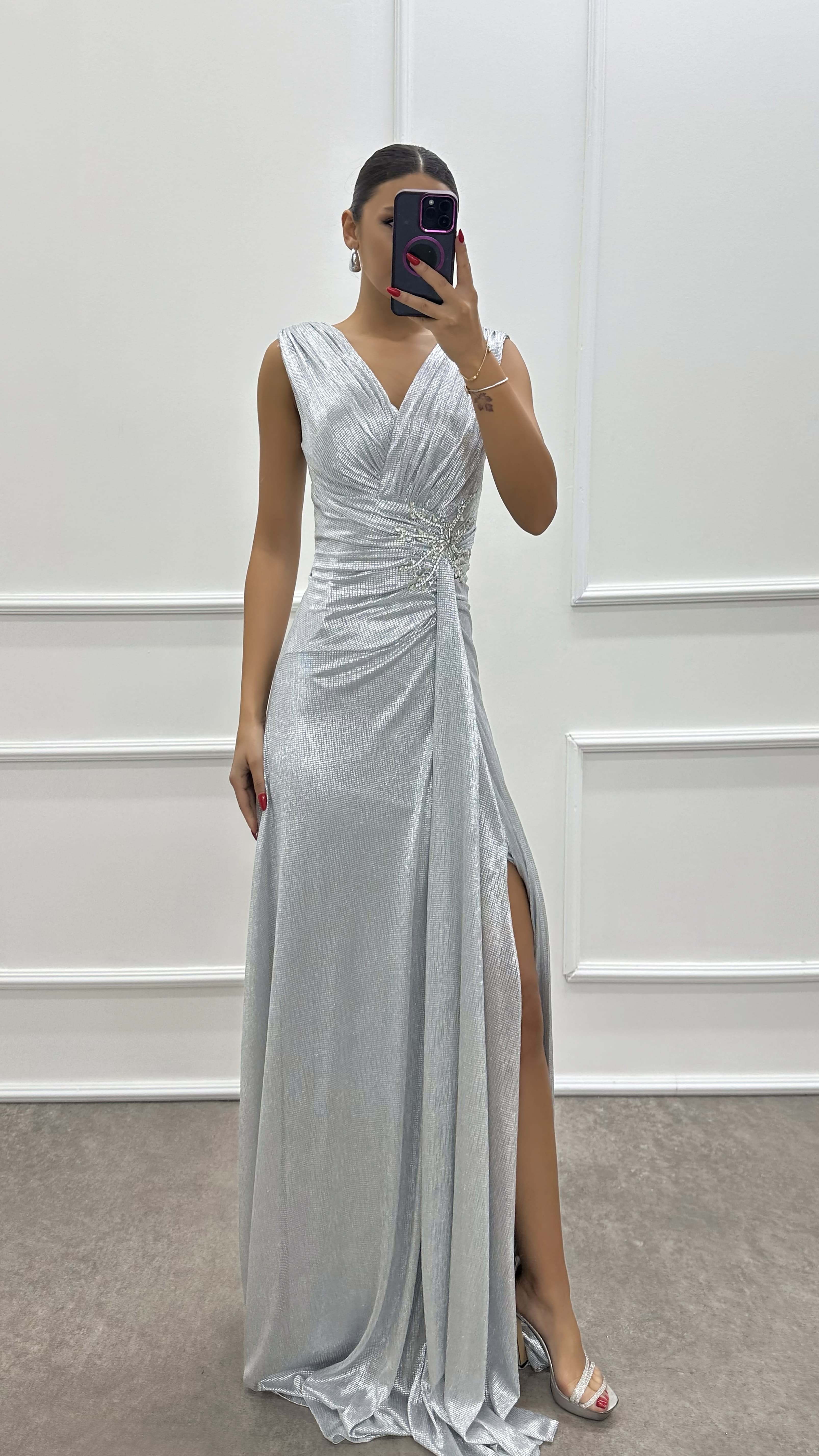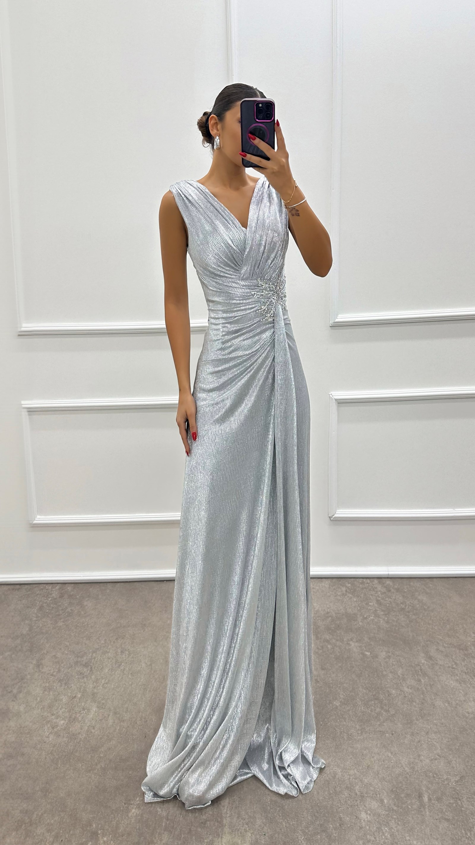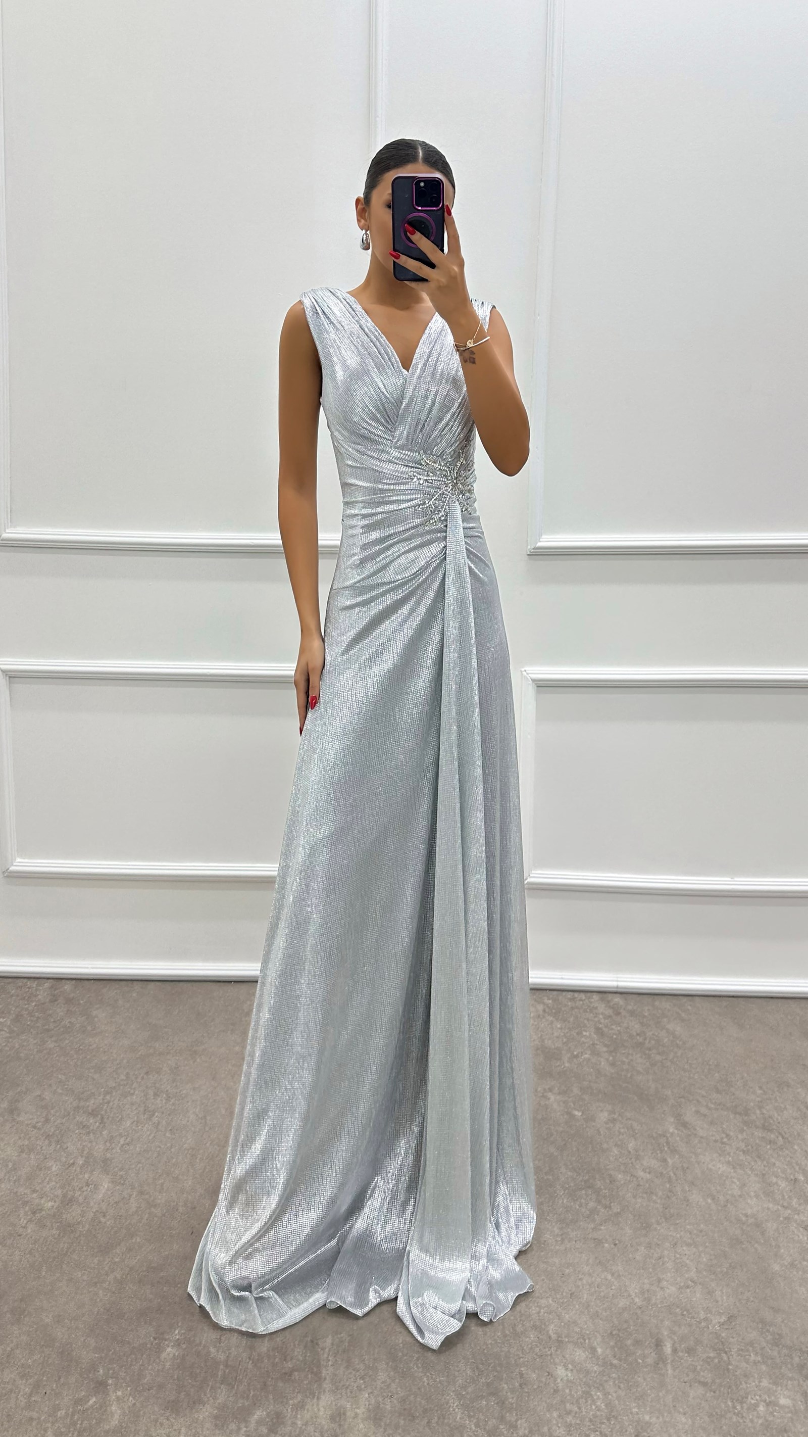 • Gri V Yaka Bel Detay Tasarım Elbise
