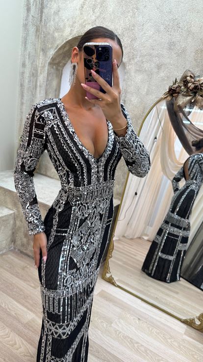 • Siyah Gümüş V Yaka El İşlemesi Tasarım Abiye Elbise