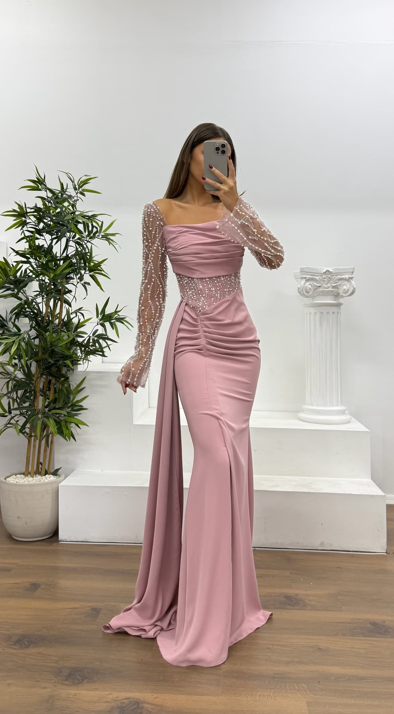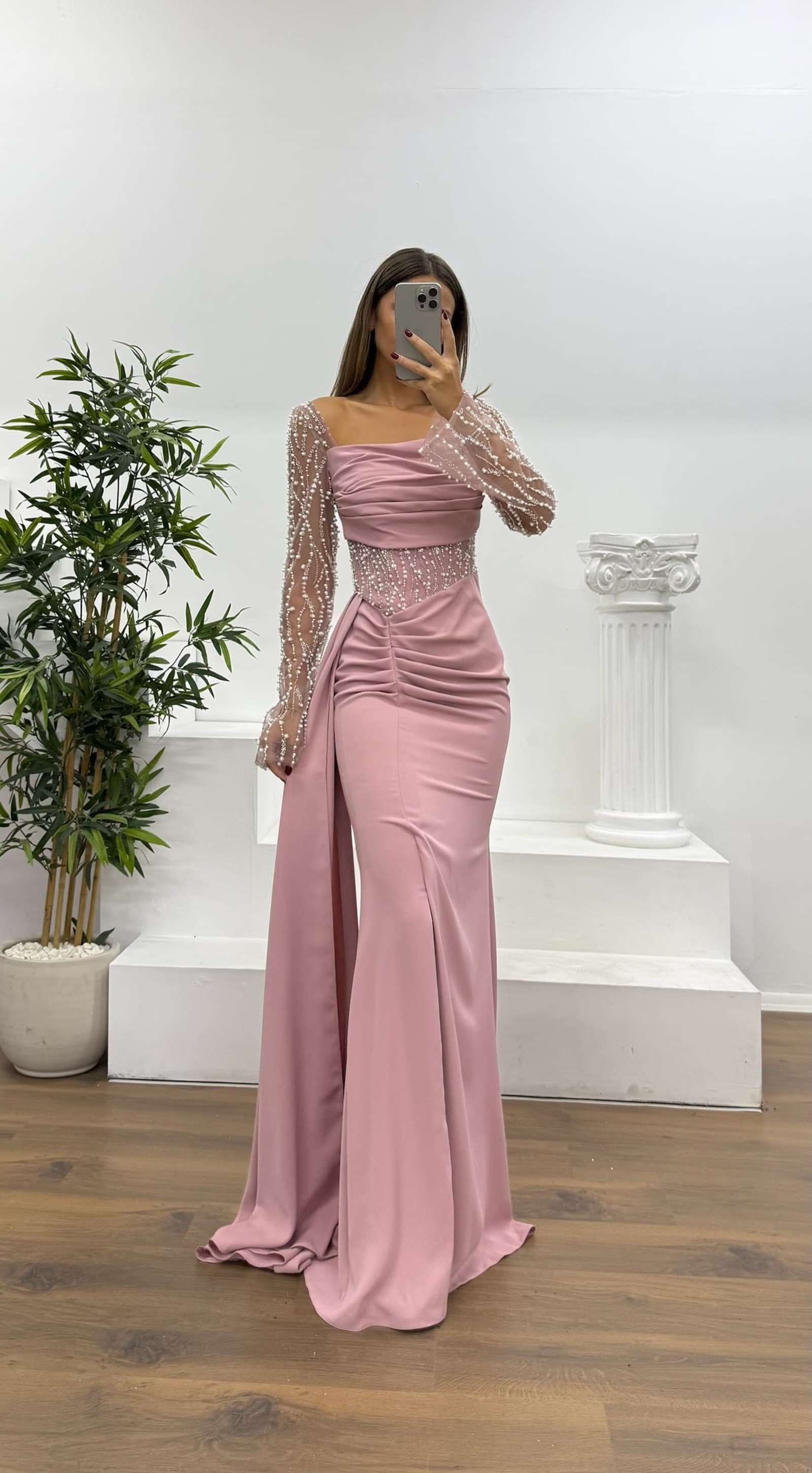 Ürün 36-44 bedene kadar uyumlu, göğüs pedli, astarlı, arka kapama fermuar, yırtmaçlı, bel detay, işlemeli abiye olarak tasarlanmıştır.