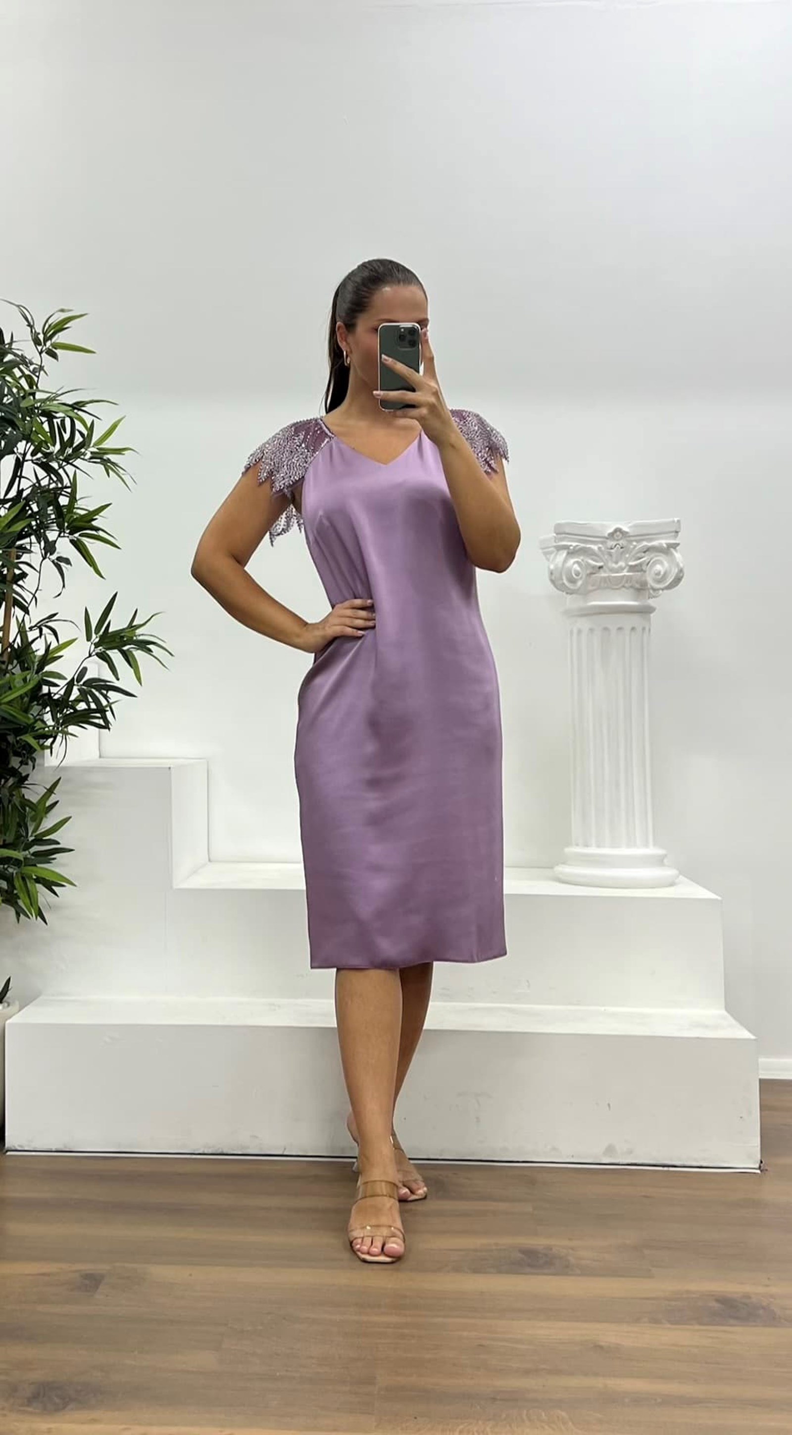 • Gül Kurusu İşleme Detay Saten Büyük Beden Abiye Elbise