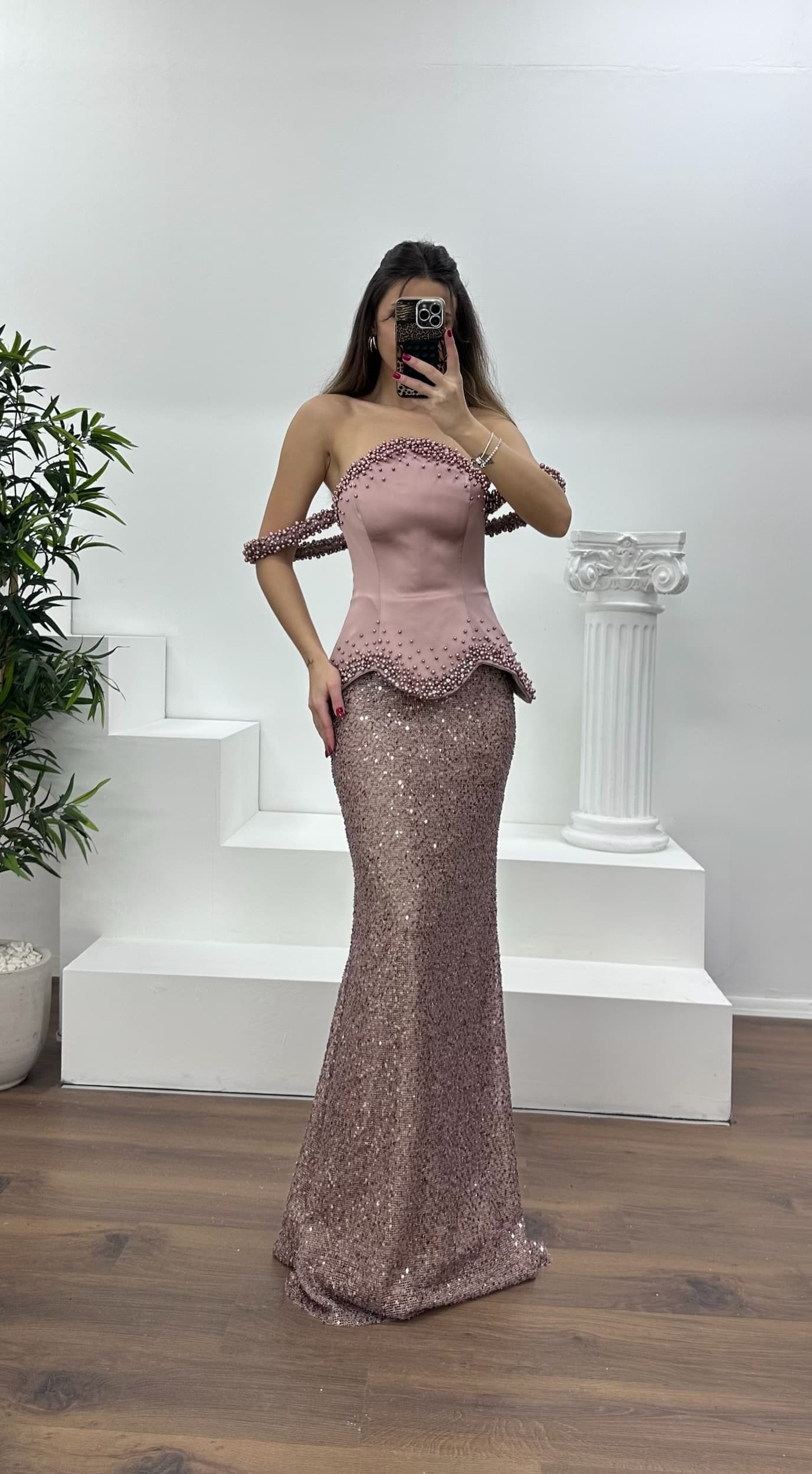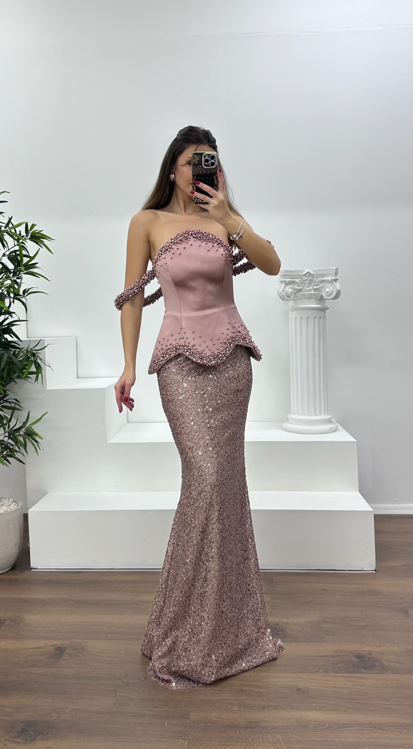 • Gül Kurusu Kolları  Boncuklu Straplez Abiye Elbise