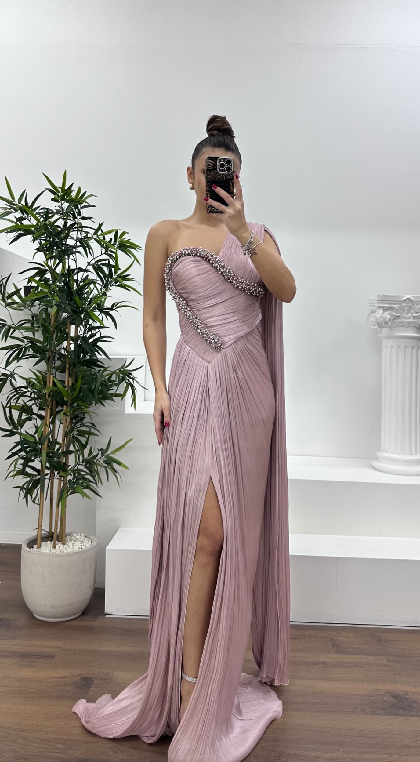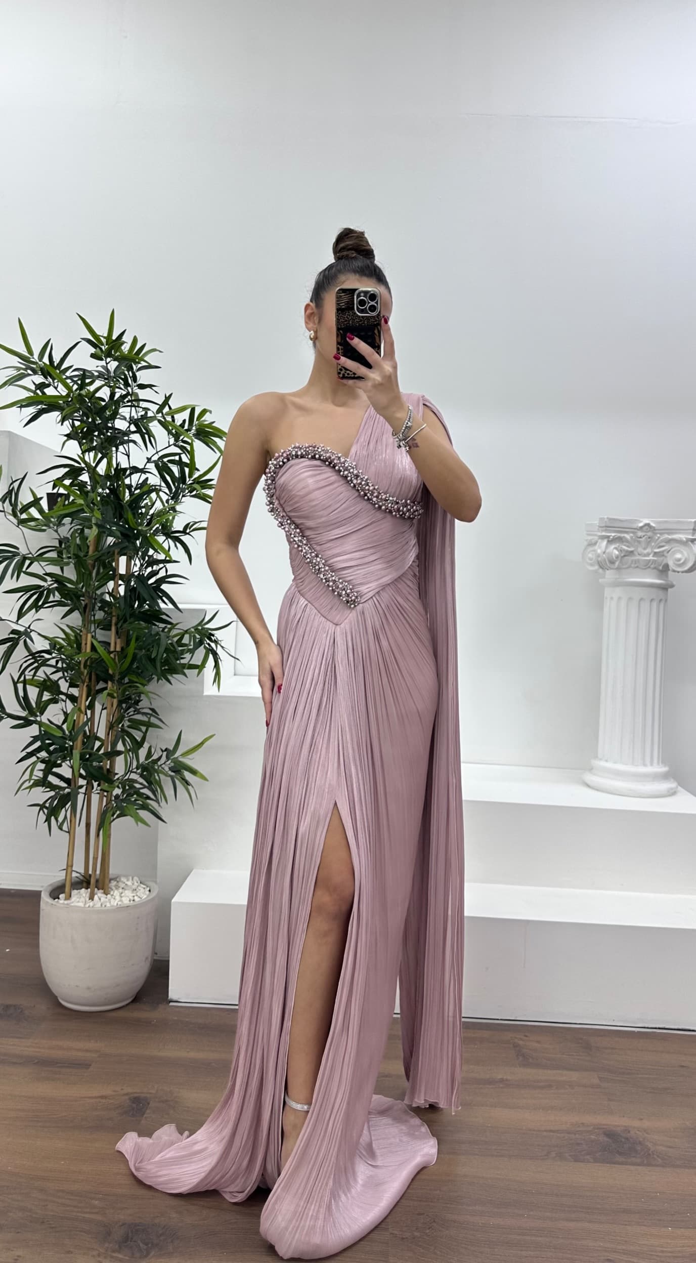 Tek omuz inci işlemeli abiye elbise