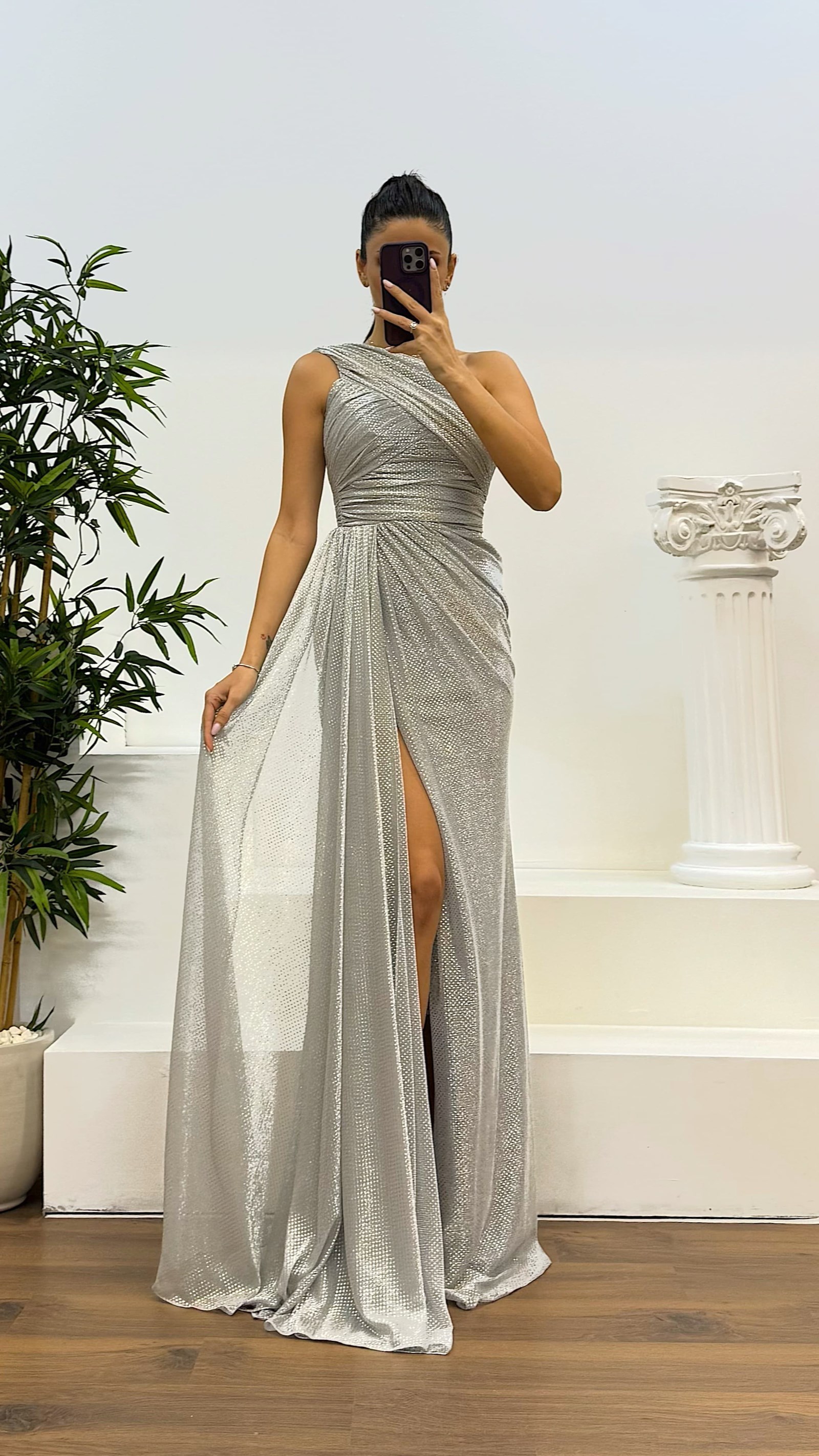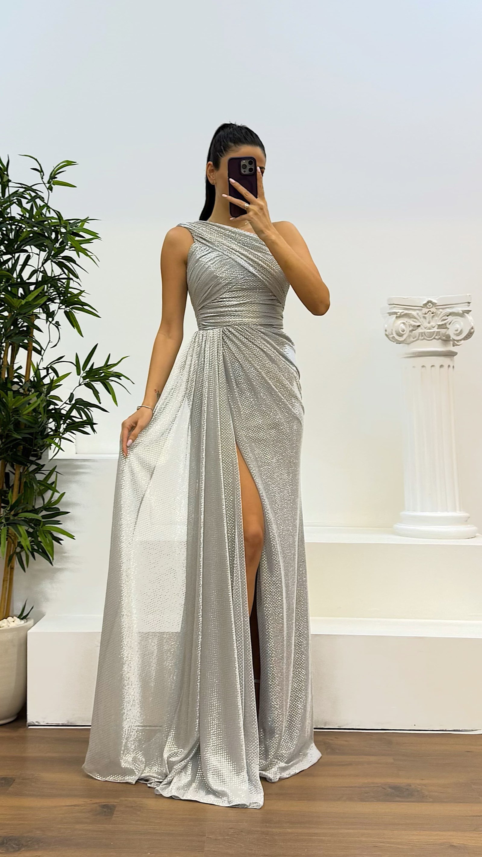 Ürün 36-44 bedene kadar uyumlu, göğüs pedli, astarlı, yırtmaçlı, arka kapama fermuar, tek omuz abiye olarak tasarlanmıştır.