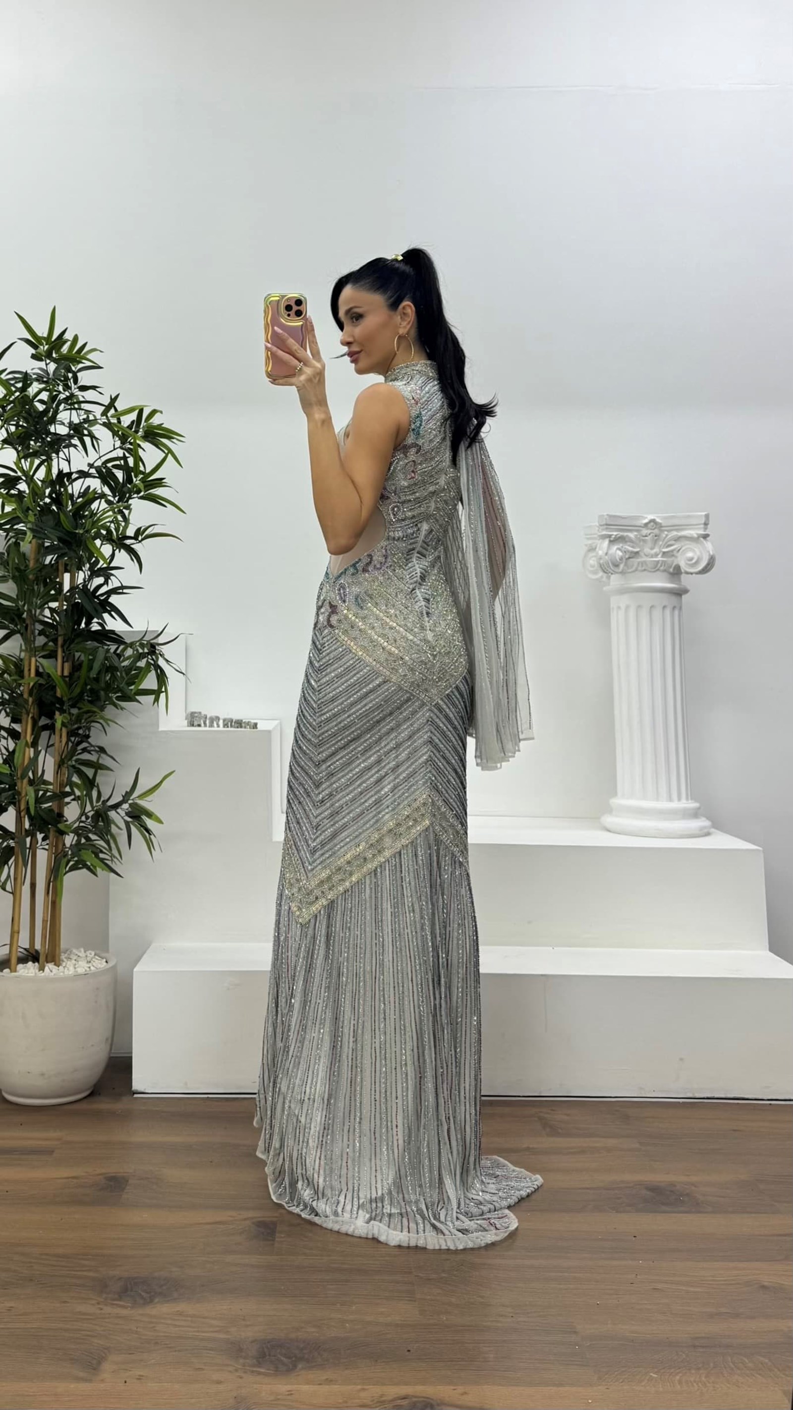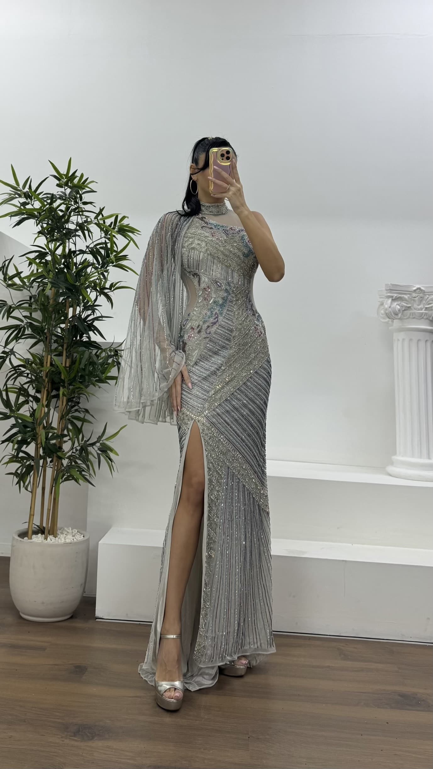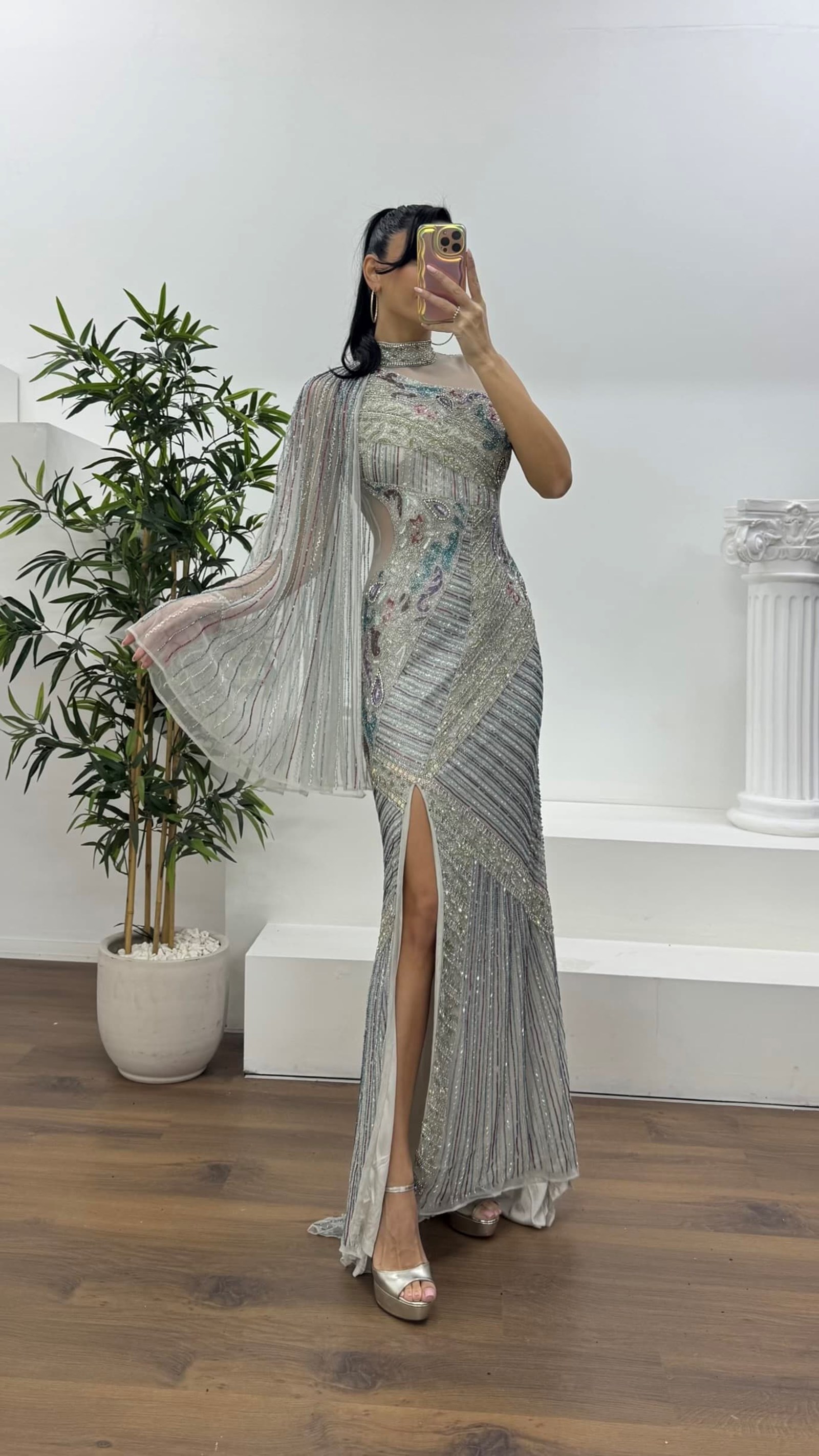 Ürün 36-40 bedene kadar uyumludur. göğüs pedli, astarlı, fermuarlı, yırtmaçlı, tek kol pelerinli, işlemeli abiye olarak tasarlanmıştır.