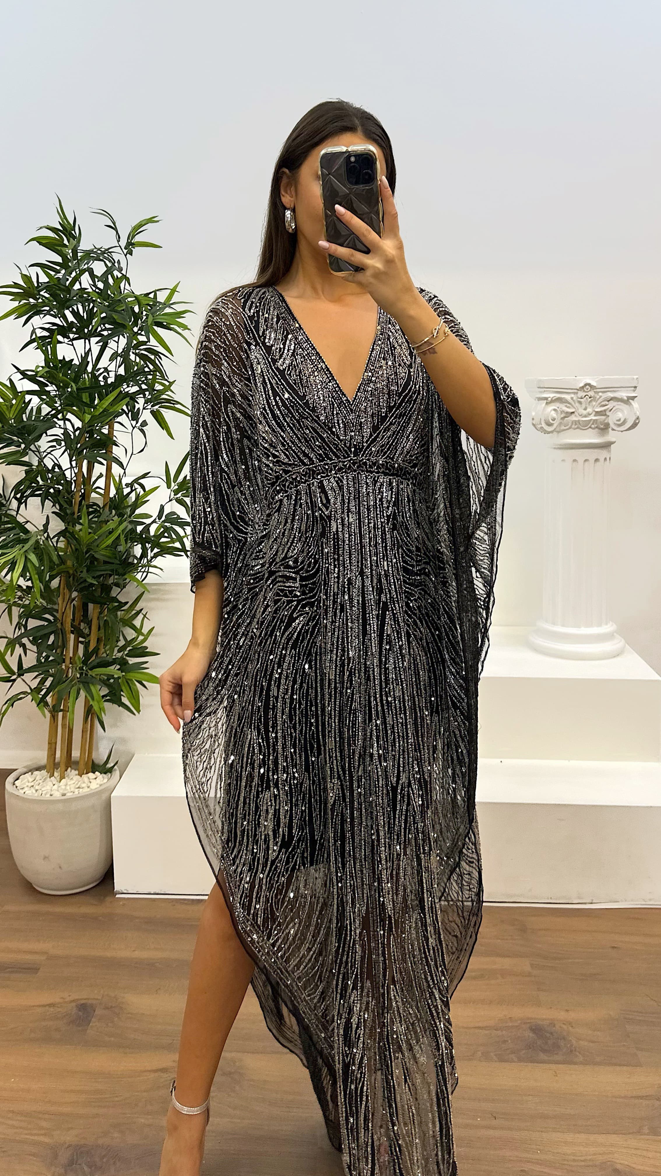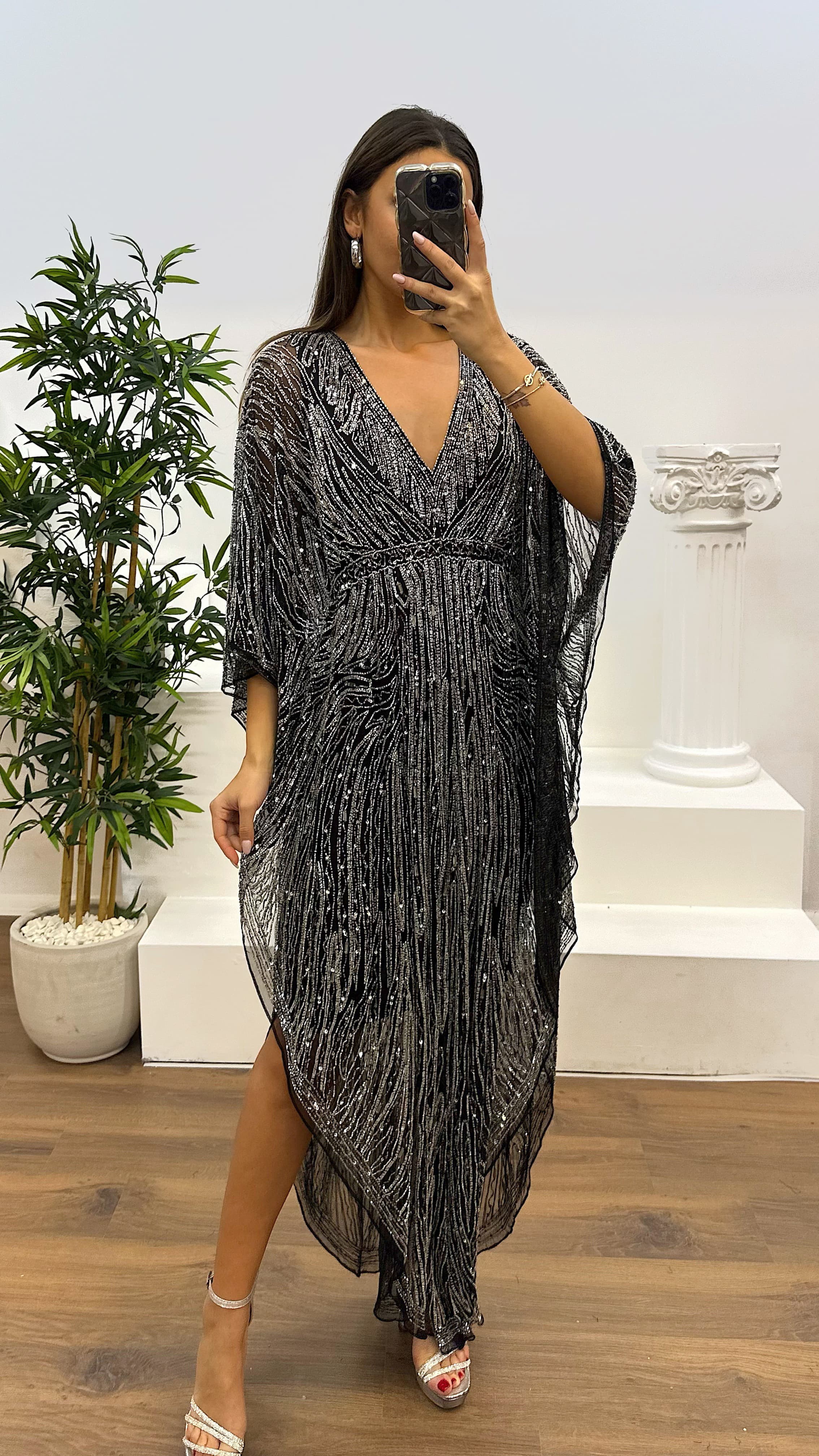 • Antrasit Yarasa Kol El İşlemesi Tasarım Abiye Elbise