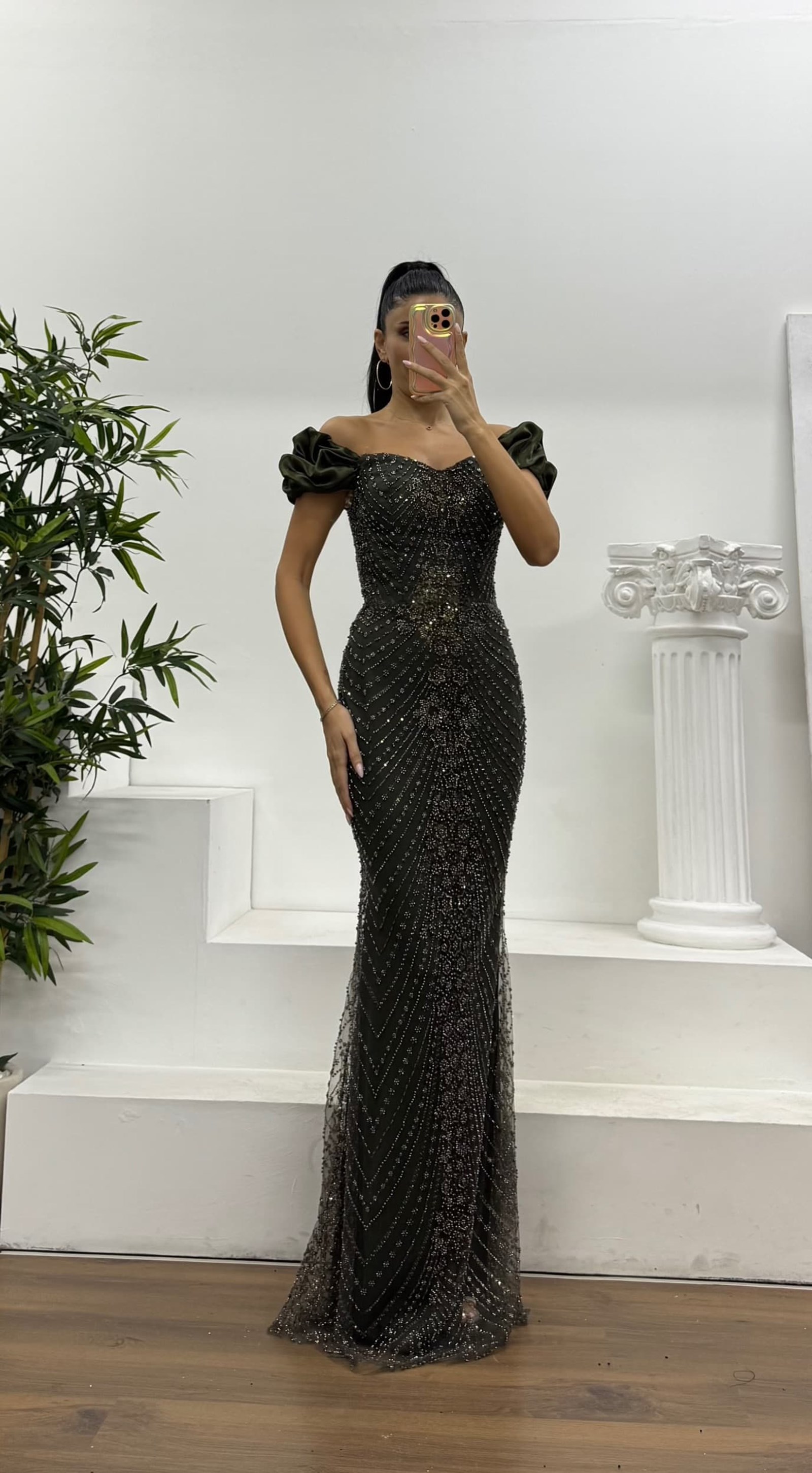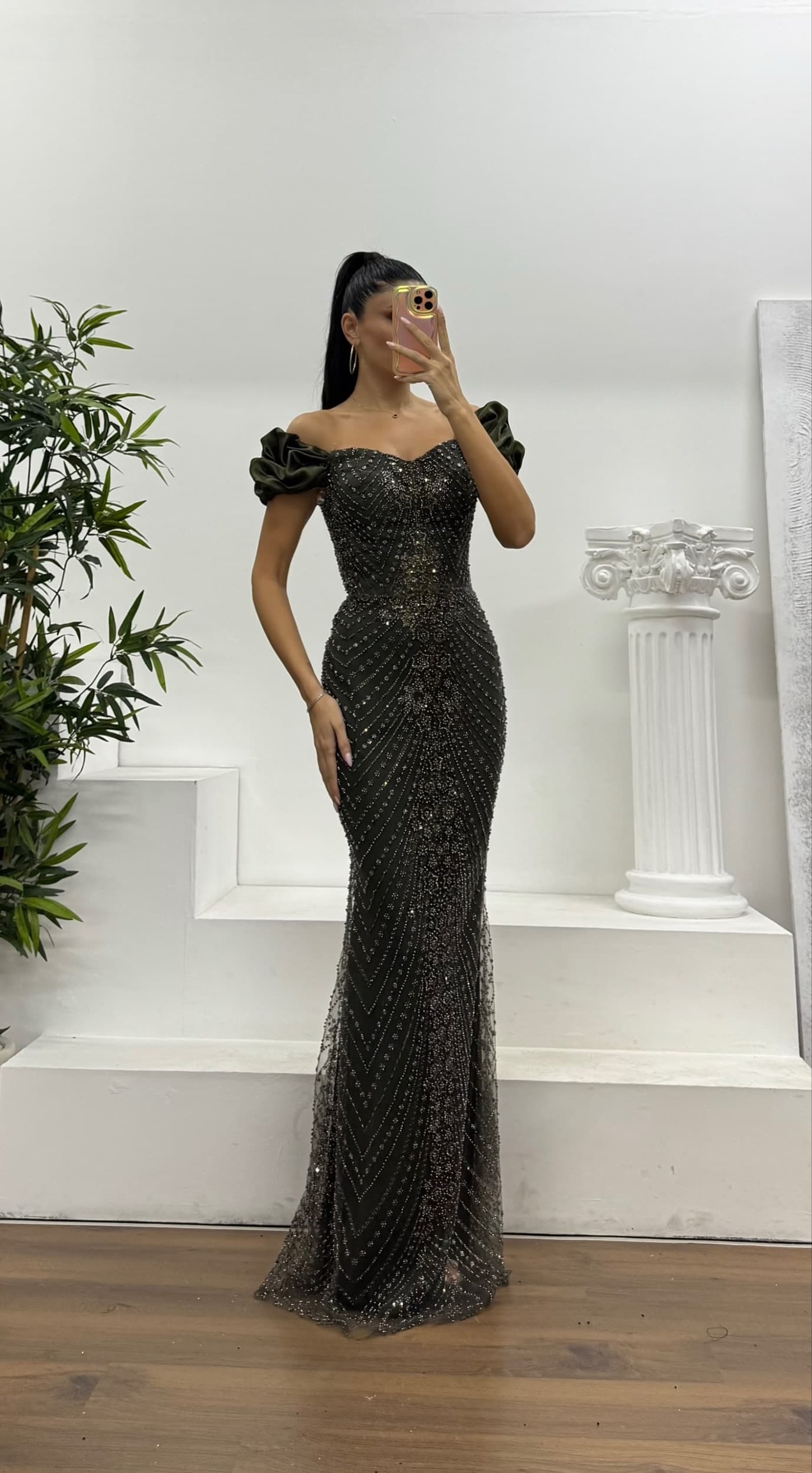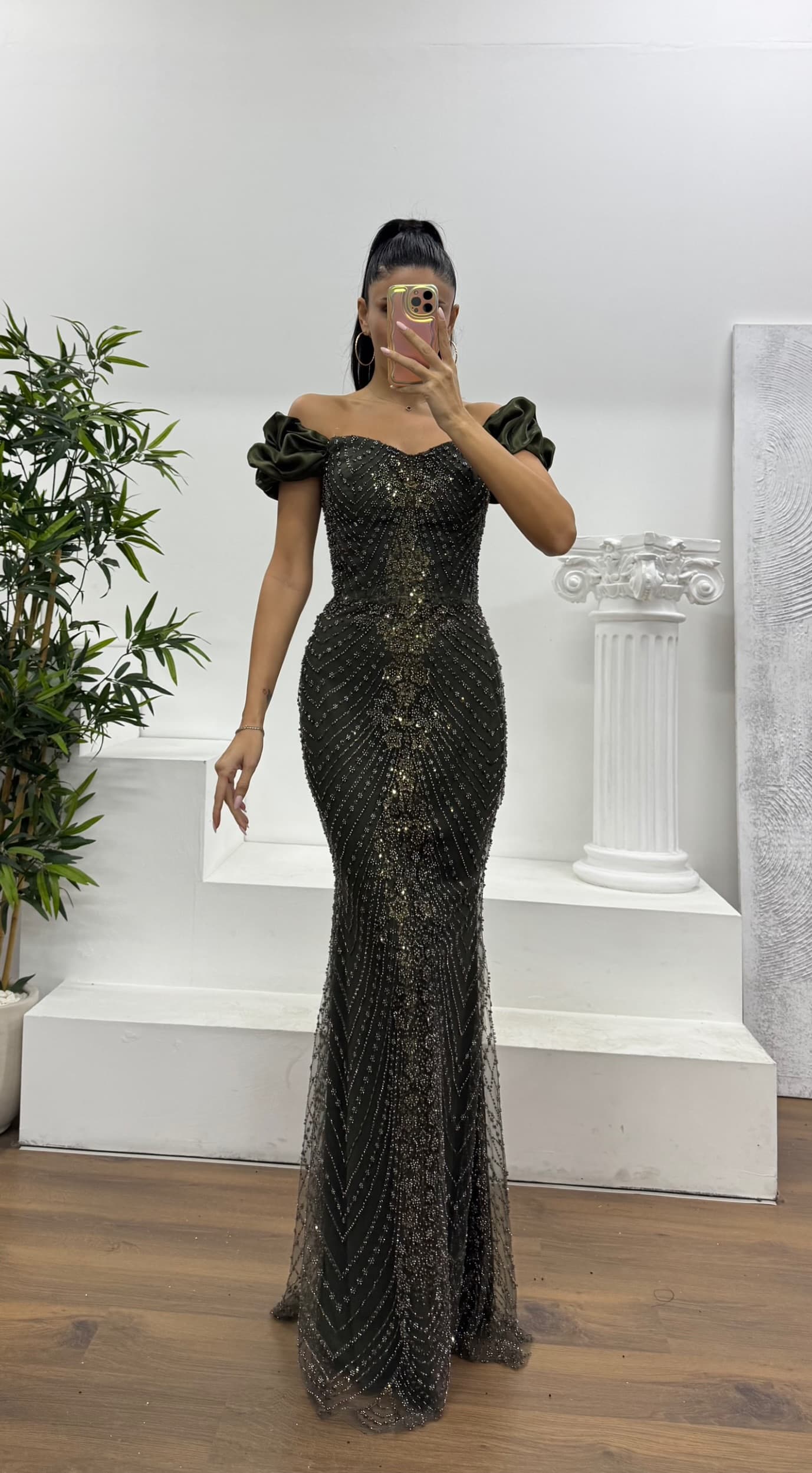 • Haki Balon Kol İşlemeli Abiye Elbise