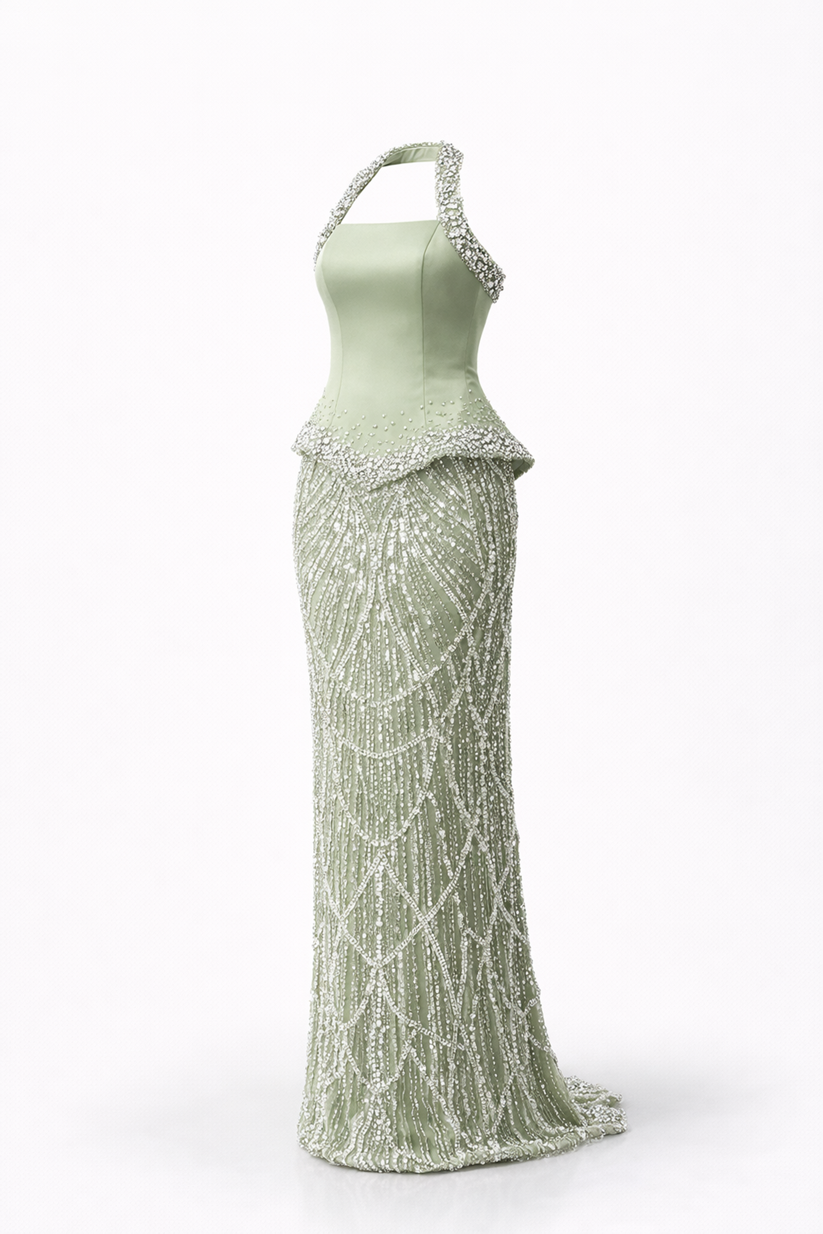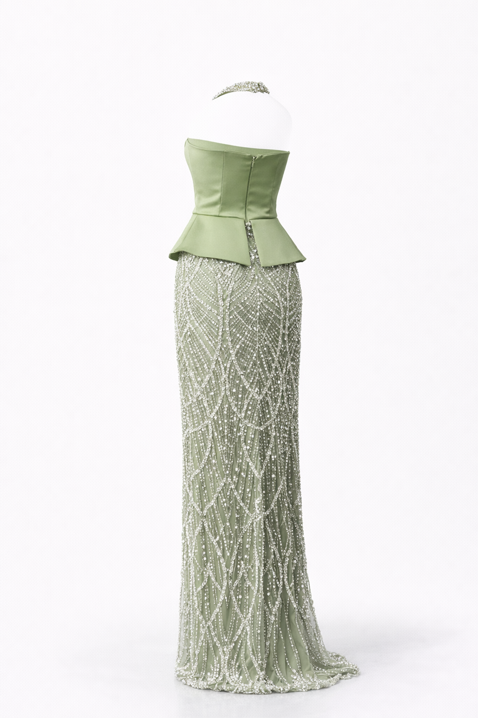 Haki Halter Yaka İnci Detay Abiye Elbise