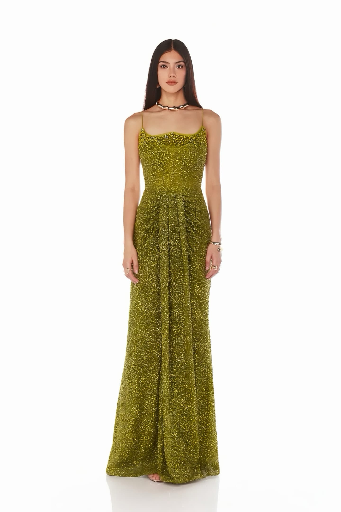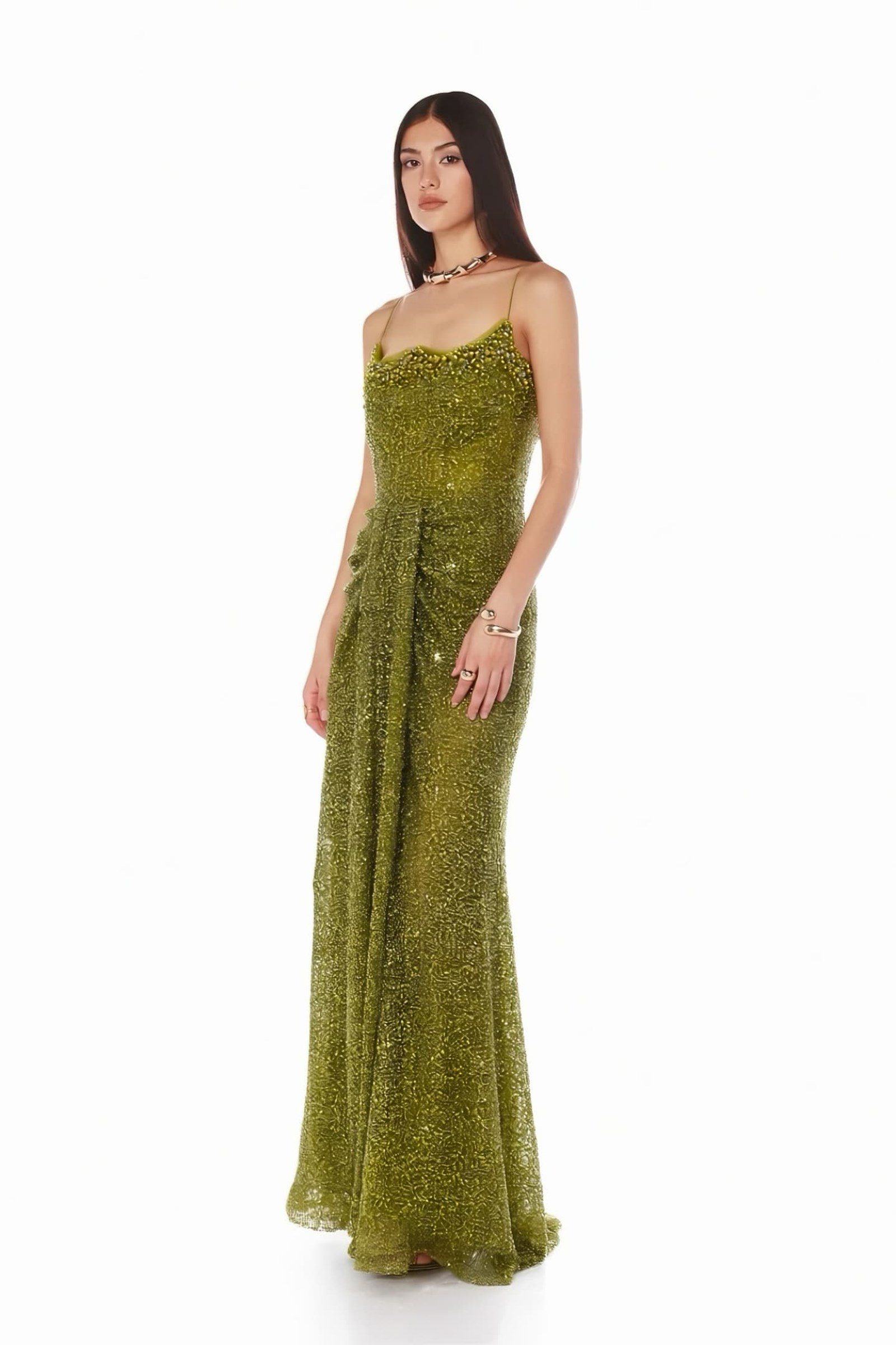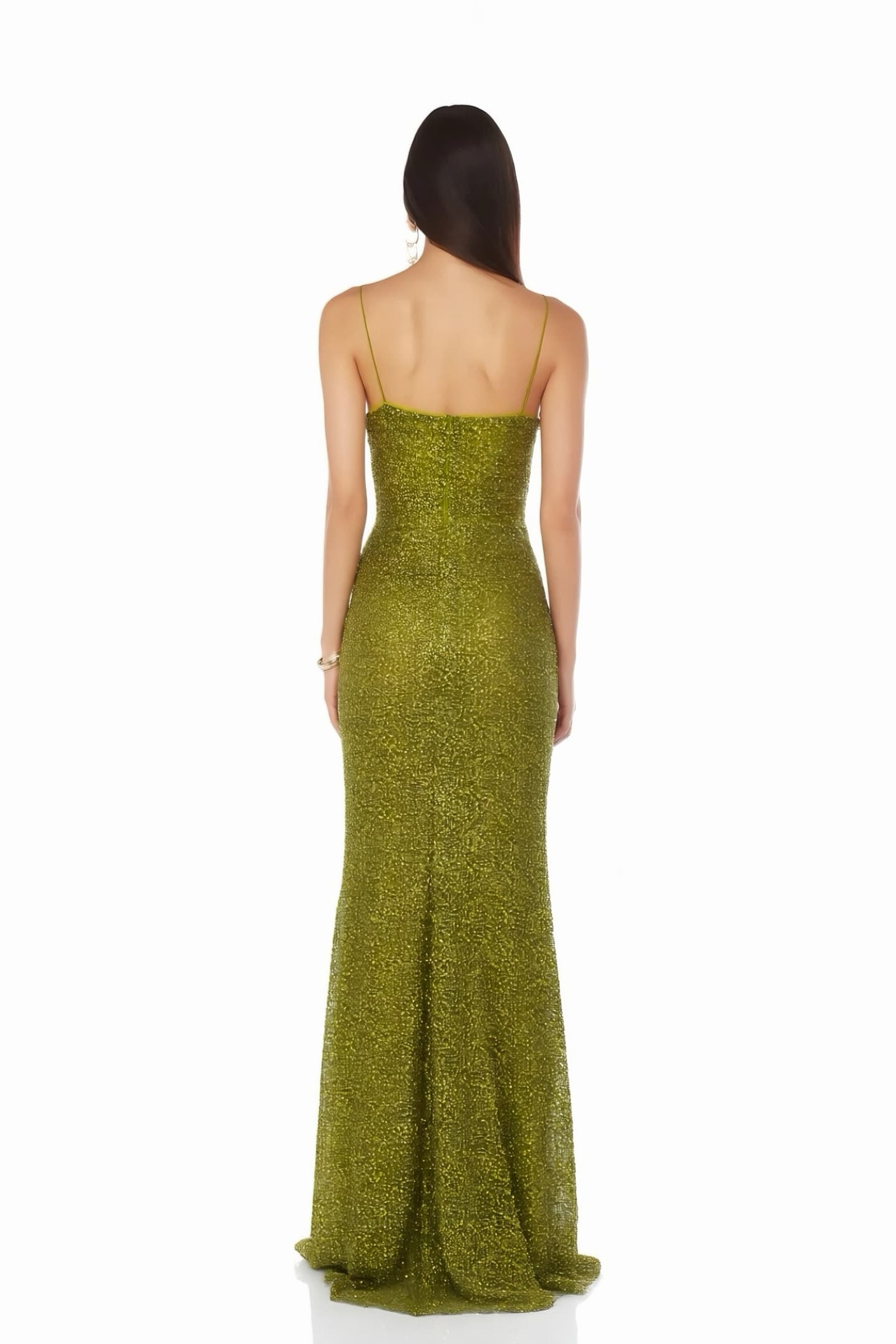 • Haki İnce Askılı Işıltılı Abiye Elbise