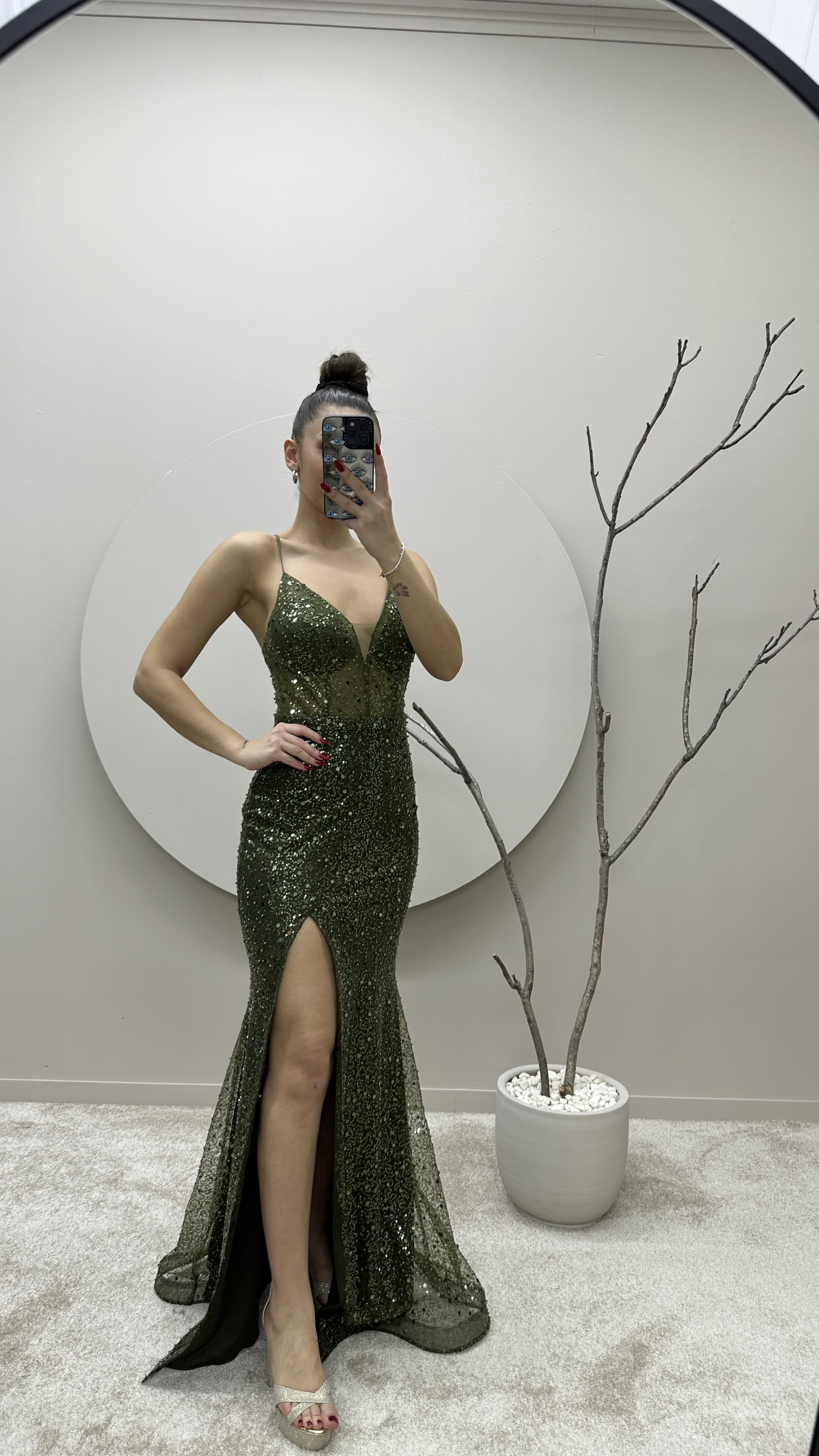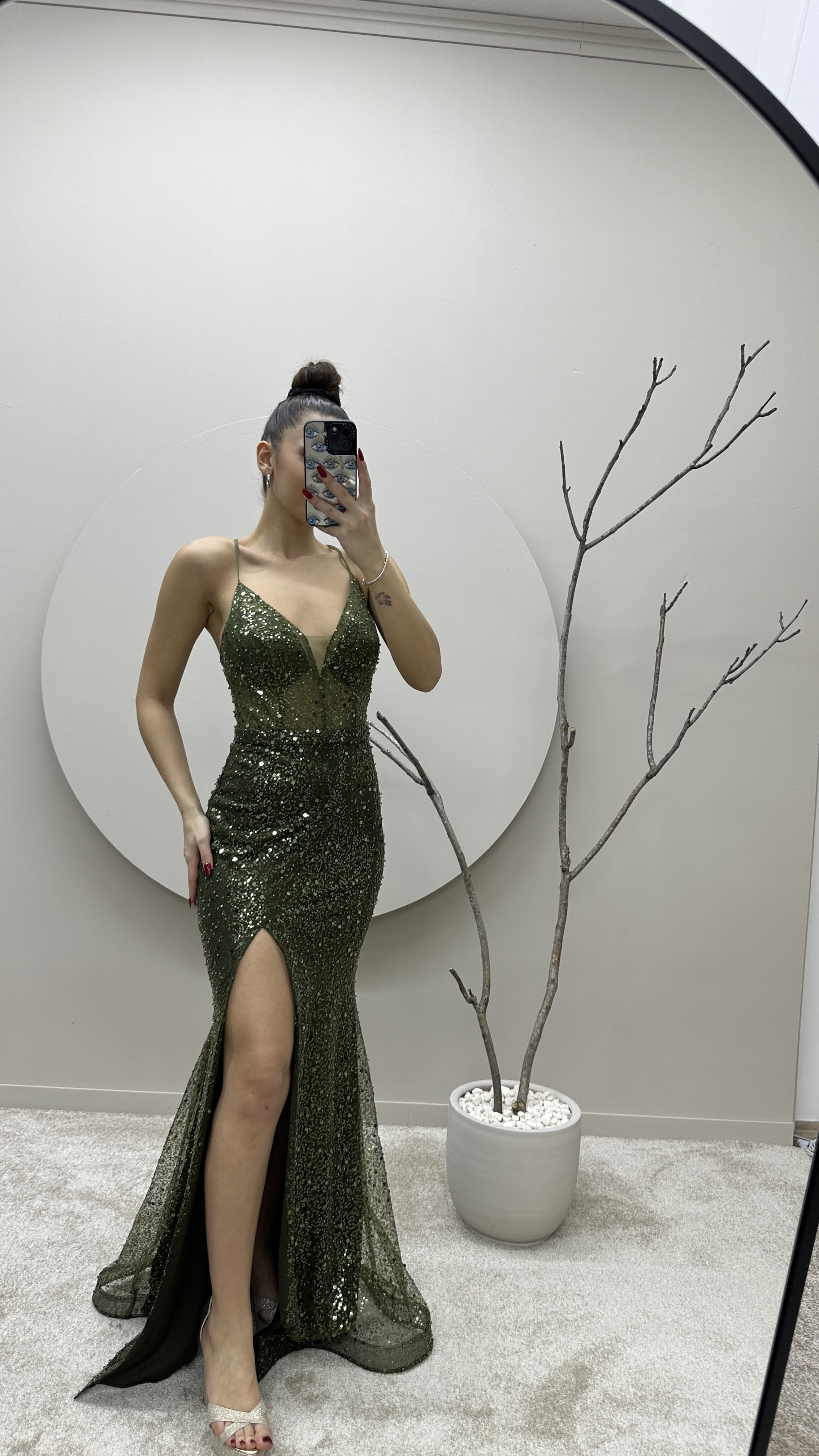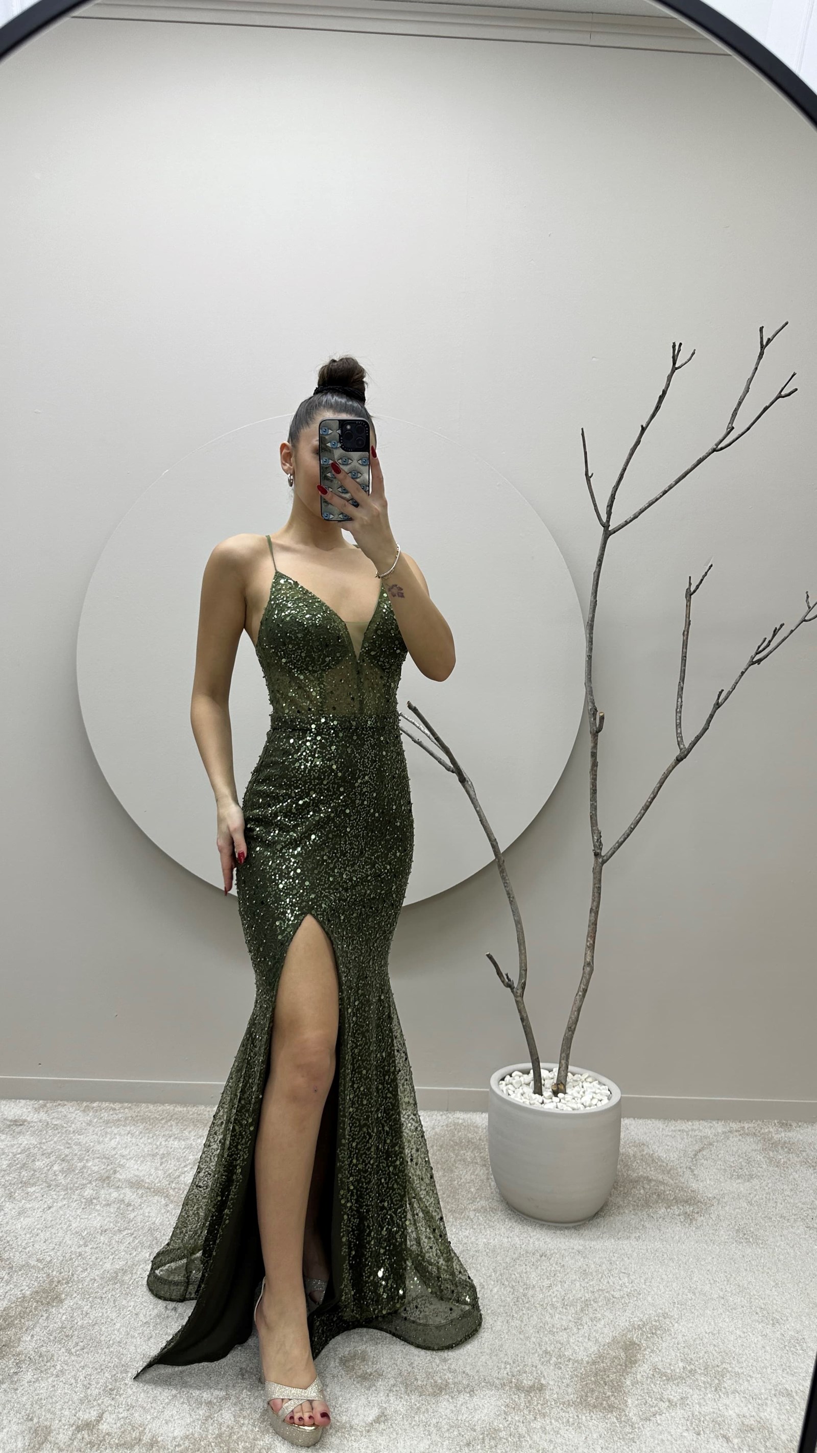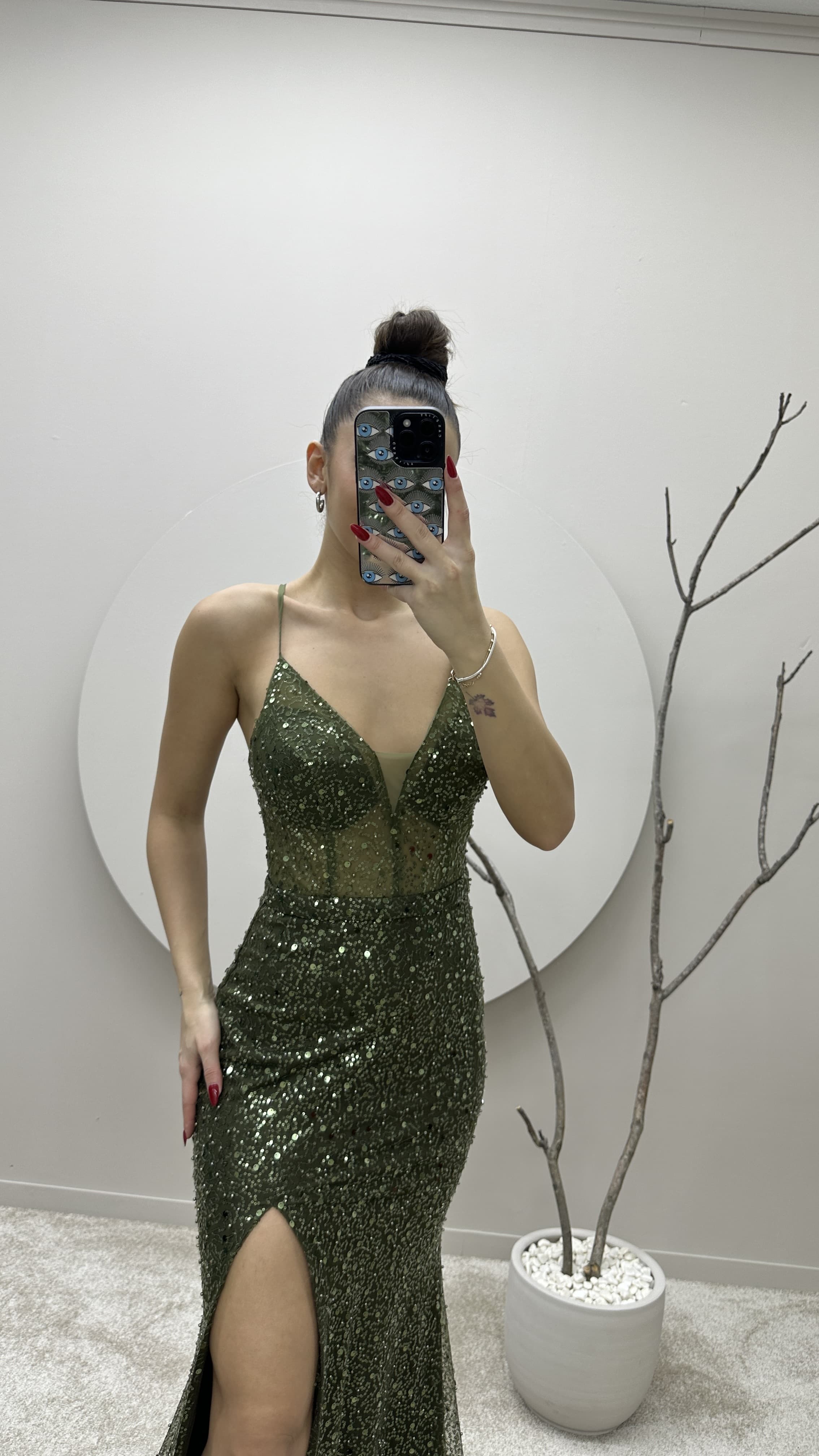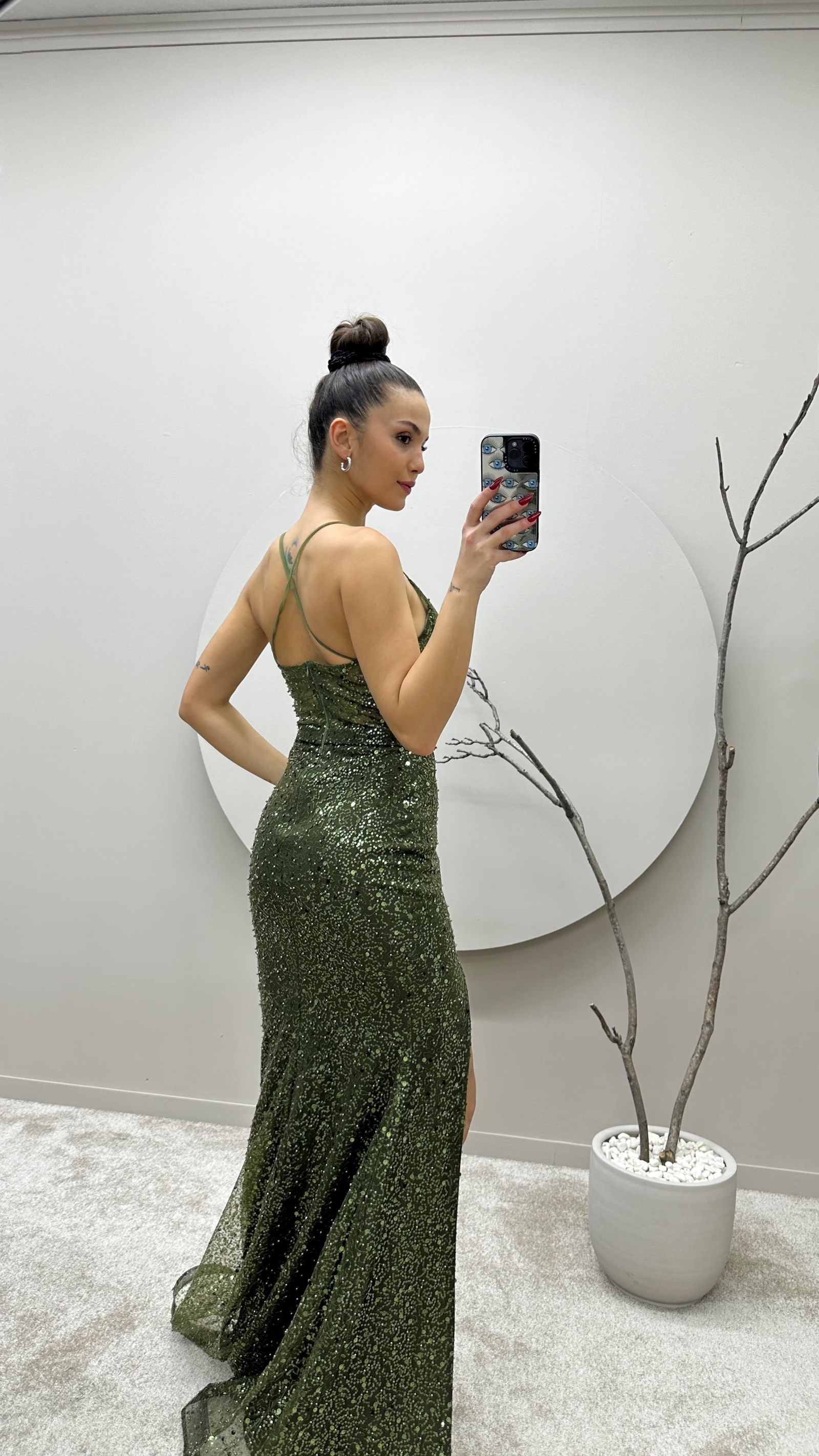 • Haki İp Askılı Yırtmaçlı Tasarım Pul Detay Abiye Elbise