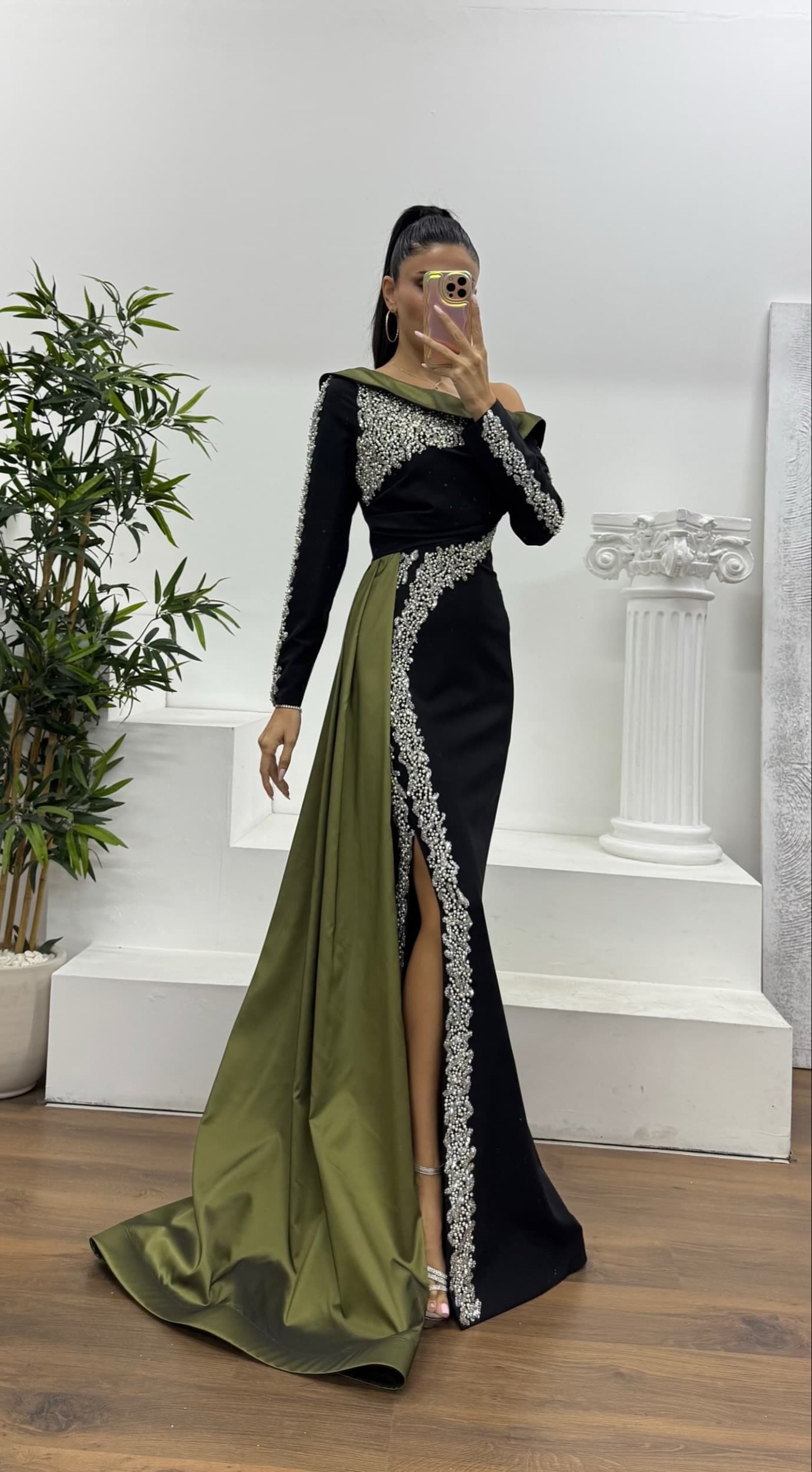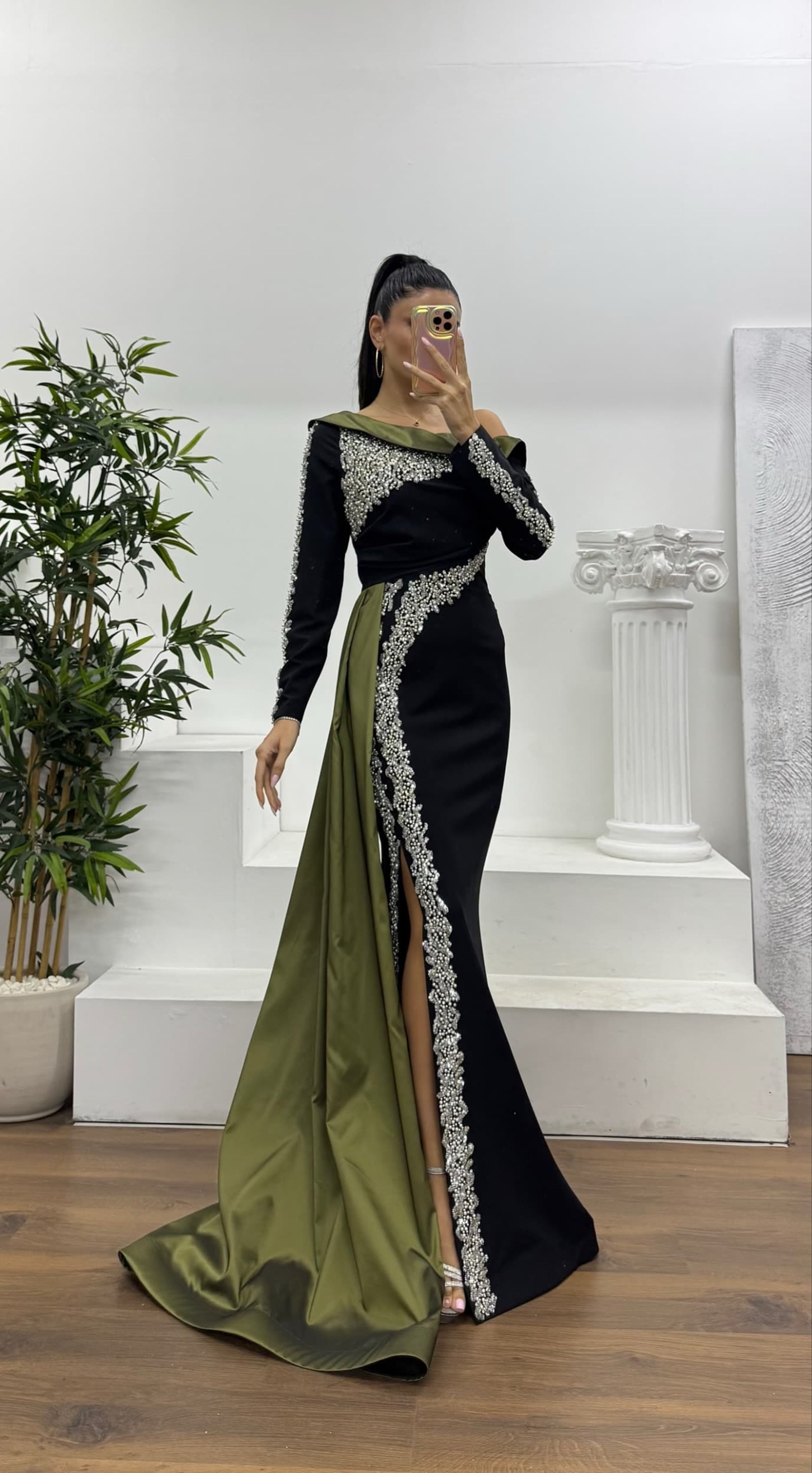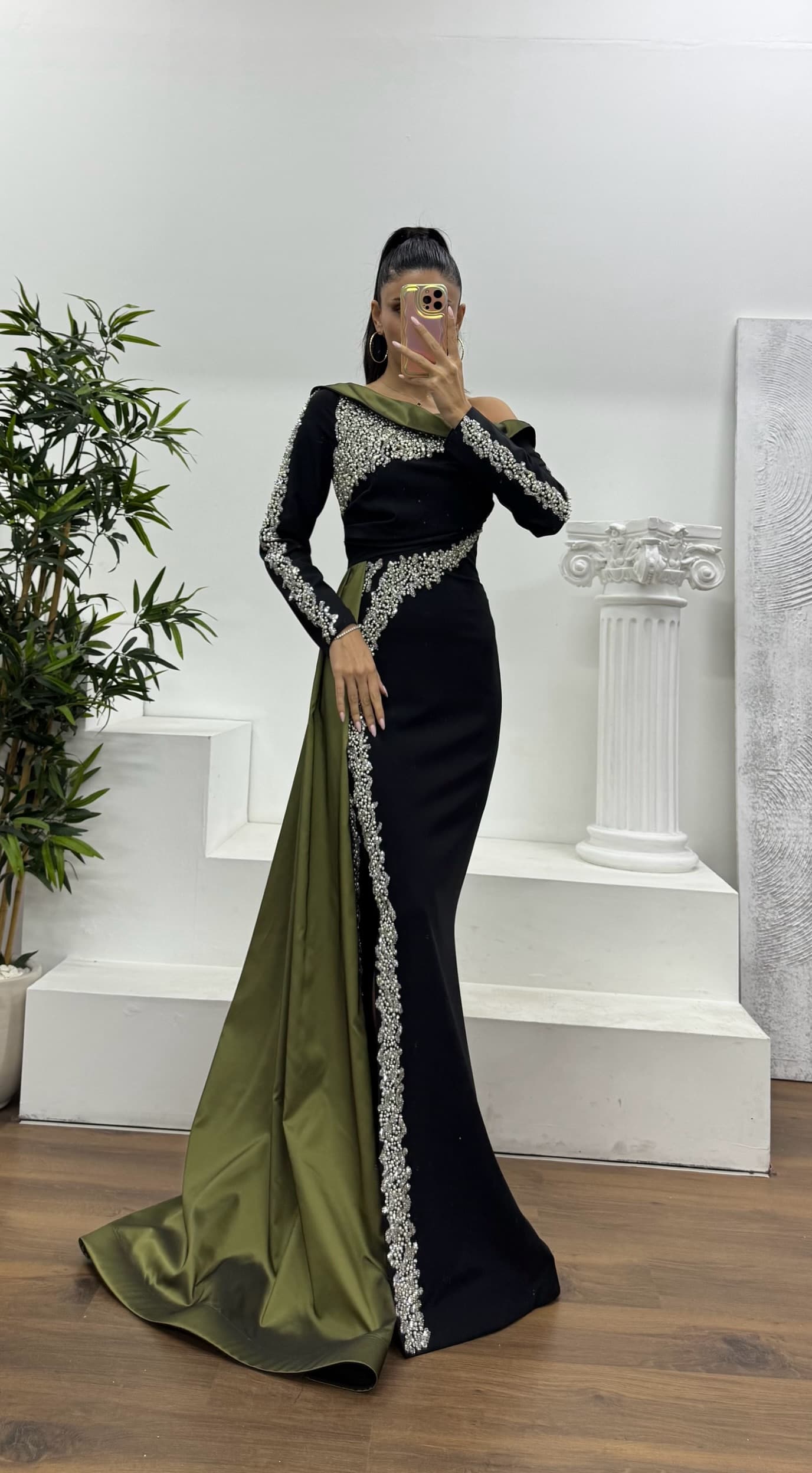 • Haki Kayık Yaka İnci İşlemeli Abiye Elbise
