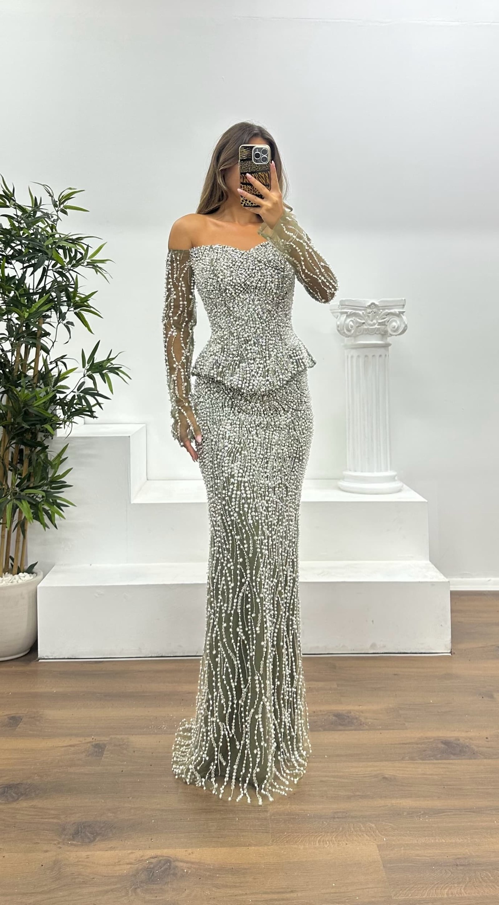 Kayık yaka işlemeli abiye elbise