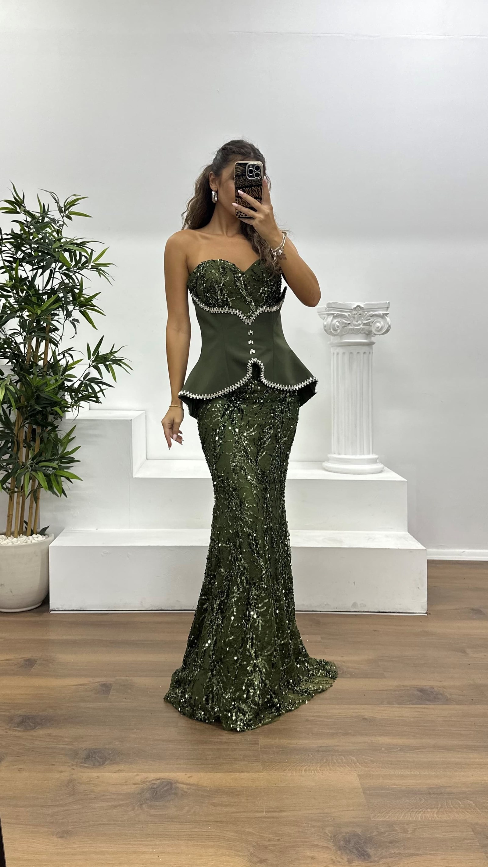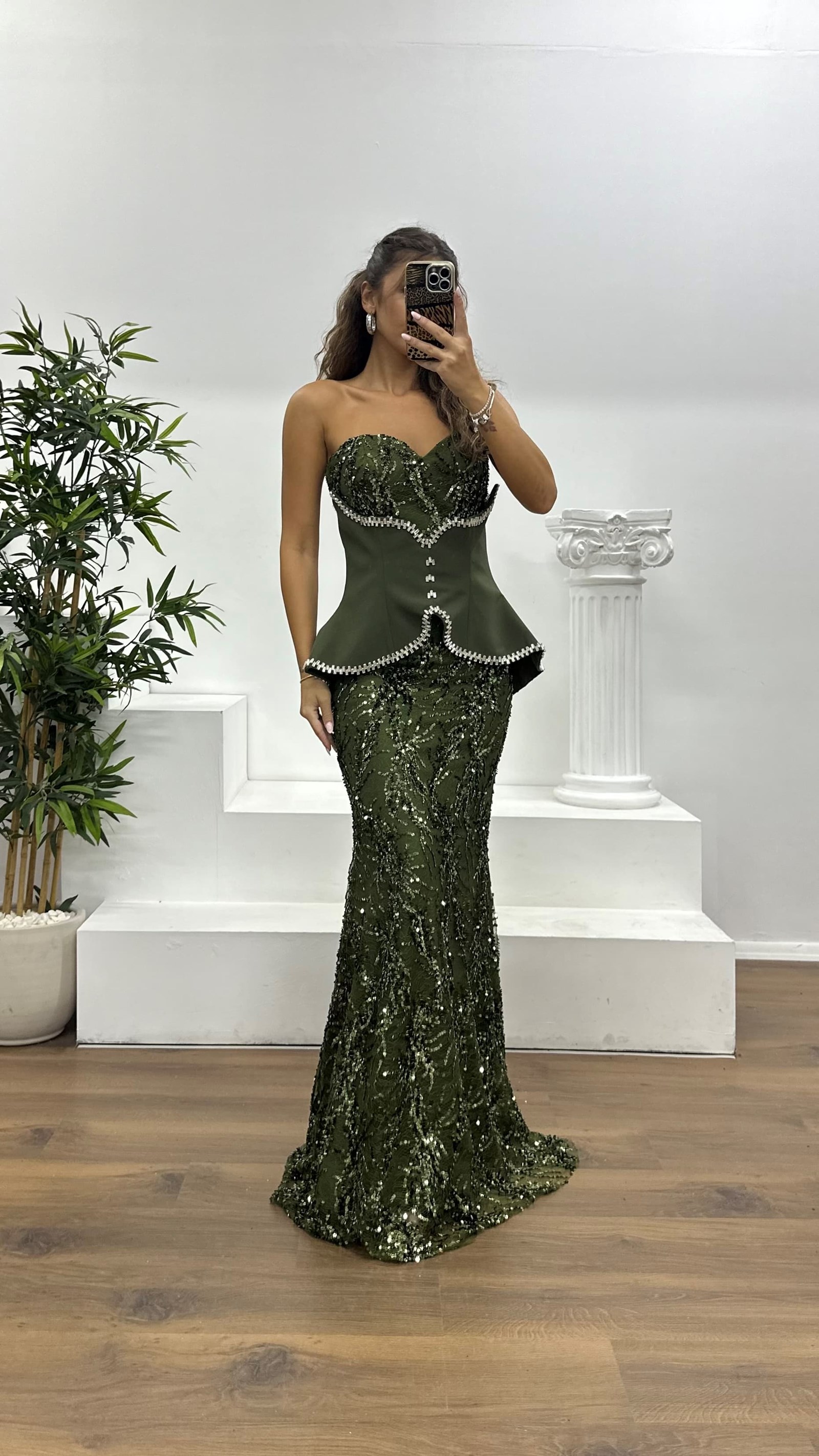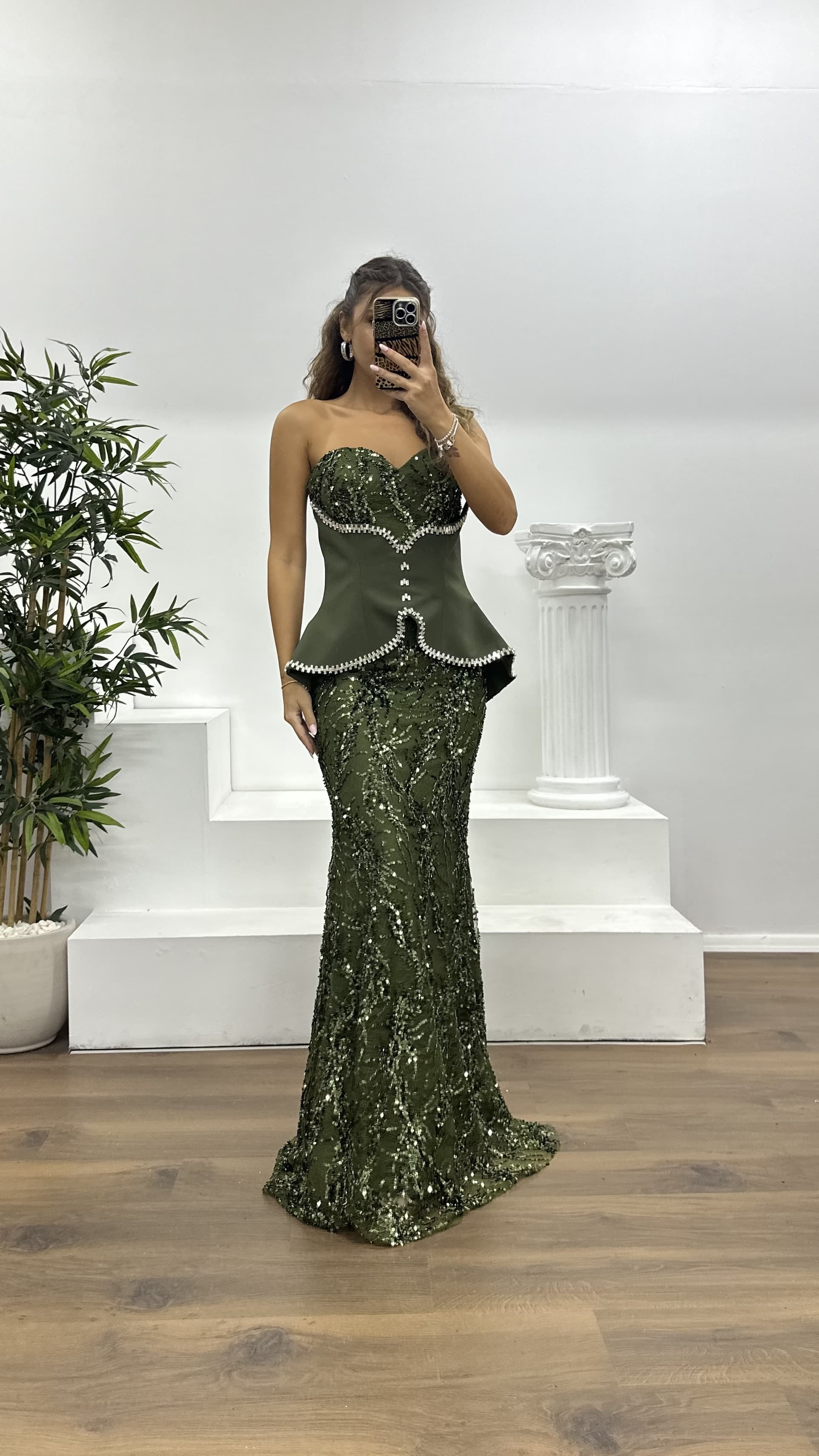 • Haki Straplez Korse Detay İşlemeli Abiye Elbise