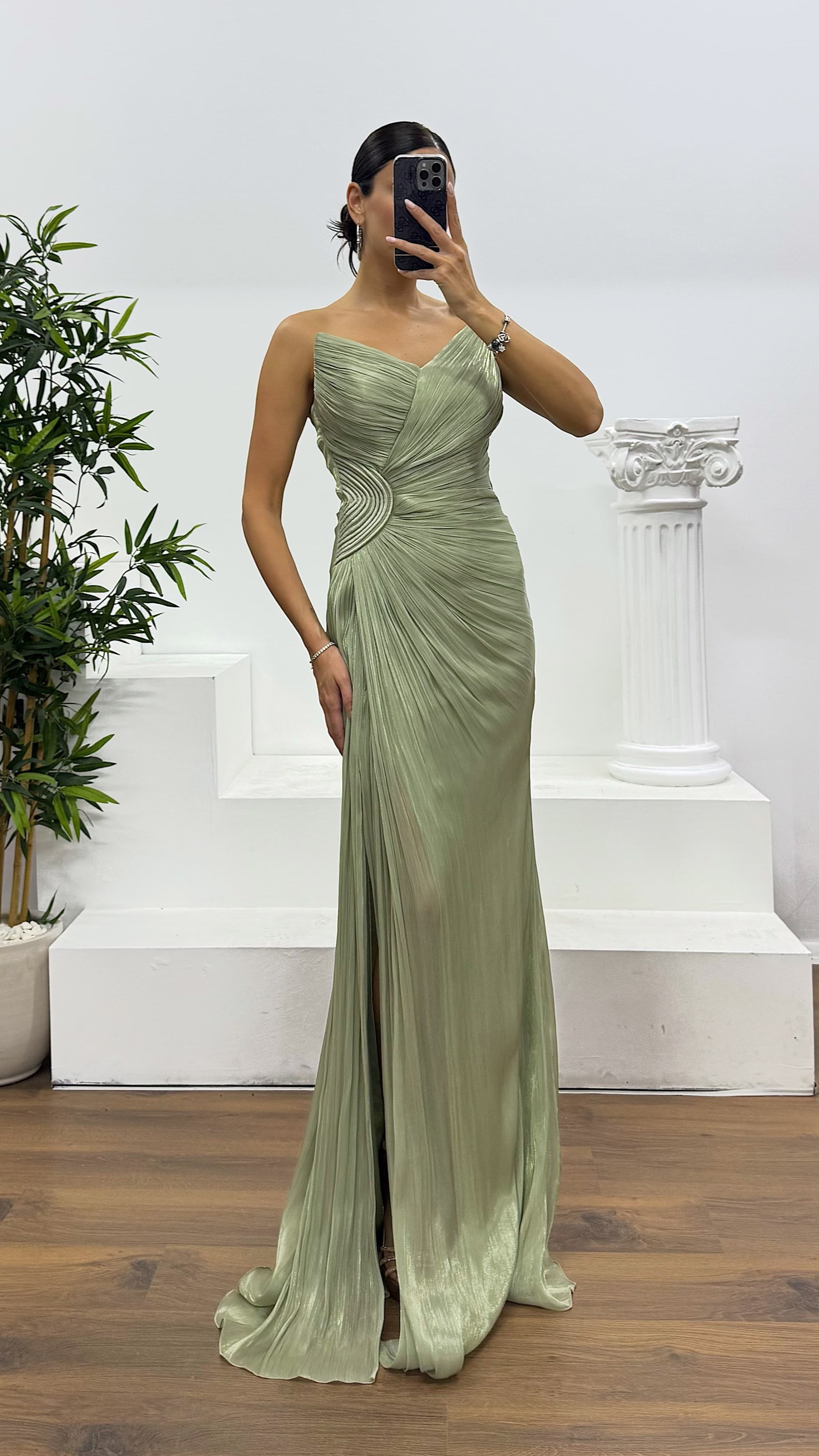 • Haki Straplez Şifon Abiye Elbise