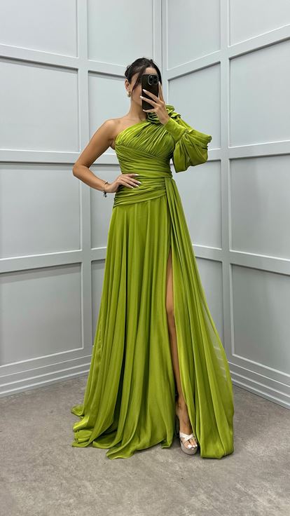 • Yeşil Tek Kol Omuz Detay Tasarım Abiye Elbise