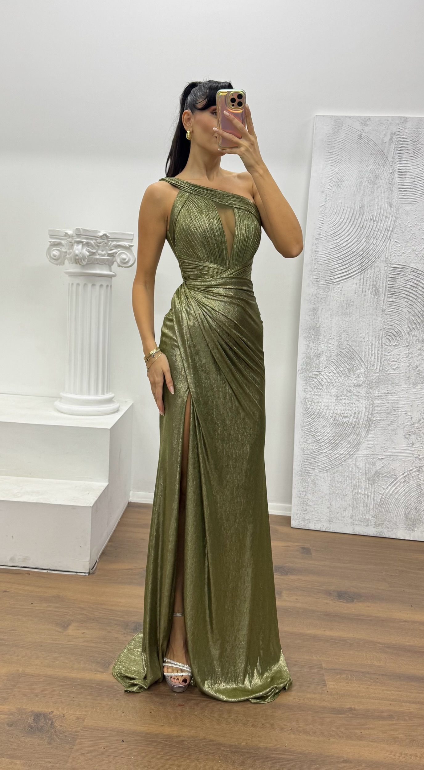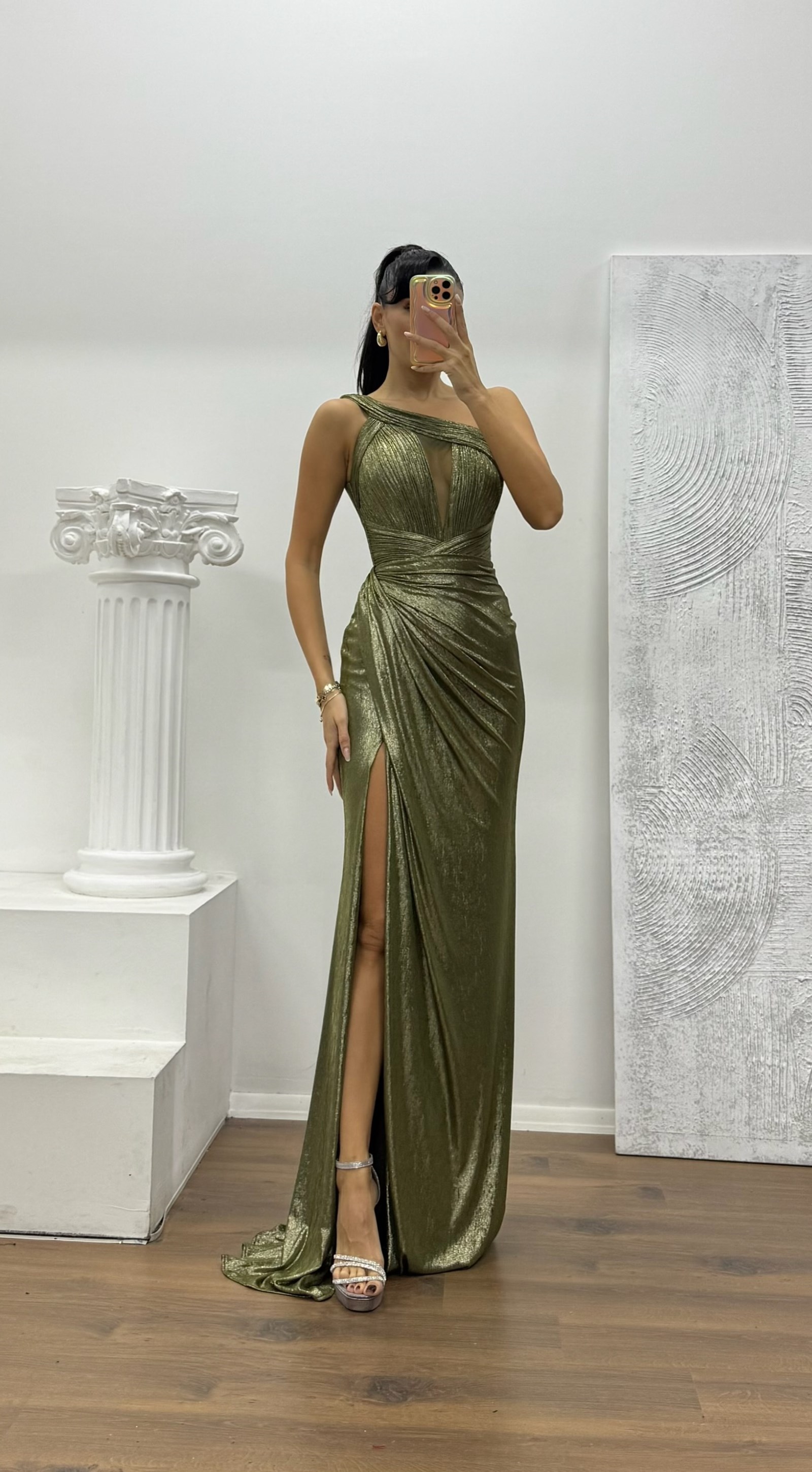Ürün 36-44 bedene kadar uyumlu, göğüs pedli, astarlı, arka kapama fermuar, yırtmaçlı abiye olarak tasarlanmıştır.
