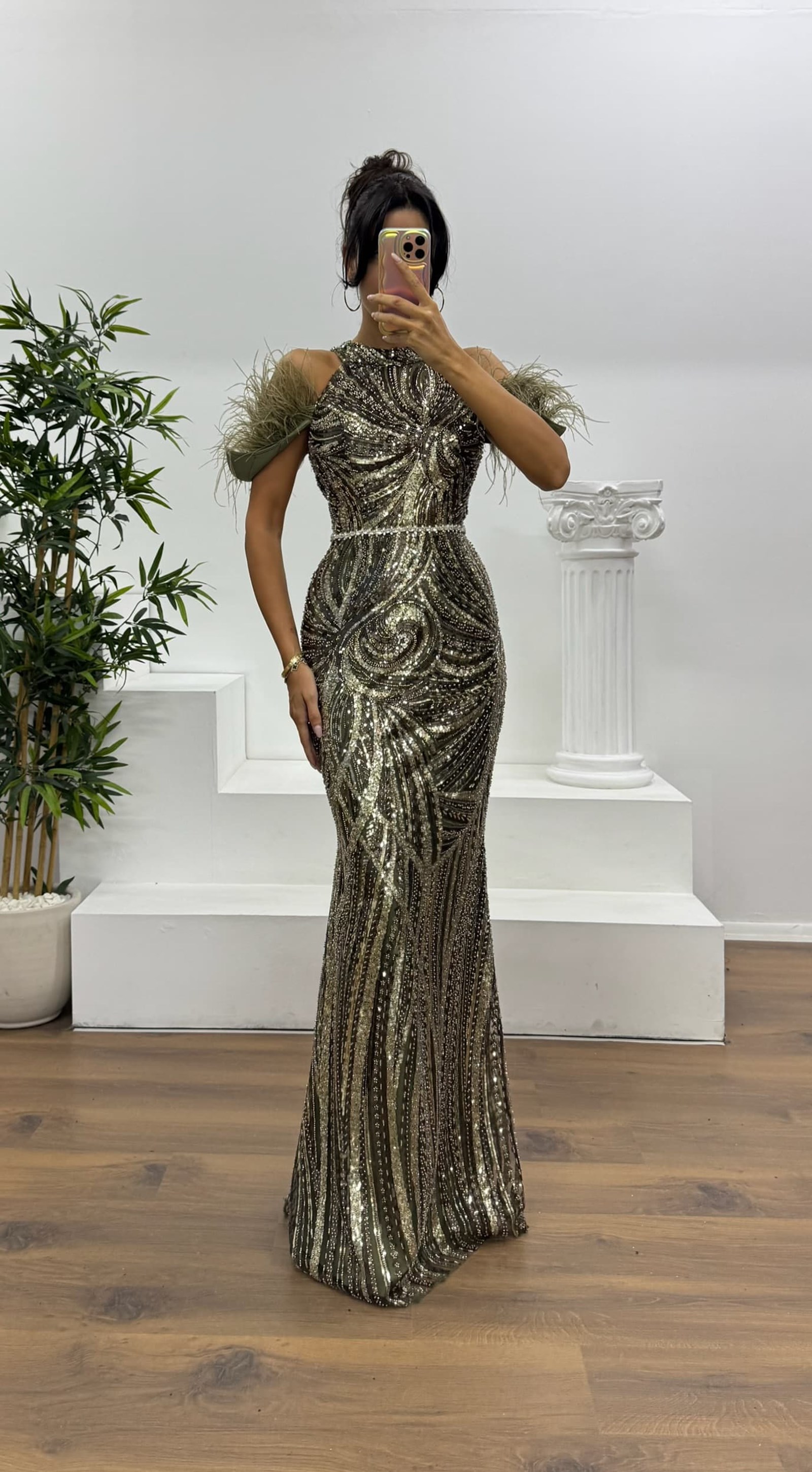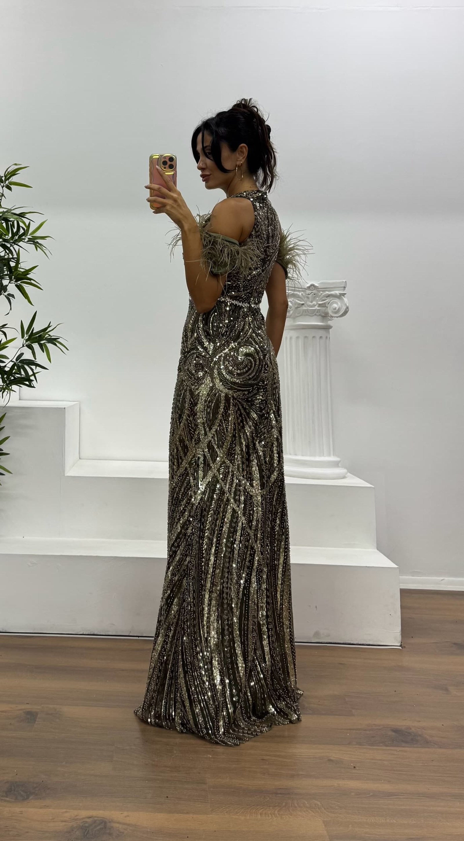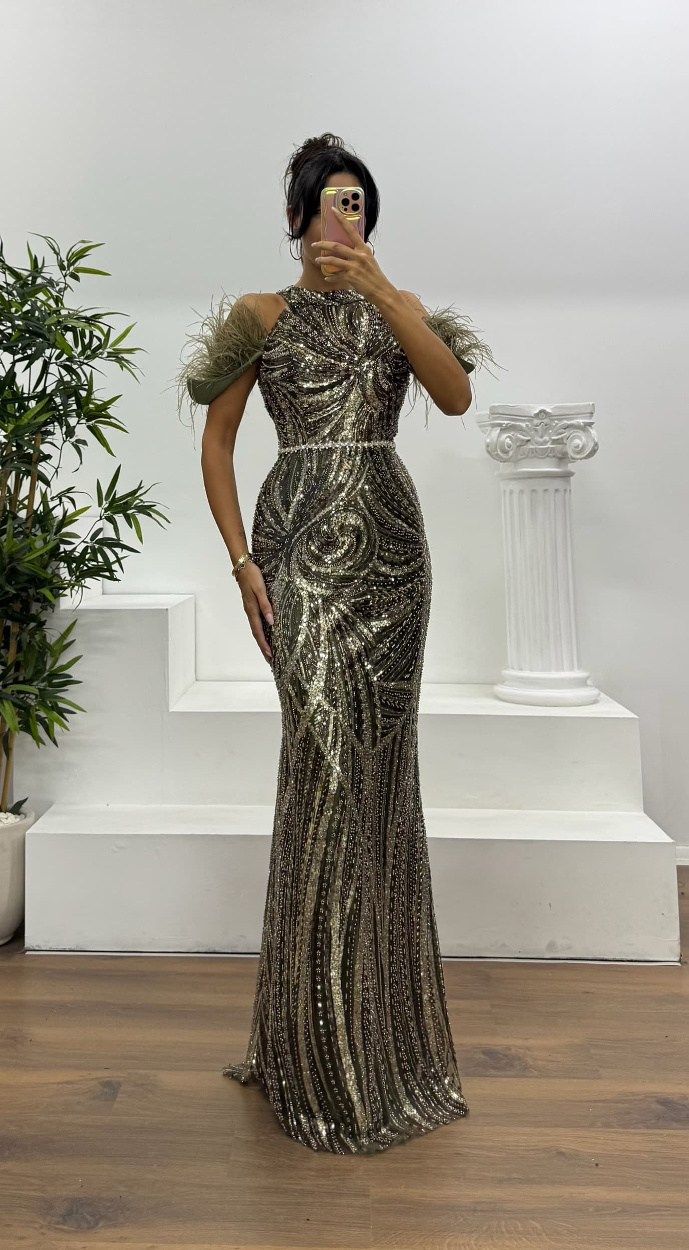 • Haki Tüy Detay İşlemeli Abiye Elbise