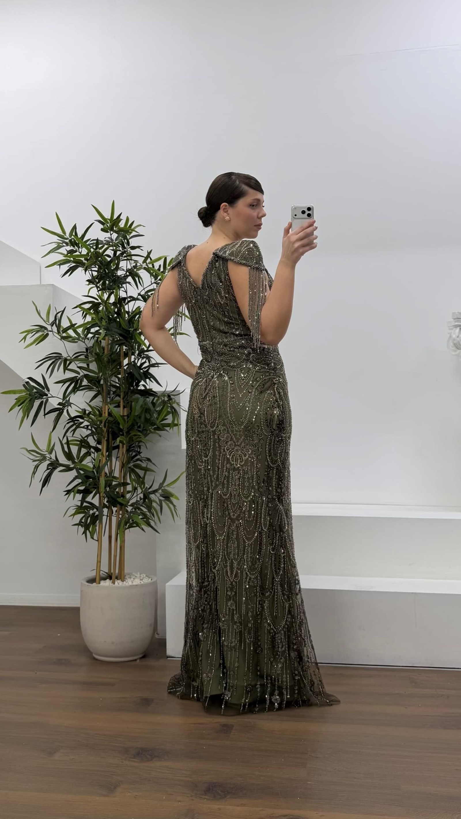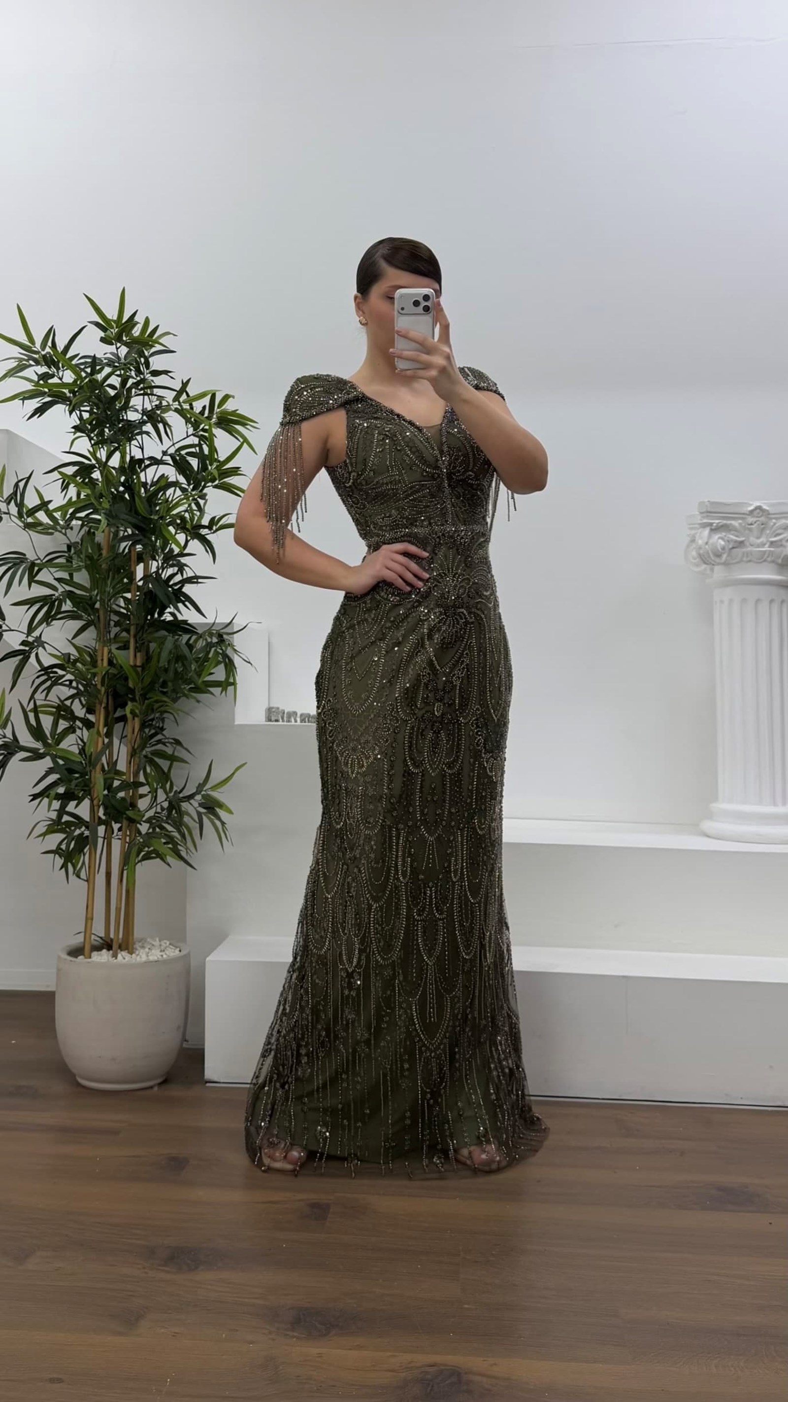 • Haki V Yaka   Zincir Püskül Detaylı Abiye Elbise
