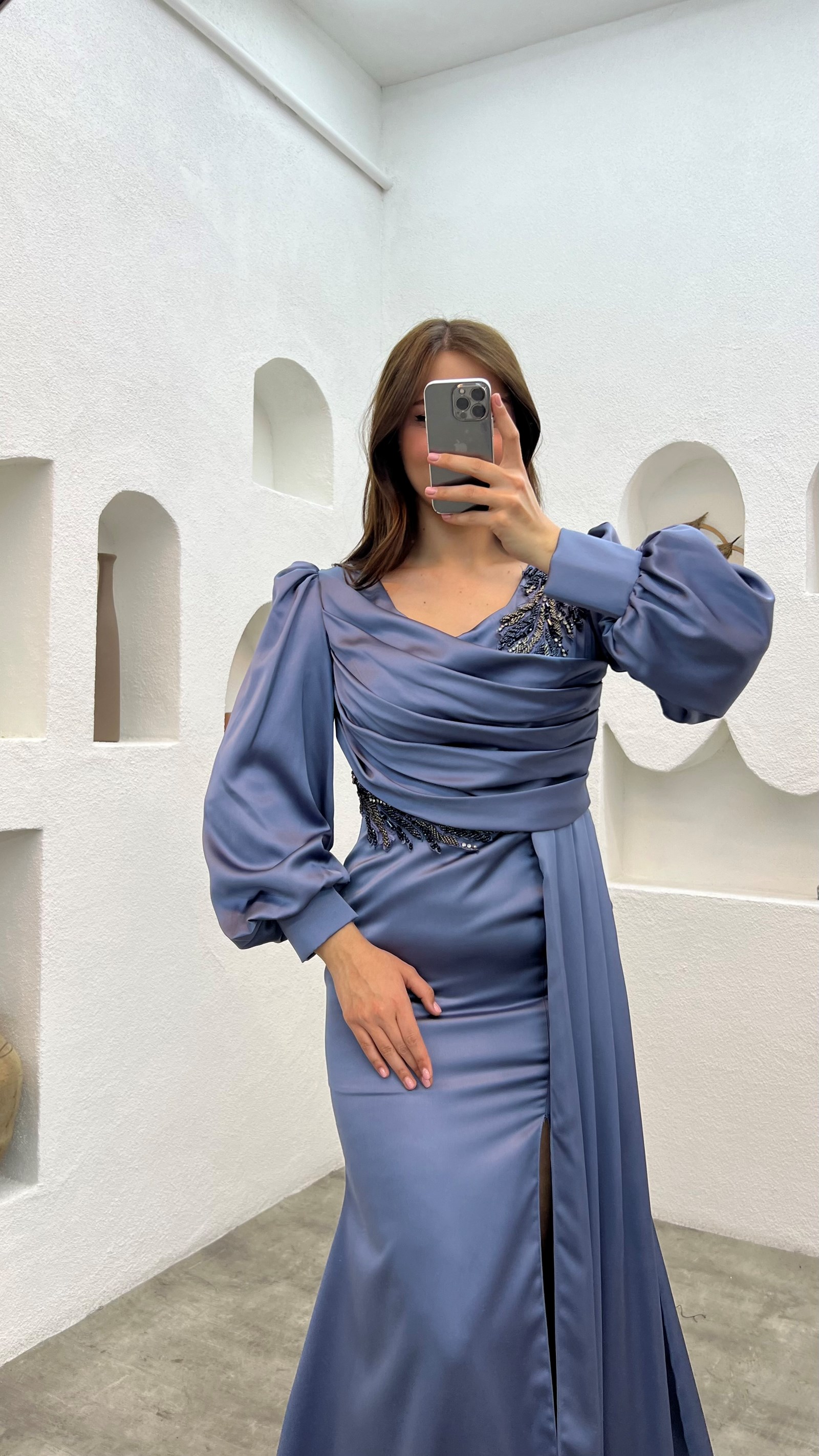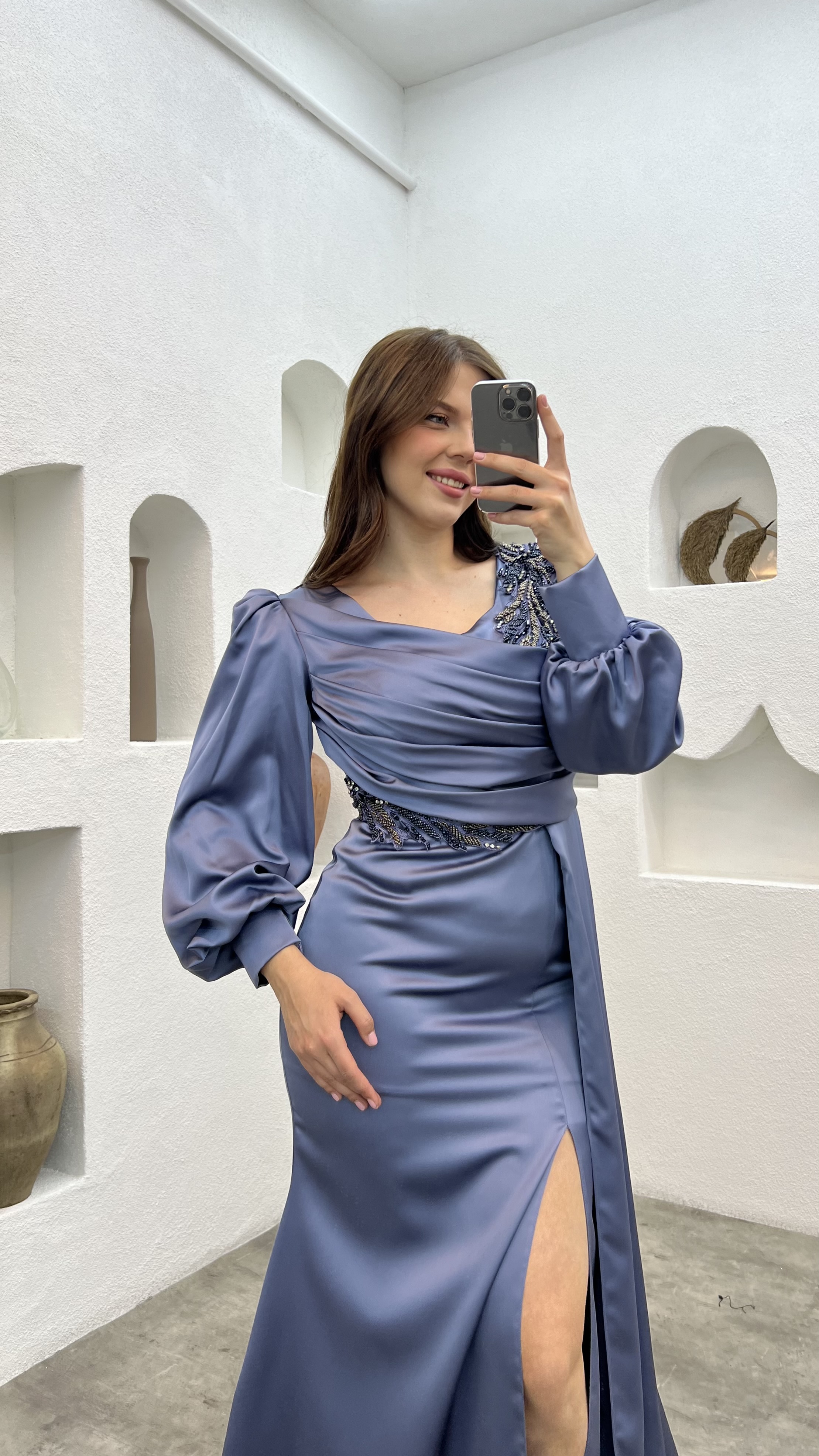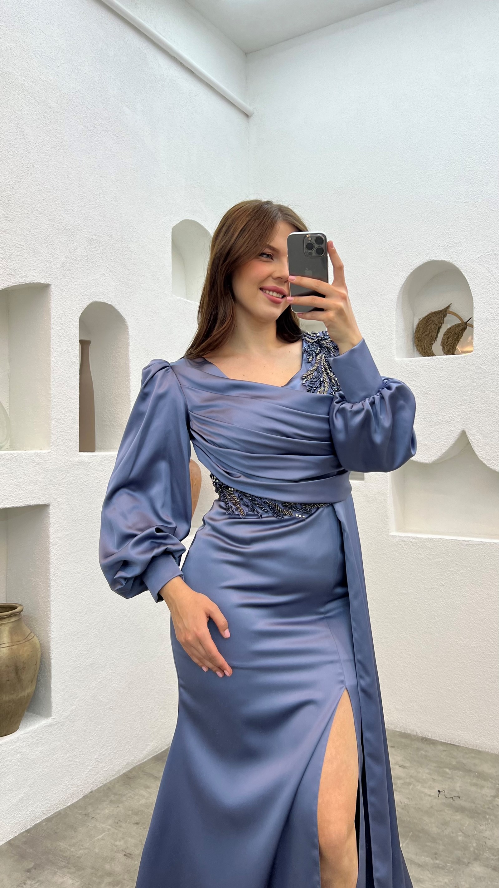 • İndigo Balon Kol Göğsü İşlemeli Büyük Beden Abiye Elbise