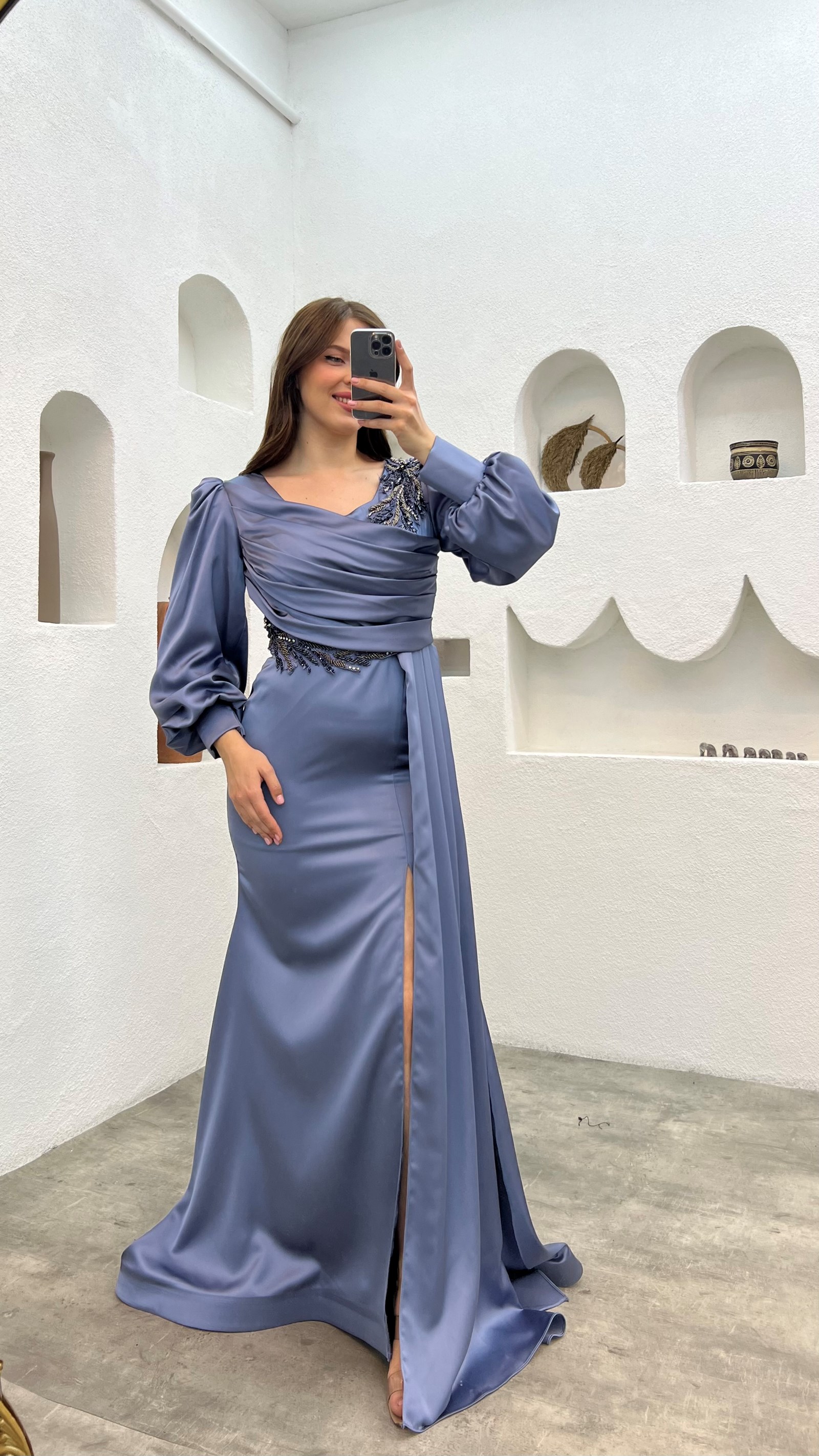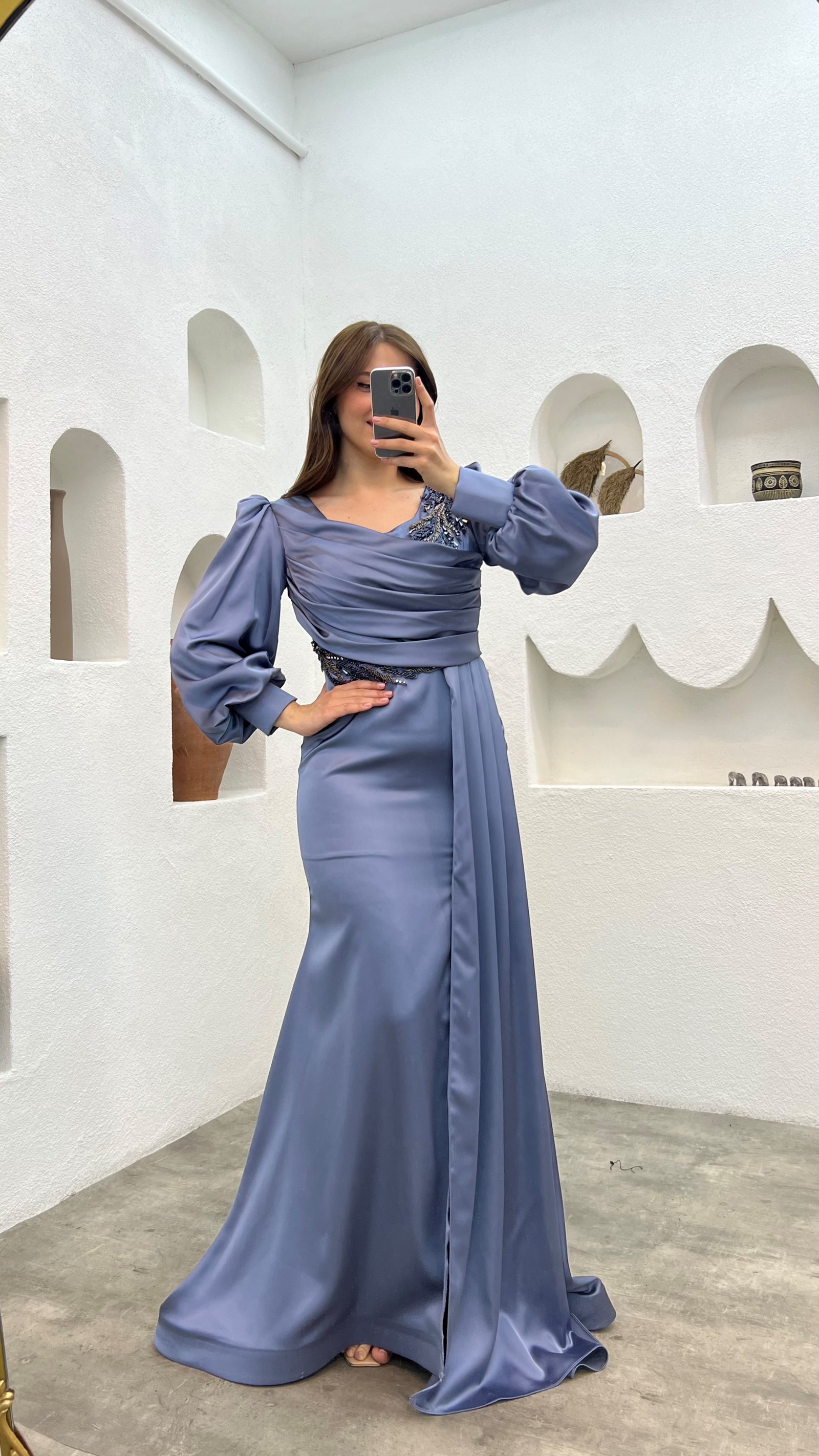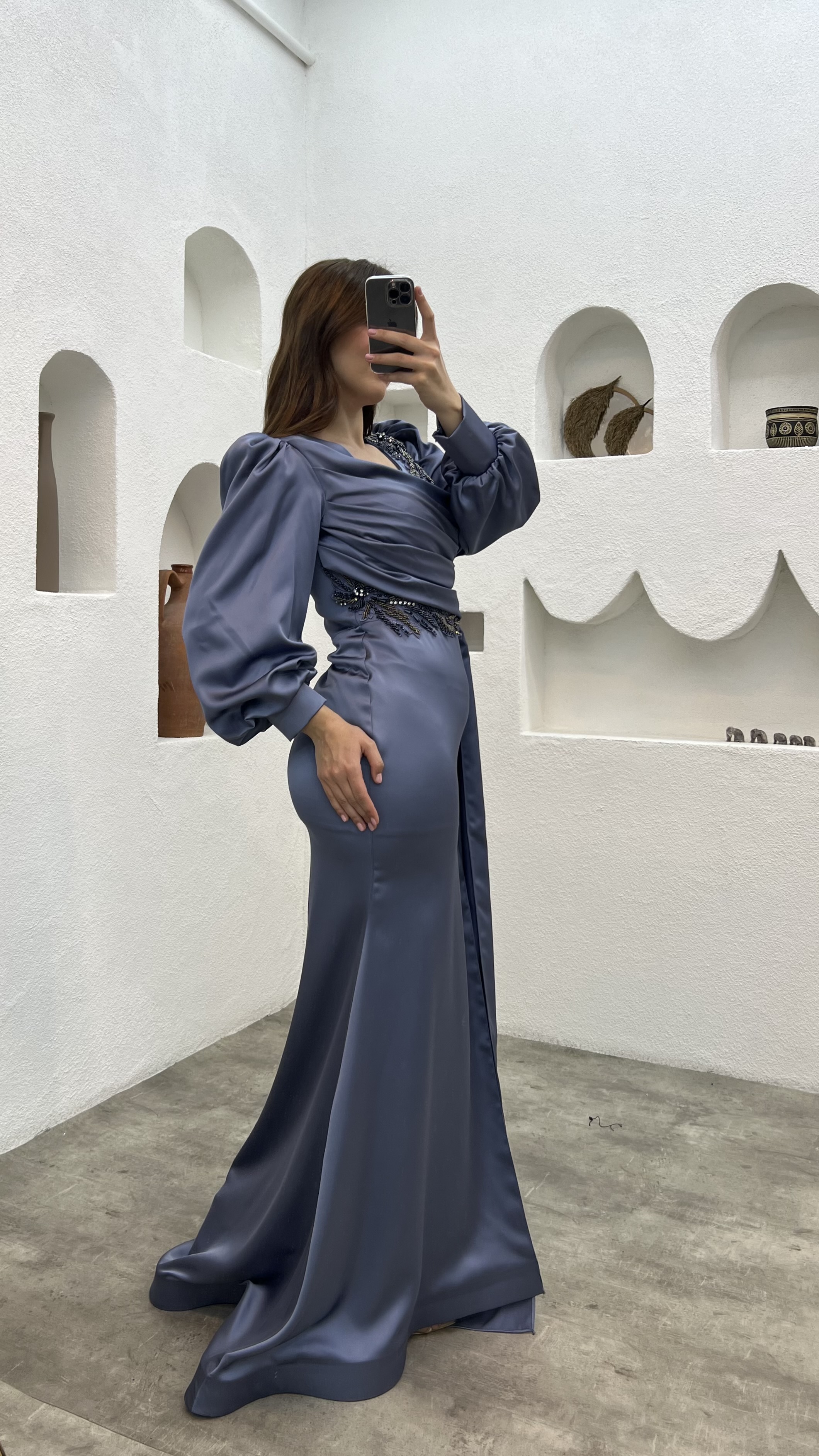 • İndigo Balon Kol Göğsü İşlemeli Büyük Beden Abiye Elbise