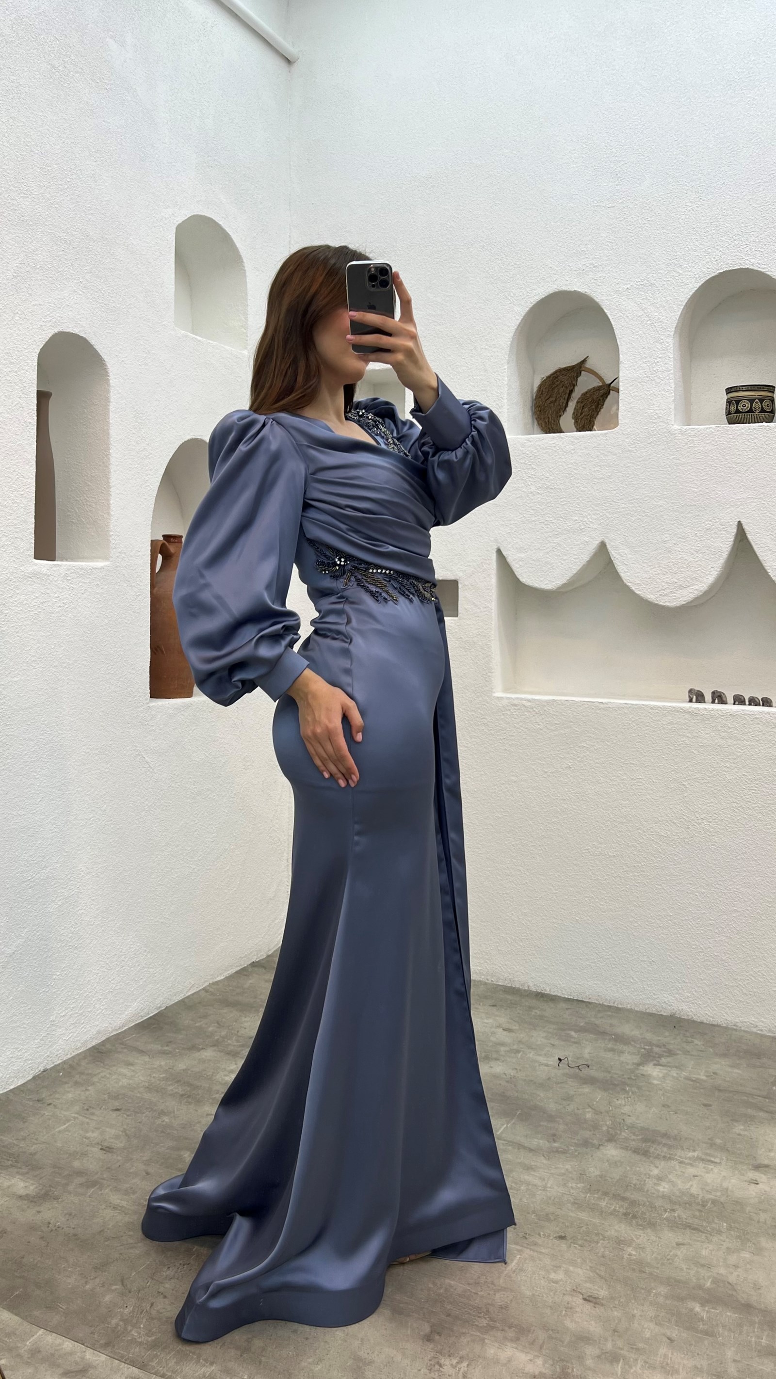 İndigo Balon Kol Göğsü İşlemeli Büyük Beden Abiye Elbise
