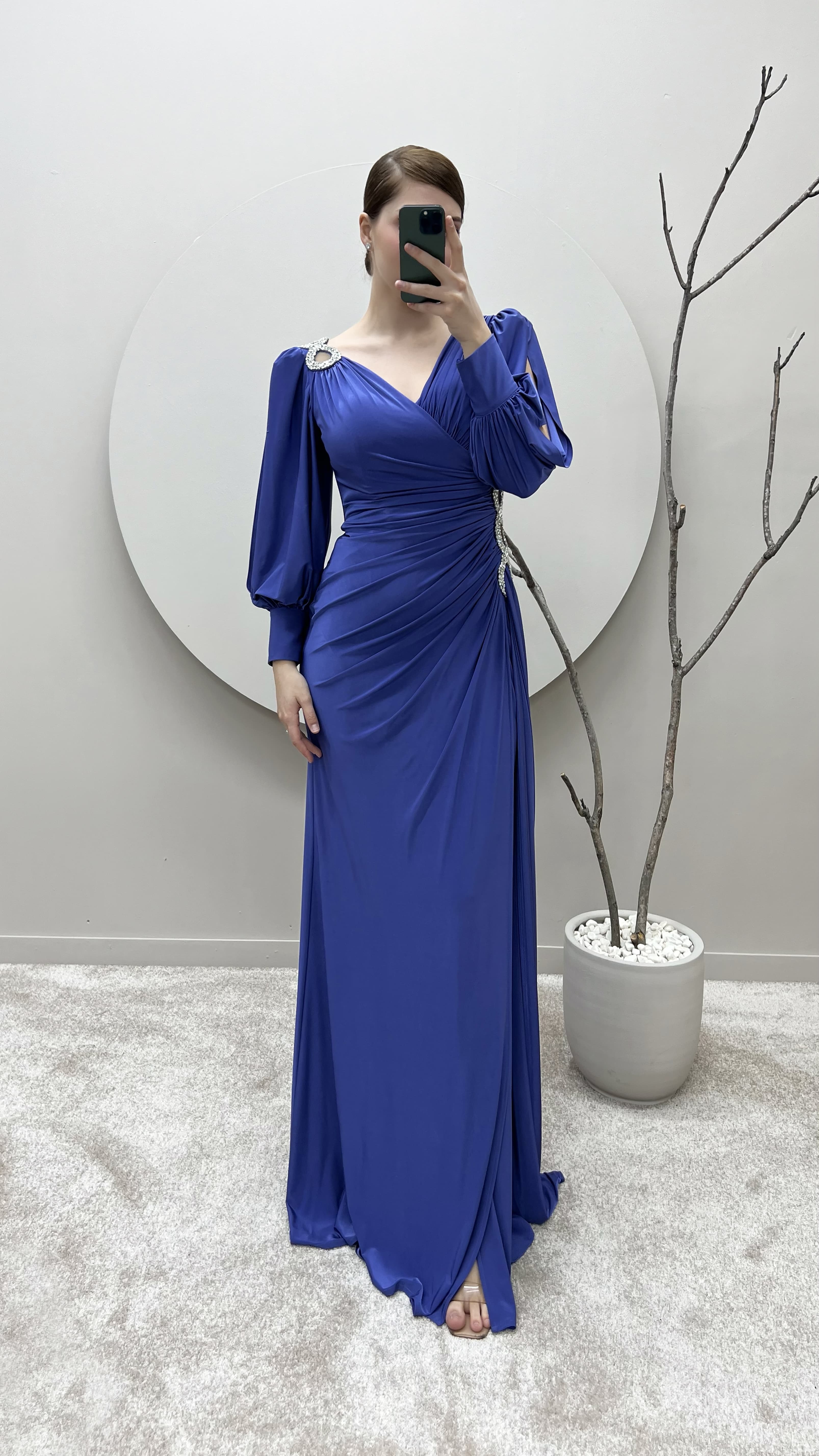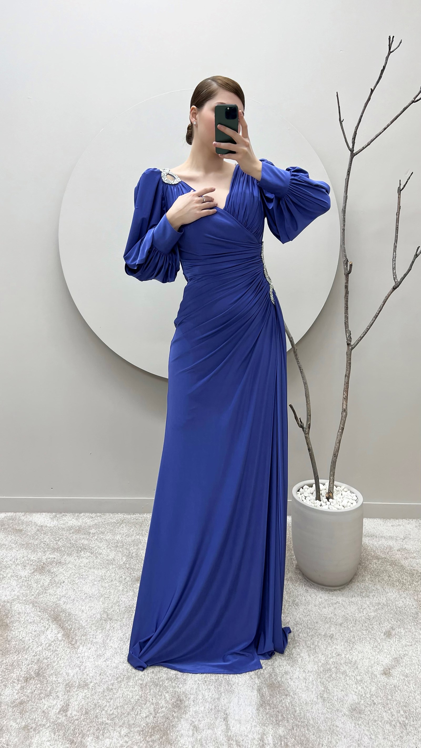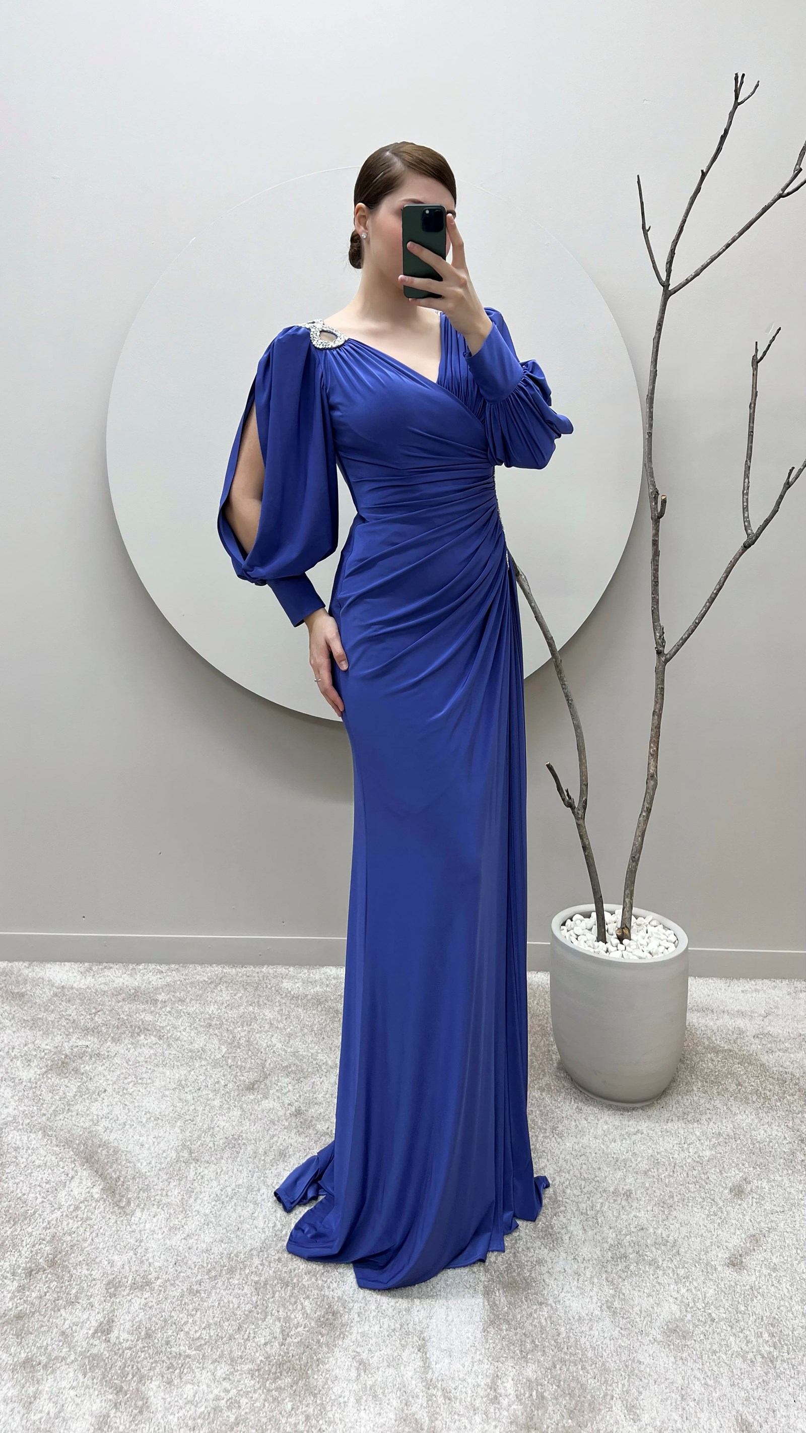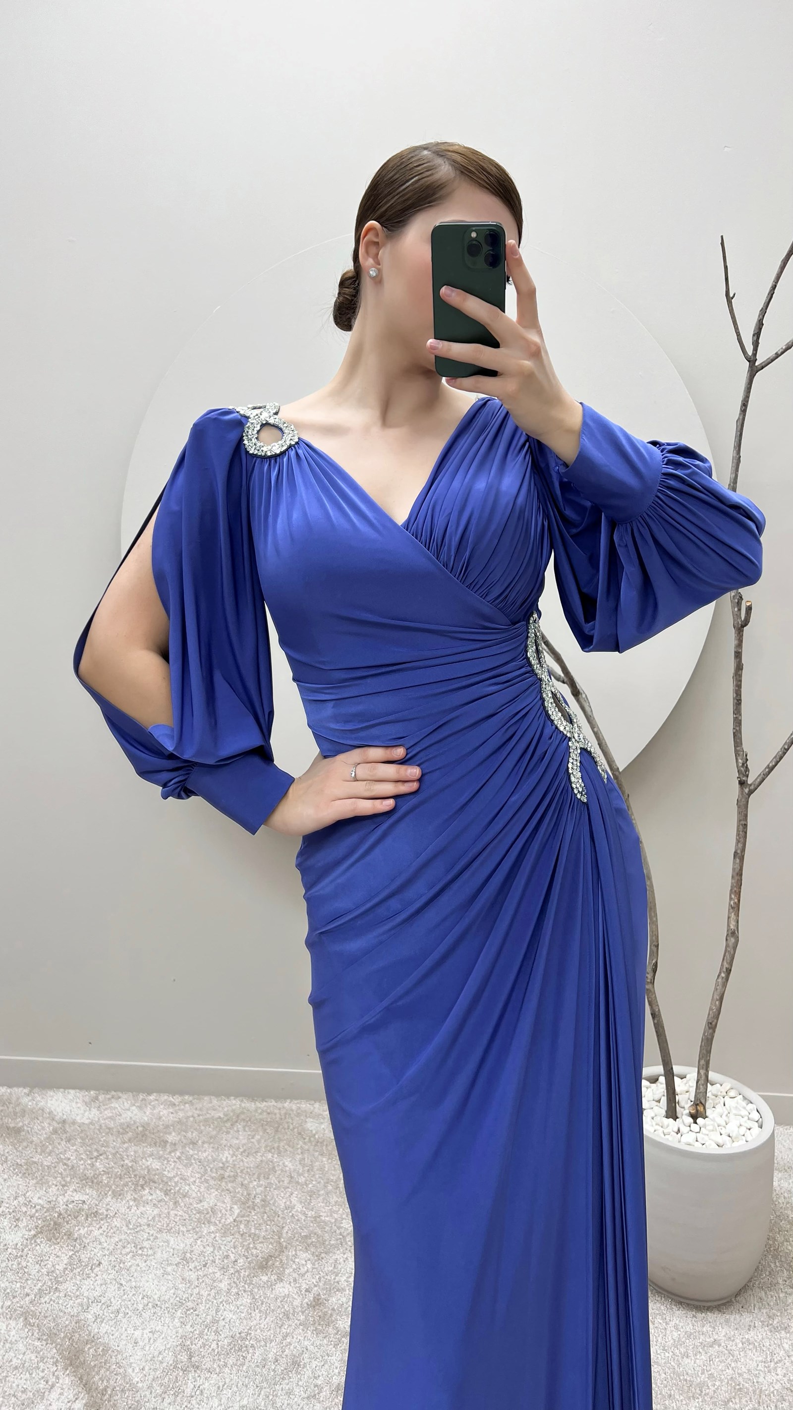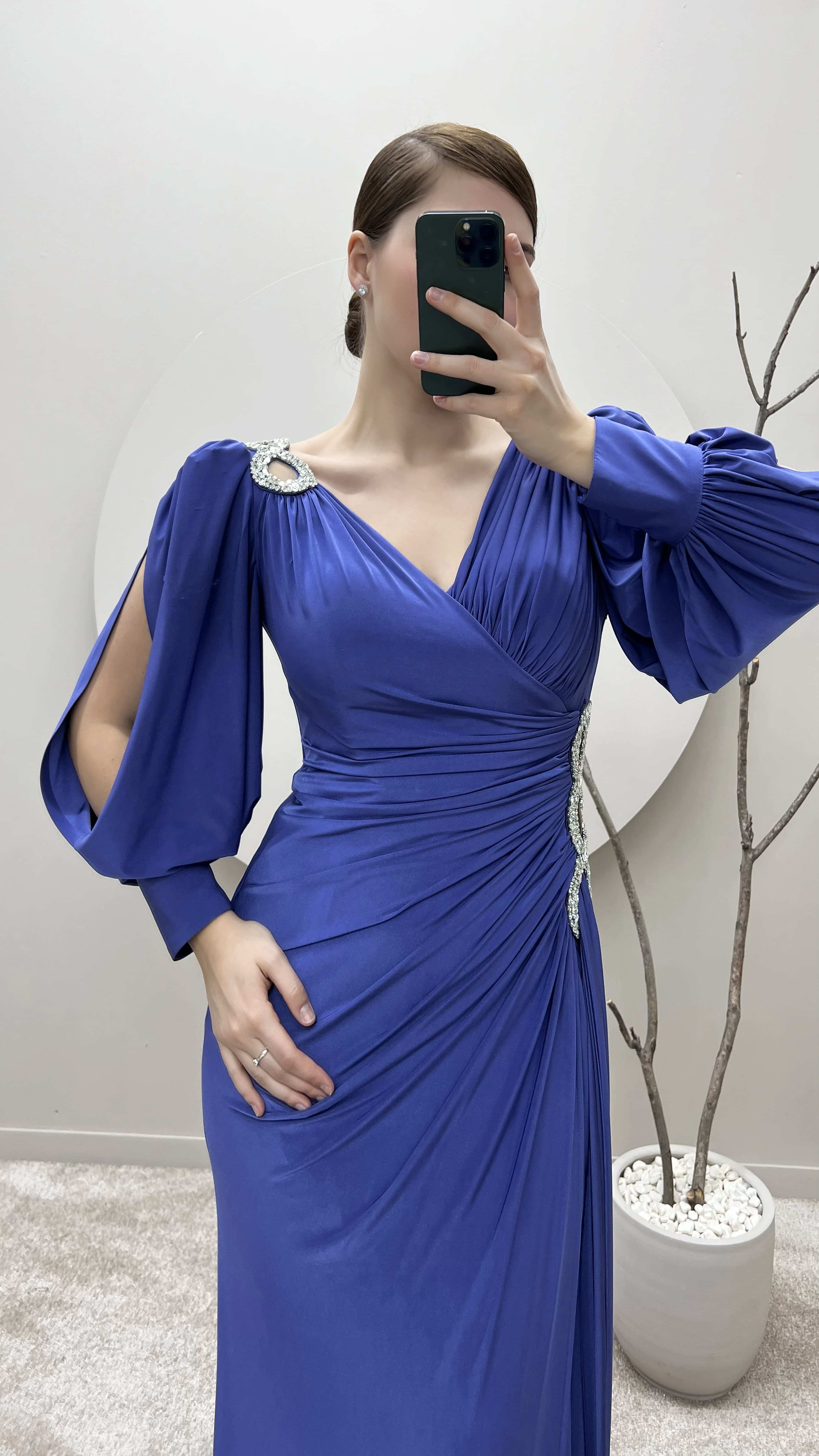 İndigo Balon Kol Kruvaze Yaka Beli Taşlı Tasarım Büyük Beden Saten Abiye Elbise