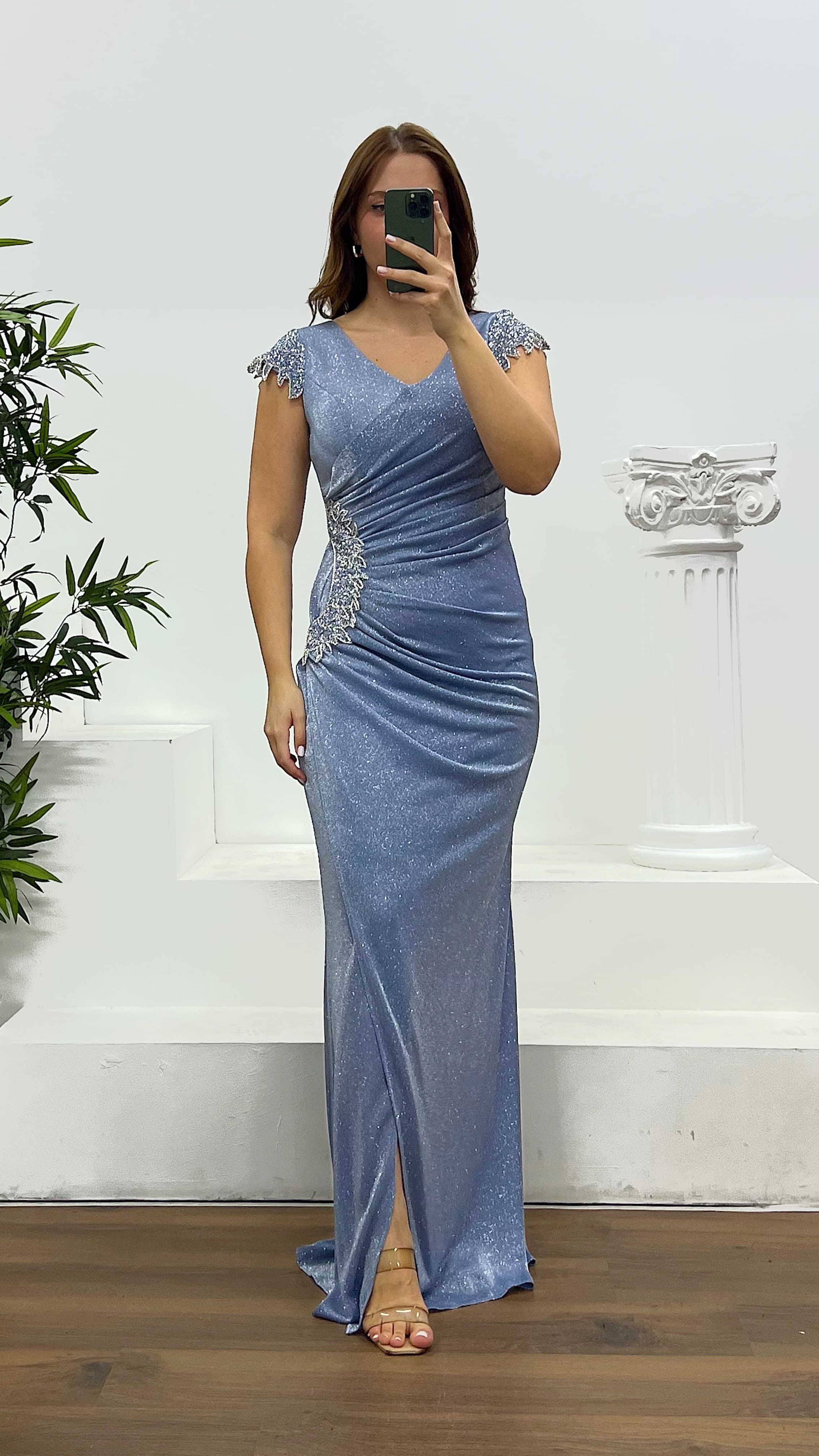 Ürün 44-48 bedene kadar uyumlu, göğüs pedli, astarlı, arka kapama fermuar, yırtmaçlı, bel detay abiye olarak tasarlanmıştır.